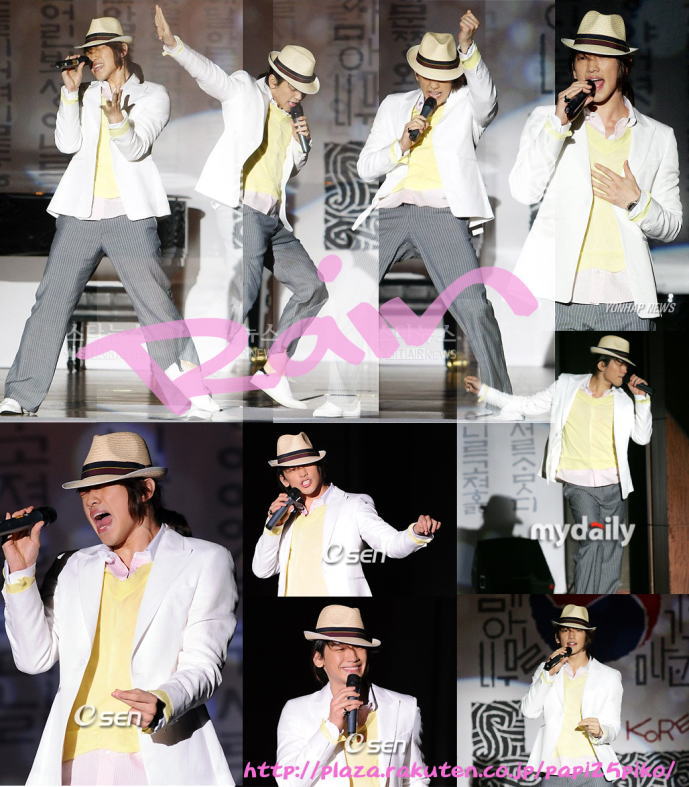 もうすぐ【テグ】始まるね お天気はどうなんだろうお留守番組は今日は何してたかな~私はお茶を飲みながら(オヌルン茶ならもっとよかったのに)KBSワールドで「2002年KBS歌謡大賞」を見てました。歌手Rain[ピ]は青少年部門の人気歌手賞をゲット名前呼ばれて すごく驚いた顔して 周りの人たちにうながされて前に出て行った姿はめっちゃかわいい賞をいただいてからも あちこちみなさんにご挨拶してる礼儀正しい姿がが印象的だったな~その前に 「マイケルジャクソンショー」というのがあり Rain[ピ]は「Billie Jean」を踊ったけど ひときわ際立ってて 私はまた胸がどきどき 今日のテグはWT再来って感じなんだよね。ここで 雰囲気だけでも味わいましょう聞こえるといいけど(中国サイト) 7:30PM現在。。。このぶちぶち切れて聞こえてるのそうなのかな?? わからないやお留守番仲間のみなさんへ私からのおすそわけ今日はアニメーション作りに挑戦して作ったのみんな載せちゃったから きっと目がちかちかするね。ここごめんなさい あ~ ジフニ サランへ~
