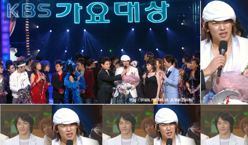 今では「歌謡祭」になってるのかなこれずっと見たかったんだ(KBS world はこちら) Rain[ピ]の涙は話題になってたけど 見る機会が無くて今日はほんとにこの放送楽しみにしてたのいきなりトップバッターだよ今年最高のスターといえる歌手です。 ドラマや歌謡界で認められ 圧倒的な人気を誇る歌手です その名は。。。ピ!!I's raining (歌についてはまた後日UPします)2002年 悪い男でデビュー 2003年 KBS最高歌手賞 。。。とテロップが 【2004 私たちの自画像】 のコーナーでお父さんの隣にいると超えられない大きな山のような気がしました。僕に酒を渡しながら この酒を飲み干したら酒を許す だから悪いことはするなって。。。。。とアブジについて語るジフニこのお話は「ピの秘密」にもたしか載ってたと思う。 しばらくRain[ピ]は出てこなくて、ちょっと暇な時間 【Special 4】 でやっと登場キュートな笑顔とステキなボディで歌謡界を圧巻しているピと仲間達ピのダンス テヤンのラップをNCモンが歌って。。。最後 仲間とダンス何を言ってるのかよくわかりませんでしたが 友情深いコンサートでした??。。。と なかなかおもしろいコメントしてくれてます そしてついに大賞。。。。大賞は。。。。 ピ!!【∀|】 トロフィーをもらう前にたくさん祝福してもらってるRain[ピ]∵‥∴☆:'*'★∵‥∴☆:'*'∵‥∴☆:'*'★∵‥∴☆:'*'∵‥∴☆:'*'感想は。。。Oh~ まず 3年前に天国にいった母に約束しました。 必ず大賞を。。。取ると約束したんです そしてその約束を叶えてくれたファンのみなさんに感謝します3年前 何も無かった僕を育ててくれたジニョンにいさんに感謝します涙とため息。。。それと 事務所のみなさん お父さん 妹。。。。etc (まだまだ言い足りなさそうだったけど) みなさんほんとうにありがとうございました今後もがんばります∵‥∴☆:'*'★∵‥∴☆:'*'∵‥∴☆:'*'★∵‥∴☆:'*'∵‥∴☆:'*'みなさんから 祝福されています ダンス仲間が涙を拭くタオルを持ってきてくれてた やっぱり仲間っていいね! ピの涙が美しく光った瞬間でした (もしや さっき「わからない」発言をしたMCの方?? これは ステキなコメントだ!)感謝したい人がどんなに多いことでしょうかこの後も 自分の事を言われているのに 客席に背中を向けて仲間のみんなにお礼をいってる。。。 そして ほんとにそこにいるみんなが 祝福してくれてた 何度もカムサハムニダって言ってたね一度置いたトロフィーをもう一度持ってキスしてた私も一緒に涙が出たよ永久保存版だなぁ。。。