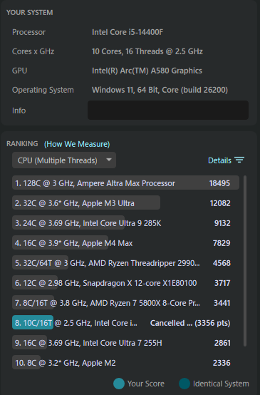以上の構成となります。OSは自分の持っていたwindows10のライセンスキーを使っている為含んで入ません。CPUクーラーは今回キャンペーンで当たった簡易水冷を使っていますが、実際はAK400等の3000円台の空冷で十分です。 CPUがやはり以前より上がってて・・・安くても2.5前後・・・2万切ってた時買うべきだったーorz ()内の中古金額としておよそです。実際は手持ちの為0円ですが・・・ OS抜きで約8.3万(3000円の空冷を使用したとして) ![]() TRYXのソフトウェアめっちゃ分かりやすい!構成表作らんでもいいやんwww ![]() ![]() もうCB R23回しても特に今更感しかないけど・・・w ここは参考程度で・・・ ![]() ![]() モンハンですが、上がアップスケーリングをIntel XeSS 下が、高設定(フレーム生成ON)のまま(AMD FSR ON) FSRだとフレームレートが上がるけどスコアは落ちる Intel XeSSだと・・スコアは良いけどフレームレートがオチオチ💦 実際ゲームするなら中設定でフレームレートを出す感じかな でもIntel Arcの初期A580でもこれだけゲームが出来そうなら問題無し! ![]() FF15~標準設定スコアは良いけど・・・FPSはモンハン同様ギリギリって感じだったな・・・ 所々処理落ちしてる感じでカクッ!てコマ落ちする時があった。 FF14もしたのですが、スクショなかった・・・(;'∀') って事で情報だけ・・・ 『最高品質』『仮想フルスクリーン(1920×1080)』『FSR ON』 平均FPS87/最低FPS 35 スコア 12262 評価 とても快適 FF14は問題無さそうですね! 以上のベンチ結果かからA580意外と頑張るやん! i5位までならボトルネックもおき難くいためちょうどいい感じのゲーミングPCになりましたね。 DDR5が高い今手持ちのDDR4や中古を狙ってちょうどいい感じのPCを自作してみてね! 追伸:本日(R8/2/10)を持ちましてJAPANNEXTアンバサダーへ復帰する事になりました! これからもよろしくお願いします。 『次回 TVのモニター!?』をお送りいたします。(これは買った奴だぜ!) お気に入りの記事を「いいね!」で応援しよう