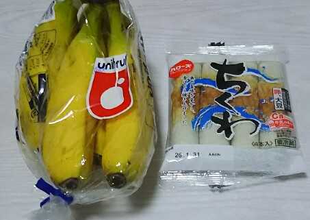 朝ごはん 今週1日目(週の始まりは日曜日に設定しています。) ハローズのちくわ(1包4本入り。約108Kcal、製造はマルハニチロ)とフィリピン産バナナ1本(約90kcal)です。