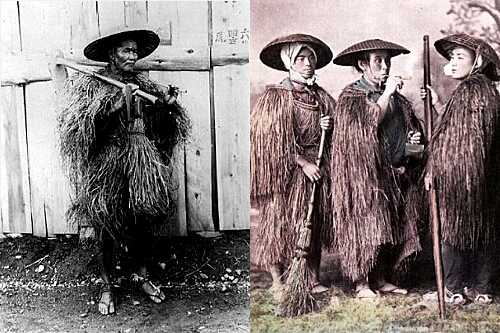 主演は中村敦夫、監督は市川崑の「木枯し紋次郎」です。 この作品で主人公 紋次郎の決め台詞「あっしにはかかわりのないことでござんす」はいちやく流行語として日本中に認知されましたね。 ![]() ![]() 時代劇でお馴染みの渡世人の衣装です。 縞の合羽は道中合羽と呼ばれ、江戸時代に旅人が雨具や防寒具として使った袖のないマントのことで、ポルトガル語の「Capa(カパ)」が語源の南蛮渡来の衣装なんですな。 表は縞模様の木綿、裏には防水用の油紙(桐油紙)や渋紙を入れ、寒さや雨を防ぐだけでなく、畳んで懐に入れられたり座布団代わりにもなる旅の必需品でした。 ![]() スタジオジブリ制作のアニメーション映画「もののけ姫」で、主人公の蝦夷の国の民アシタカヒコが羽織ってるマント状のものは? ![]() 稲わらなど植物を編んで作られた伝統的雨具の一種です。 他にイラクサや麻と云った草類の皮、シナノキやフジ、ヤマブドウの樹皮など、地域ごとに材料や形状は異なり、海岸部では海藻も使われました。 ![]() ![]() しかし日本では、この蓑と云う藁を使ったレインコートを使ってたんですね。 稲わらのようなある程度撥水性のある繊維に雨粒がかかった場合、繊維に沿って水が流れていき、内部には滲みません。 これが蓑の原理で、また藁の断面が中空構造でしかも多重になっているため保温にも優れています。 代わりにかさばり、動きにくく、また火に非常に弱い欠点もありますね。 ![]() これは気候風土から来るものです。 雨が降ると湿度が上昇し、蒸し暑くなる土地では通気性を考えなくてはならない。 そう云ったイミで蓑は非常に気候にあったレインコートだったのですね。 ![]() この鳥追い祭の夜の少女が、なんとも雪深い土地の気候風土をよく表してるのですね。 ![]() 「日本軍兵士の用いる狙撃兵用偽装服(カモフラージュスーツ)」と解説がつけられている。 これは、日本兵が雨具として使用していた蓑を、外観から草木に紛れて偽装するための特殊装備であると、捕獲したアメリカ軍が誤解したことによるものなんですね。 そう云われてみれば、蓑ってカモフラージュにうってつけですね。 ![]() 日本では、太平洋戦争後も、道路作業員に蓑を支給してました。 ところが、外国人に蓑をかぶった恰好を笑われて、政府はゴム製レインコートの支給に切り替えてしまったのですね。 これが大失敗! 蒸し暑くて、集中力が途絶え、仕事が続かない。 まったくはかどらない事態の続出となったんです。 レインコートを着たまま仕事をするには、蓑の通気性は必要不可欠だったのですね。 ![]() ![]() お気に入りの記事を「いいね!」で応援しよう