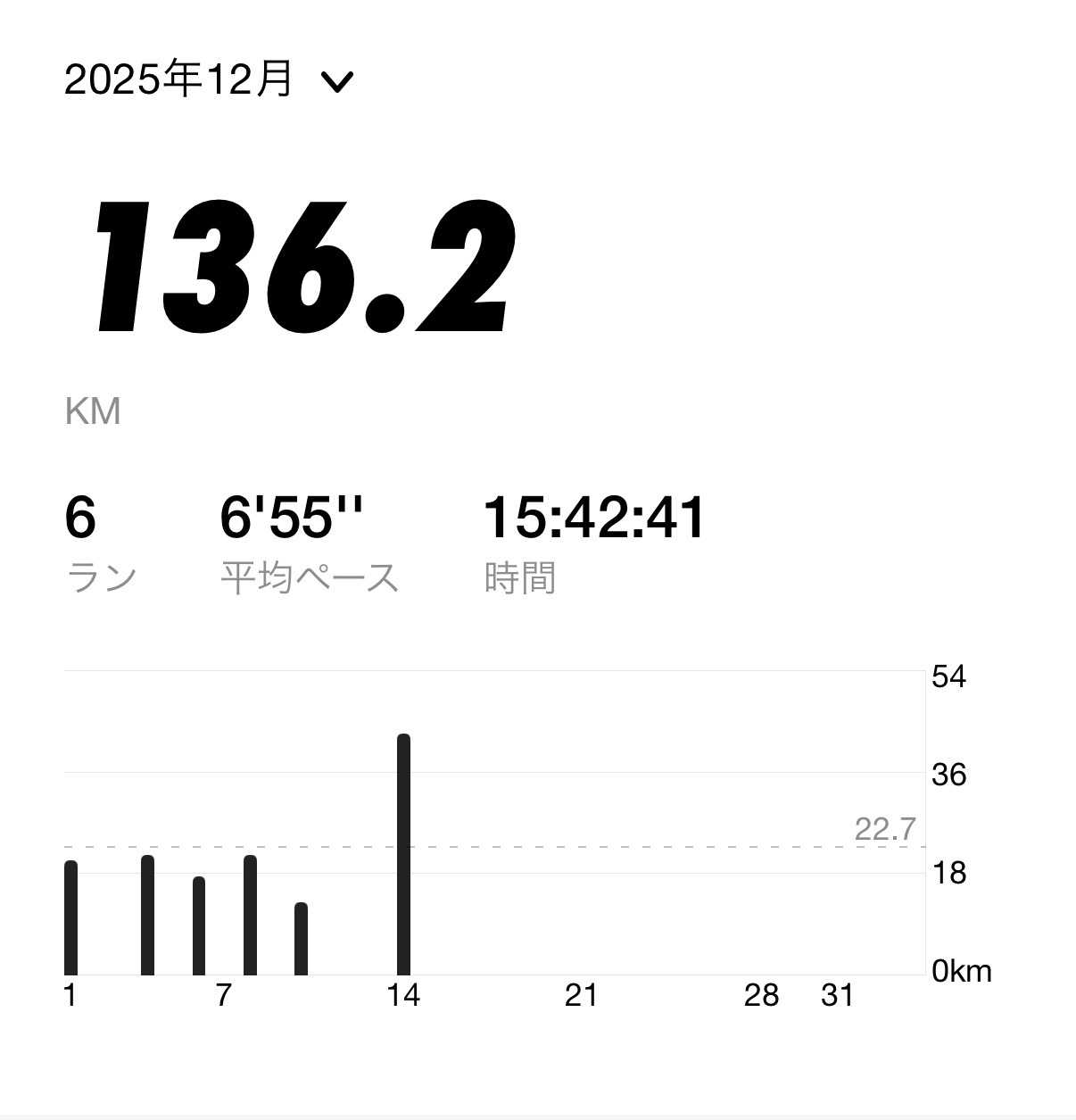 また新しい年が始まってしまいました。僕は1月が誕生日なので、年が明けてからすぐ歳をとってしまうんです。 ま、こればかりはどうしようもないことなので、粛々と受け入れるしかありません。レベルが上がると思って受け入れましょう。つぎはレベル68です。 新しい年とは言え、昨日の今日、毎日は連続しているだけ。既に『年賀状じまい』をしているものの、まだ何枚かは届きます。2枚ほど葉書を書いて、残りの数人にはメールでの年賀状。 さて、昨日で12月が終わったのでその記録。 ![]() 12月14日の奈良マラソン42kmを含めて136km。 奈良で右膝を痛めてからは全く走れていません。 関節痛は治るのに時間がかかります。かなり良くはなってきましたが、朝とかはまだ痛いし、床に落ちているモノを拾う時には痛いし。。。 だけど、そろそろリハビリしなければいけないと思って、昨日夕方、時間があったので、ウォーキングしてみました。 5km、1時間ほどでした。ウォーキングなら、この程度の距離は大丈夫かなぁ…とは感じたのですが、今朝起きた時はちょっと痛かったです。ぼちぼちリハビリしていきます。 さて、謹賀新年、今年もよろしくお願いします🙇