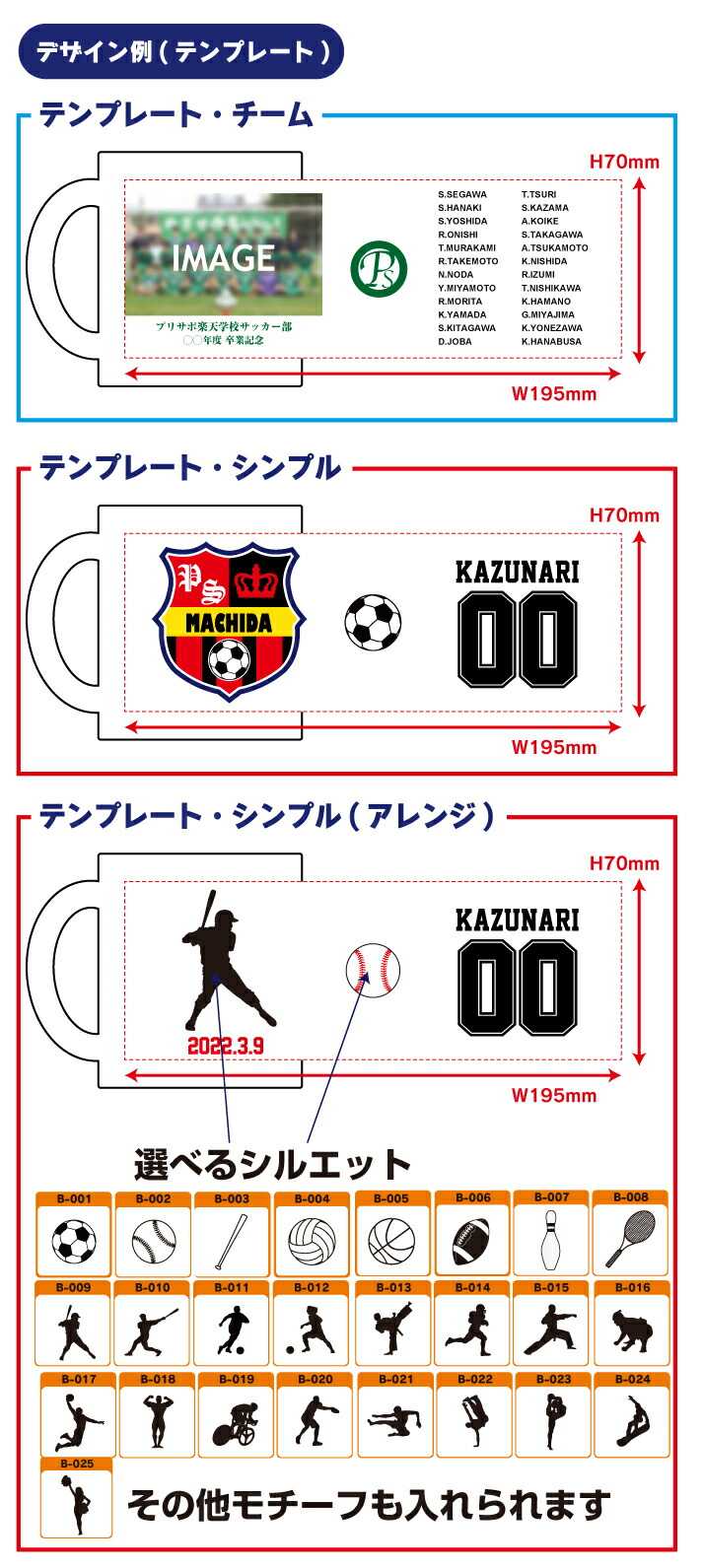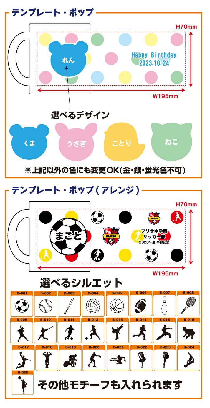 プリントサポート楽天市場店です 寒くなってきました 冬が始まりましたね クリスマス、年末年始のイベント… この時期は楽しみが多いですね 体調にはお気をつけくださいませ さて、本日は 先週、発売開始いたしました こちらの商品のご紹介です ![]() & オリジナルサッカーボール付き マグカップ ついに 先週(前回の記事)ではマグカップの オススメポイントをご紹介いたしましたので 本日はマグカップのオススメポイントの 「個別名入れOK!」と 「写真・イラスト(ロゴやエンブレム)プリント可能!」を さらに深掘りしてまいります マグカップを作りたいけど 「デザインが思いつかない… 「デザインするのが面倒だから諦めよう… そんなお客様にオススメ お写真やイラストや名入れ内容を メールで送るだけで作れるように デザインテンプレート をご用意いたしました バリエーションが豊富なので お客様の「お気に入り」のデザインがきっと 見つかると思います ぜひ、お気に入りのデザインを見つけてくださいね ![]() ![]() 上記のデザインは下記のフォントもお選びいただけます ![]() ![]() ここからはユニフォームグッズではなく 「敬老の日」や「母の日」や「お誕生日」などに オススメのデザインです ![]() ![]() お気に入りのデザインはございましたか 私は最近、マグカップで 趣味の紅茶を淹れているので 個人的には「テンプレート・エレガント」が 好きです ちなみに テンプレートを使わずに 完全オリジナルでの作成もOK ラフデザインをお送りいただければ 当店のデザイナーがラフデザインを参考に デザインをいたします
