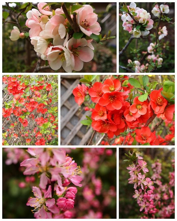 上から、ボケ、ボケ、庭梅。