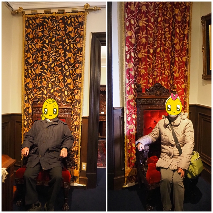 ここは、彫刻のコレクションが。 サタンの椅子も有名。 座ると願いが叶う、幸運の椅子だって。 右が女性、左が男性で、 背後の布の色が違います。 もちろん、座ってきました。