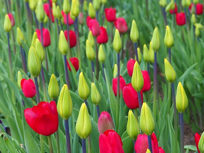 わざと遅らせて植えた? 緑の蕾と赤の組合せも素敵♪