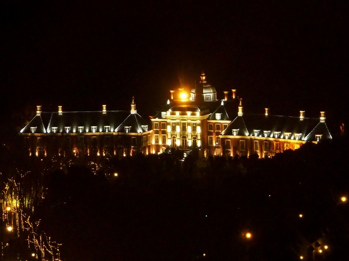 上から夜景を見下ろし、 オランダ宮殿を遠望する。