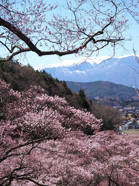 城は高台にあるので、桜越しに、 雪の残る中央アルプスの山々が見えます。