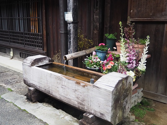 馬籠宿の特徴は、石畳と坂ですね。 石畳の坂道の両側に、 水路があり、家が立ち並んでいます。 道に沿って、低木や花も多い。