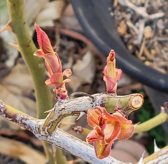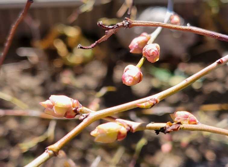 俳句でも多く詠まれている。 芽吹きといえば、我が家の庭で早いのはベニカナメモチ(レッドロビン)。 先ず茎が伸びて、その先端でもう深紅の葉の展開が始まっている。 ![]() 次は薔薇。 剪定した枝のそこかしこに新芽が成長している。 低い位置まで刈り込んだので、枝を見下ろす形になった。 ![]() そしてシャリンバイ。 ベニカナメモチと薔薇はいずれもバラ科。 シャリンバイもバラ科。 いずれ車輪状に花が咲くのだが、こちらは花芽が膨らんでいる。 ![]() 最後はブルーベリー。 ブルーベリーはツツジ科だ。 小さな花芽と葉の芽が膨らみつつある。 画像では枯れ枝も写っているが、これは後で処理をすることになる。