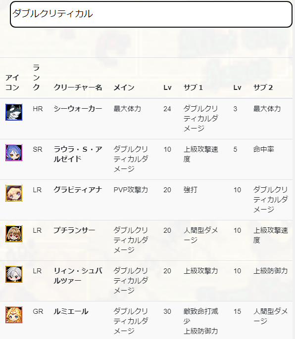 今回はクリーチャー編です。 とりあえず、今の最優先事項としてクリーチャー強化に取り組んでいこうと思っています。 ◯現在のクリーチャーセット 第4形態 詳細はこちら「クリーチャー変遷」を御覧ください。 ![]() ![]() 火強化 Lv50 ダブクリダメ Lv50 敵致命打減少 Lv50 魔法致命打 Lv39 物理メインの魔法攻撃ハイブリッドとしては良い感じのセットになっていると思います。 ◯最重点取組事項 メインのワンインオールのパッシブを全て最大にし、超越する。 ![]() 成功確率5%と、必要な素材の量で大苦戦しています。20回やれば1回は成功するはずですが、多分もう20回位は失敗しているはず。現在は下の画像のように、青、赤の強化石をクリーチャー冒険で最優先に集めています。これまでは1回分が揃ったらすぐに強化に挑戦していましたが、次は10回分貯めてから挑戦します。赤×100個、青200個集める必要あり。長い戦いになりそう。 ![]() ◯ワンインオールを超越Lv3にし、クリーチャーセット第5形態をめざす。 LRを超越Lv3にすると、メインパッシブの補正が+7、サブパッシブのが+5されます。これで、ワンインオール1体で、魔法致命打Lv47、敵致命打減少Lv50にできます(パッシブ変換でW致命打減にしています)。 ![]() そうすると、致命打減+ダブクリダメをセットしているサブクリーチャーの致命打減少が必要なくなります。そこで、このクリーチャーに入れ替えます。 ![]() 魔法致命打をそのまま残し、もう一つをダブクリダメージにし、覚醒でLRにすると下記セット効果が達成できます。 火強化 Lv50 ダブクリダメ Lv50 敵致命打減少 Lv50 魔法致命打 Lv50 これで、現在と比べて、魔法致命打+5%、魔法ダメージ+20%となります。 マキュリアのパッシブ変換は楽ですが、ワンインオールの超越Lv3がどれだけ大変かはやってみないとわからないですね。そもそもパッシブ変換してても超越できるのかな??ちょっと心配。 ◯さらに第6形態を目指す まだまだ妄想段階ですが、第6形態も考えています。 火強化 Lv50 ダブクリダメ Lv50 敵致命打減少 Lv50 魔法致命打 Lv50 上級火強化 Lv36 ← 第5形態にこれを追加 その方法。 (1)LRクリーチャーのサブパッシブをダブクリ×2にし、超越Lv3にする。これで1体でダブクリLv50達成し、ダブクリ×2のシーウォーカーと入れ替え。 (2)SRクリーチャーのサブパッシブに上級火強化×2を付けLRに覚醒。これで上級火強化Lv36。 これによって、第5形態からさらに上乗せできる効果。 火属性ダメージ 53% 火抵抗低下 8% 魔法致命打 4% 素晴らしい上乗せ効果。 赤石の民衆様より、パッシブにダブルクリティカルダメージを持っているクリーチャー検索 ![]() グラビィティアナがいますね。これをALL選択コクーンで出して、死ぬほどマナを貯めてパッシブ変換すれば出来なくもないと思います。50万マナ位貯めれば行けるかな?(遠い目) という事で、妄想も含めた今後の育成予定でした。 番外編。私のクリーチャーカバン1紹介。 2列目見て、「こいつやってんな」と思われたと思います。そうです、図鑑登録でステを稼げるLRクリーチャーをALL選択コクーンで全て出し登録済みです。自力で出したのはクレティオンだけです ![]() それと、今やっているコクーンロトの1万円のやつを買いました。大したものは出ませんでした。SR確定コクーンが8個出たので、覚醒時の材料になるのは良かったかな。やはり、ロトは3万円のを買わないと良いのは中々でないですね。 ![]() お気に入りの記事を「いいね!」で応援しよう