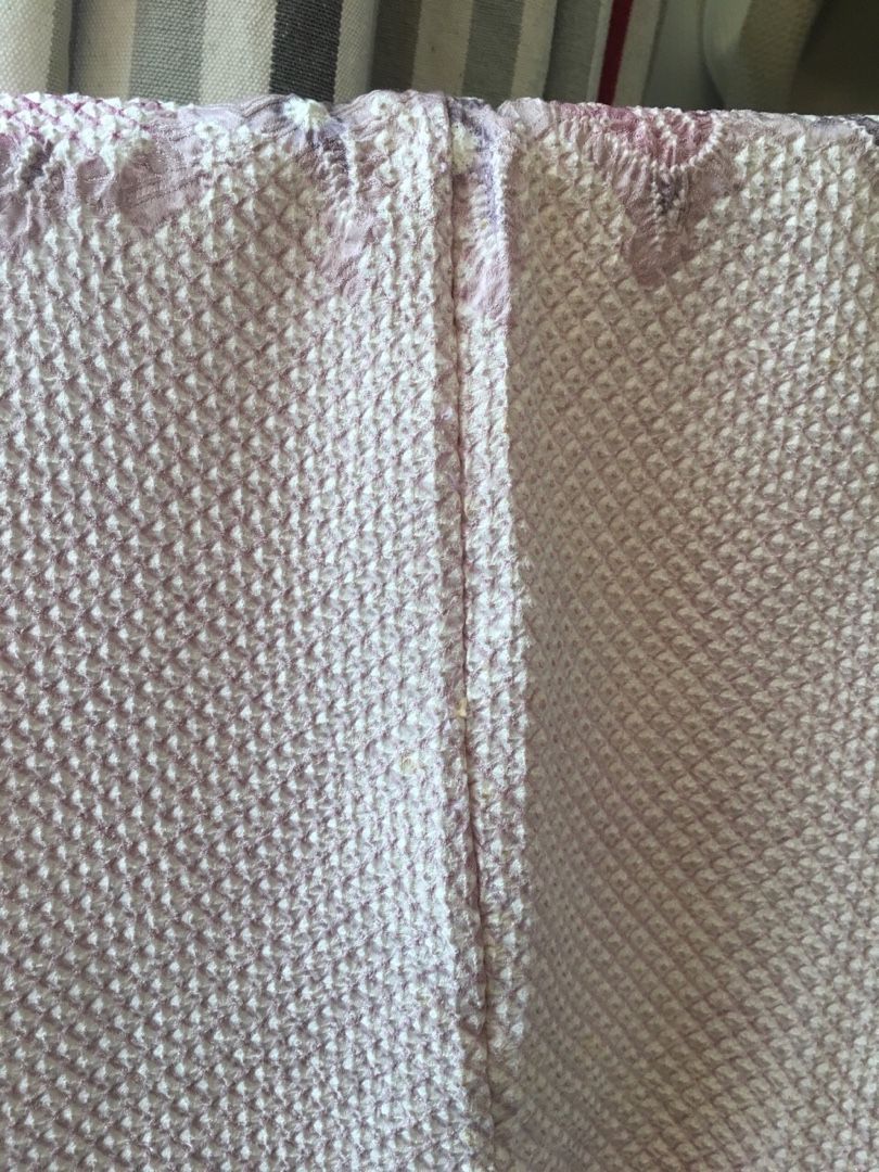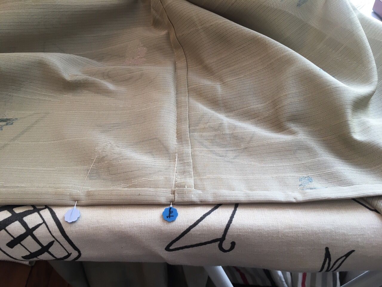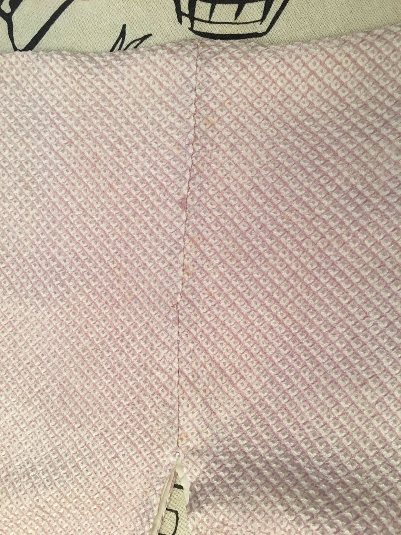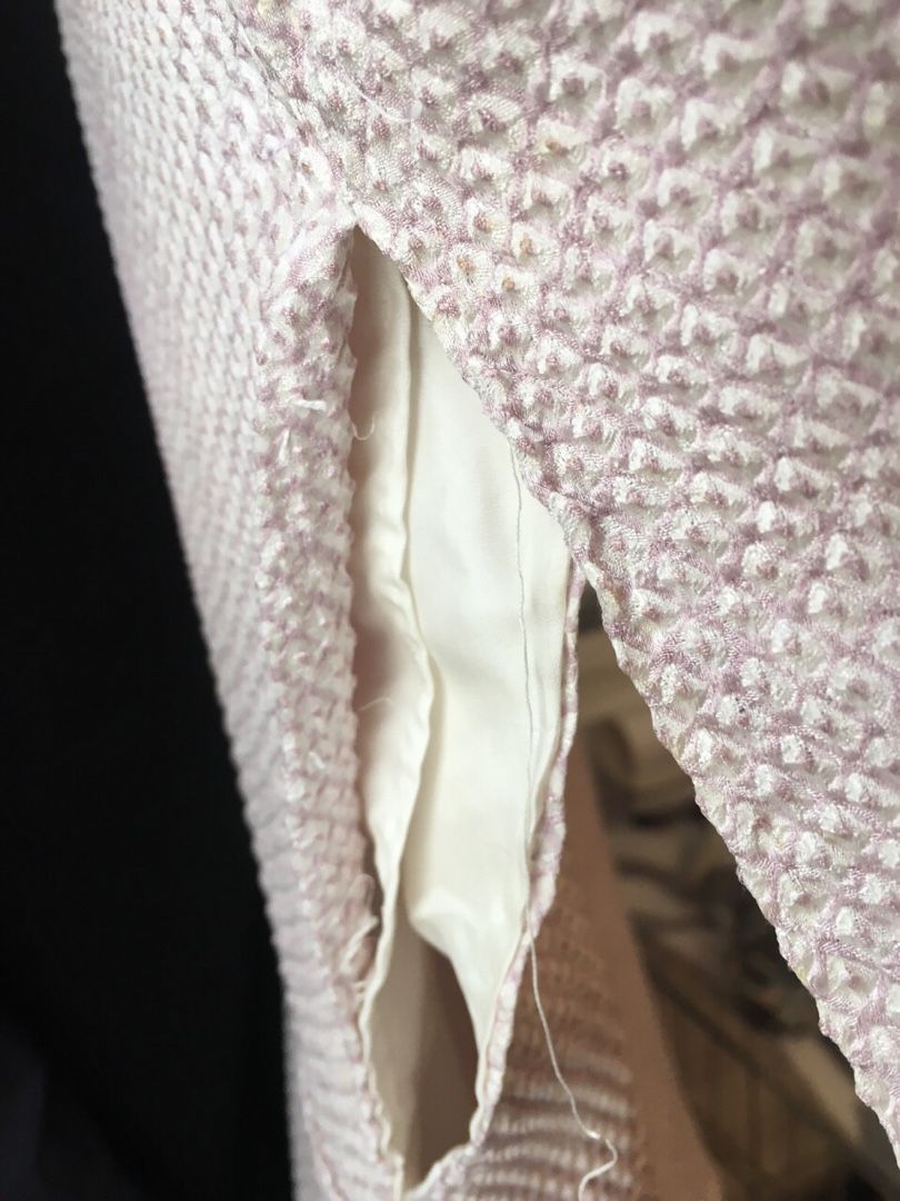 和裁の備忘録として追加しました! ーーーーーーーーーーーーーーーーーーーーーーーーーーーーーーーー 3月のロックダウン前に賜りましたお直し3点の詳細。 青地の唐草と小花模様の小紋。 裾部分が摩耗して擦り切れていますね。 裾フキ修正依頼です。 本来なら天地替えするのでしょうが、簡単に、というリクエストだったので・・・ 裾をずらすだけにしました。 穴があっては縫いにくいのでまず摺り切れとほつれに沿って極薄接着芯を貼りました。 ![]() ほつれ部分に縫い目が来ない程度にフキを上げる。 丁度1センチくらいでした。 ![]() 表地の身頃と裏地の釣り合いを取ってみる。 裏を1センチ短くしたので表地も短くなるハズですが、裏地は若干ゆとりをもたせている場合もあるので 引っ張って上手く釣り合いがとれるなら表地も1センチ短くしなくて済みます。 今回は引っ張っても裏地が長めに残ったので表地はそのまま、着丈も変わらずに済みました。 ✿✿✿✿✿✿✿✿✿✿✿✿✿✿✿✿✿✿✿✿✿✿✿✿✿✿✿✿✿✿✿✿✿✿✿✿ こちらは総絞りの薄ピング辻が花訪問着 裄出し依頼です。 チョー緊張して解きました。。。 ![]() 和裁の先生からダメ出しを受けた筋消し・・・。 だってこれ以上アイロンかけたら絞りが伸びちゃいそうで怖いんだもん ![]() 絹布を使って再度筋けしに挑戦 絹布アイテム優秀 こんなにキレイに折跡が消えました ![]() 工程は以下の通り。 袖付け部分の身頃側を1センチ出す。 筋消ししてキセをかける。 身八つ口を解き、裄出しに合わせ身八つ口縫止りまで成り行きで幅出しする。 胴裏も同様にして合わせる。 筋消しして全部を本ぐけする。 結局裄丈は1.5cmくらい伸びました。 ✿✿✿✿✿✿✿✿✿✿✿✿✿✿✿✿✿✿✿✿✿✿✿✿✿✿✿✿✿✿✿✿✿✿✿✿ お次は絽の単衣。 裾修繕依頼です。 かなり擦り切れてしまっていました。 1センチ裾を切り取りました。 擦り切れが残っているので極薄接着芯で補強します。 ![]() 裂けた部分に縫い目がいかないように三つ折りでくけ縫いする。 ![]() 端の三角を整える。 ![]() 裾を1cmカットするのは三つ折り部分に厚みが出てしまうのを避けるためです。 カットにより着丈が1cm短くなってしまいました。 厚みだったり裾の重さだったり和裁もこだわるところが多くて緊張しっぱなし・・・。 もうちょっと左右を合わせればよかったとか、見栄えに気を使って無理せず本ぐけで縫えばよかったとか トホホな結果なのでした お気に入りの記事を「いいね!」で応援しよう