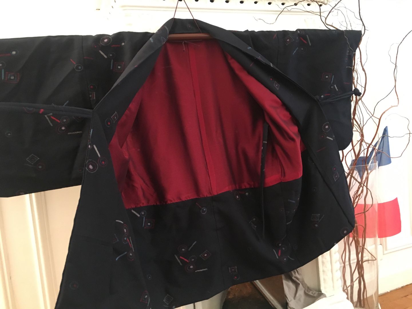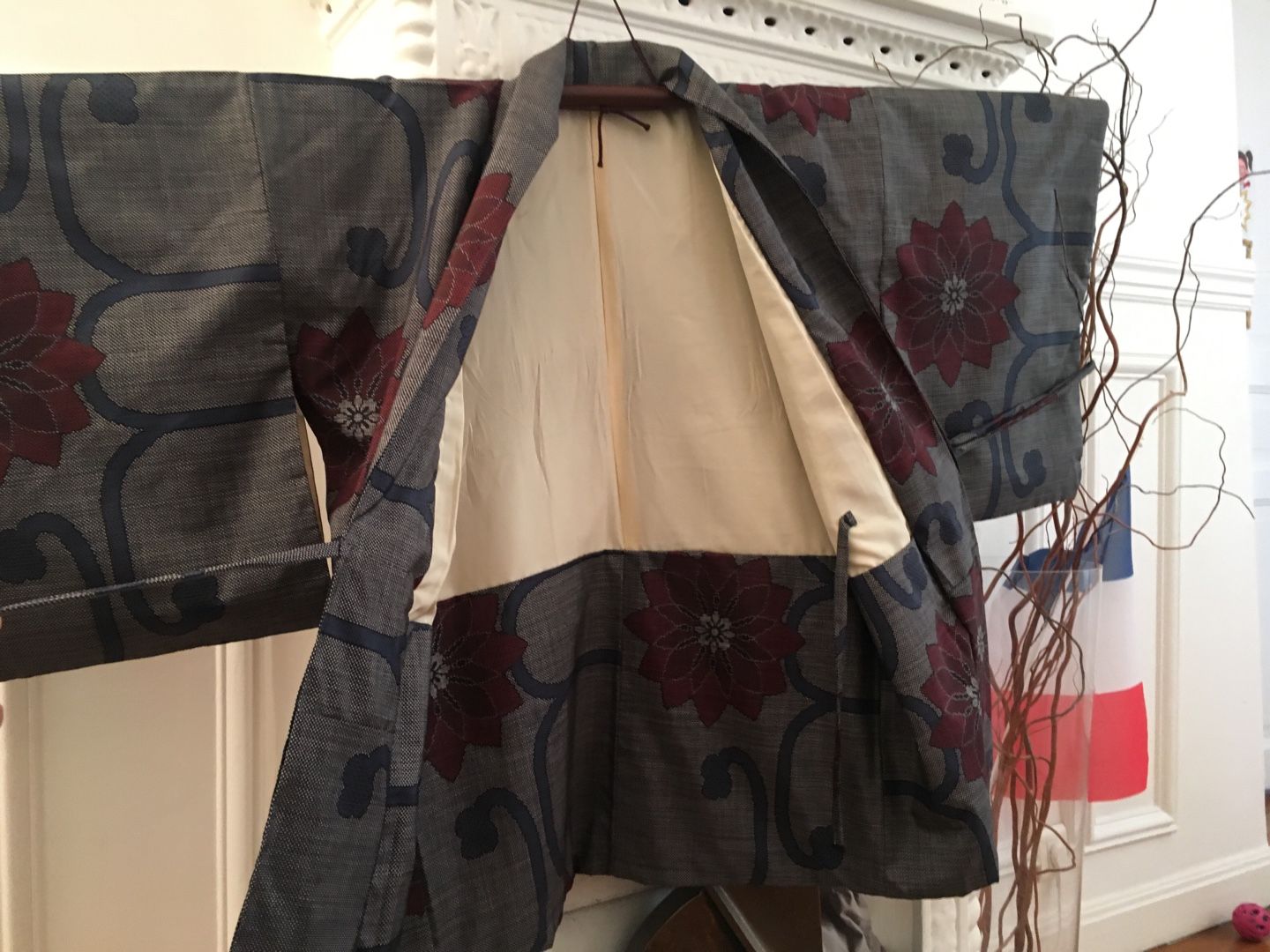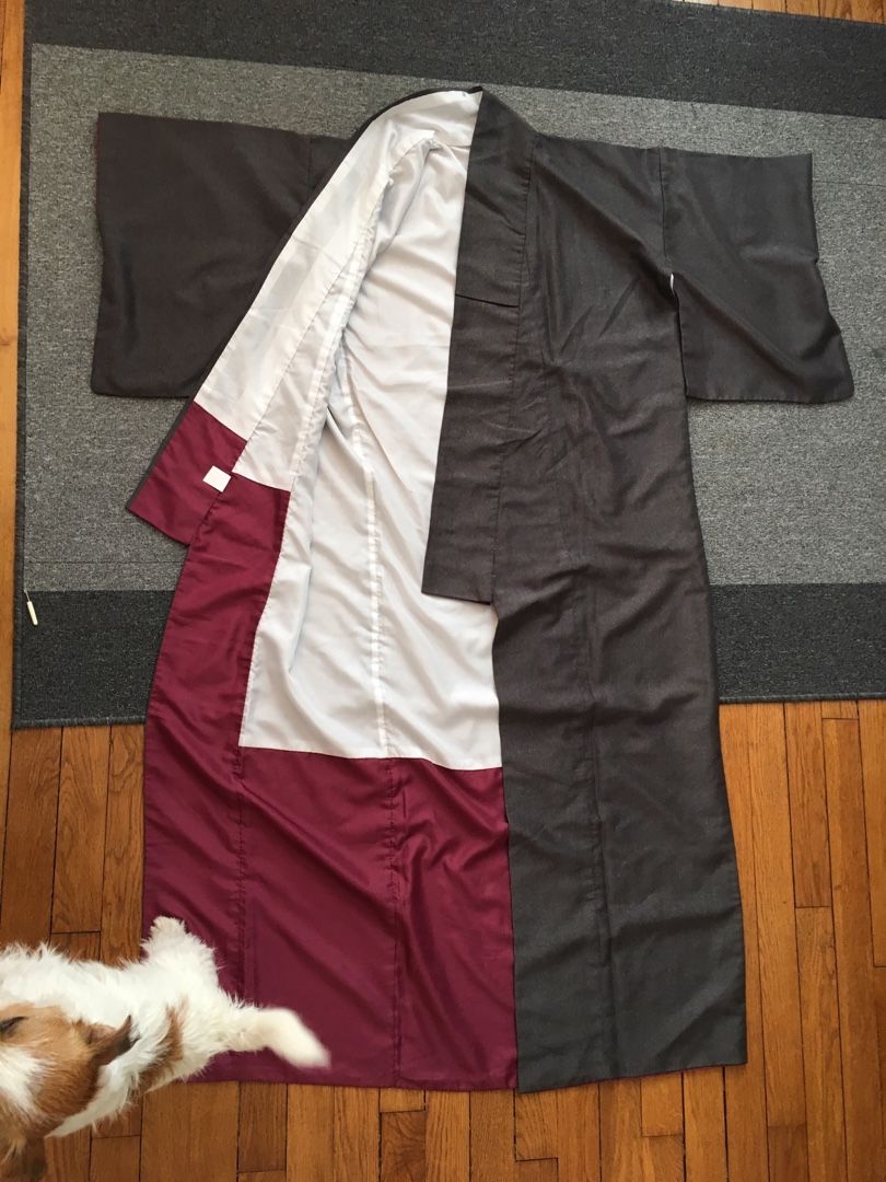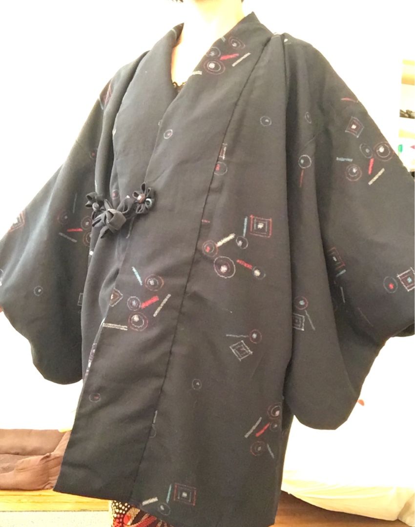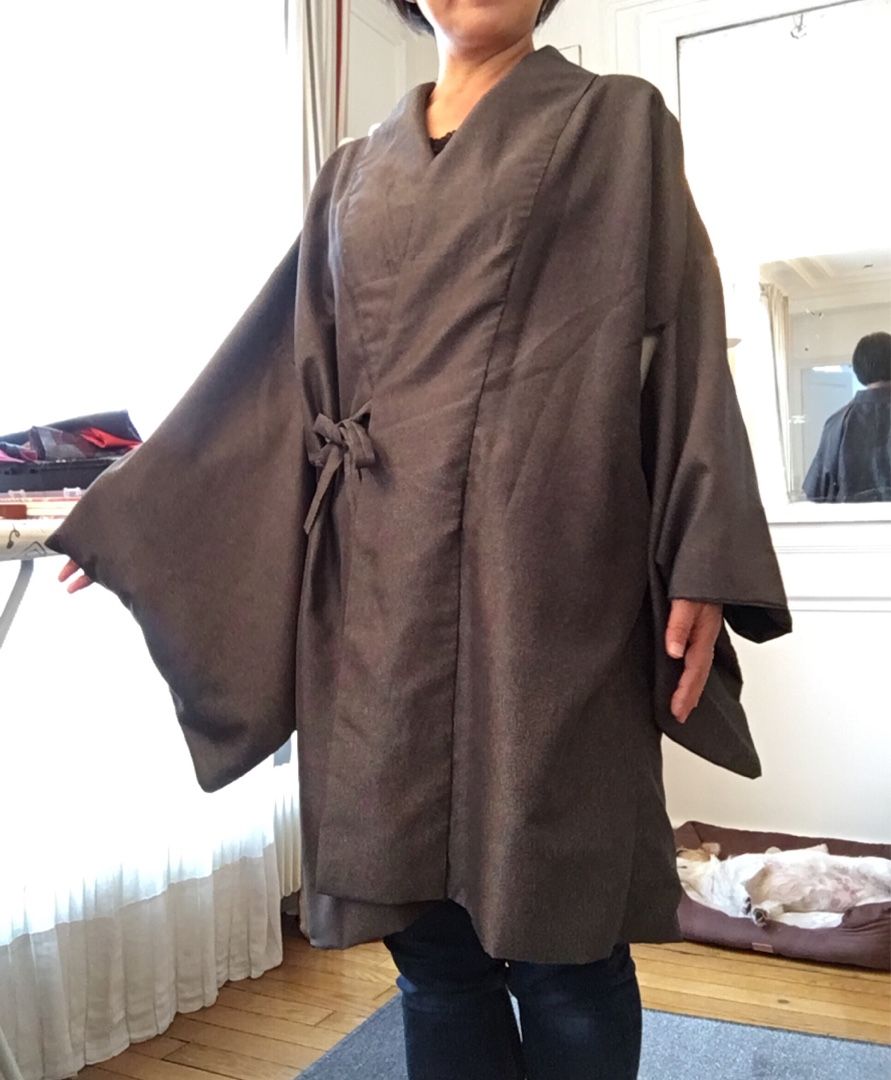 とにかく簡単に作れて簡単に羽織れるように頑張りました✨ すでに一着、和裁の先生が作られた物をお持ちだったので、それをお借りし見本にしました! まずは男性物の上着にリメイクする灰色の小紋。 鮫小紋よりも細かい地紋が入っています。 ![]() あんちゃん、ちょっとどいててね・・・ 袖、衿をそれぞれ外します。 共衿とおくみは不要になるのでこれも外します。 裾も解き八掛と胴裏のジョイント部分も解いておきます。 裏の八掛は不要になるので袖口も衿下も全て取り除きます。 衿は限界まで延ばしおくみ無しの本体に付けなおします。 この時の衿の限界の長さが身丈になります。 一般的な衿の長さは200センチ~220センチなので身丈は100~110が限界って事になりますね。 それ以上長くするには衿の長さが足りない。 衿を継ぐのはちょっと考えられないですもんね。。。 共衿のふりをして3枚で継いでしまうっていう手も有りかもしれませんが・・・ちょっとカッコ悪い 下部分の表地は折り返して八掛風にするのでその部分以外の長すぎる裾は切ってしまいます。 ![]() 袖フキも表地と同布で入れなおします。 わかりにくいですが、袖口部分です。 ここの部分は不要になった共衿を使いました。 衿裏は身頃と一体になっているため下部分が見えてしまうので、この部分も表地と共布にしました。 衿の裏地は不要になったおくみを繋いで使いました。 なるべく見える心配のない胸下あたりで繋ぐようにしてみました。 ![]() 最後は中と表に2本づつ、合計4本紐を作って腰の止め紐にしました。 これで完成。 男性物ということだったので限界まで長くしてみました。 ![]() 背後に奇妙な生き物が見えますが無視してください 2枚目は大き目な柄の大島紬でした。 作業に入る前に1枚撮っておくのを忘れた~ ![]() 胴裏がだいぶ劣化していたので本当は八掛を使って入れ替えたかったのですが どうしても袖の裏地までの布が足りなかったので断念しそのまま胴裏を使用・・・ 和裁の先生いわく、洋裁の場合は裏地に白は使わないそうで・・・ 今回は依頼者さんと相談の上、そのまま胴裏を利用させて頂きました。 ![]() 完成 少し短めという希望だったので見本より10センチ短くしました。 やっぱ大島は軽くてやわらかくて着心地抜群 ![]() 腰紐の留め部分はかぶせボタンとつまみ細工でお花を作りました ![]() 3枚目、最後のお着物は超難関。 単衣の紬だったのでーーーす ![]() 前の2枚と同じ工程ですが裏地がありません。 ポリエステルですが手持ちの洋服用の極薄裏地を使い、新規作成しました。 でも表地の素材とマッチしていないのでとっても縫い難いんですよ・・・(-_-;) ![]() もともと重さのある表地(ウールだったのかな?)なので裏地を使ったのは良かったかも。 ![]() あまり布が沢山出てしまった大島は手付き巾着も作ってみました。 ![]() 他のあまり布はあづま袋に。 ![]() この柄、意外と可愛い ![]() 製作期間は1日当たり2時間~4時間で1枚2週間弱。 3枚で6週間ほど頂きました。 そして無事、お届も完了しました! 川沿いの素敵な場所~ やっぱ郊外って良いわぁ
