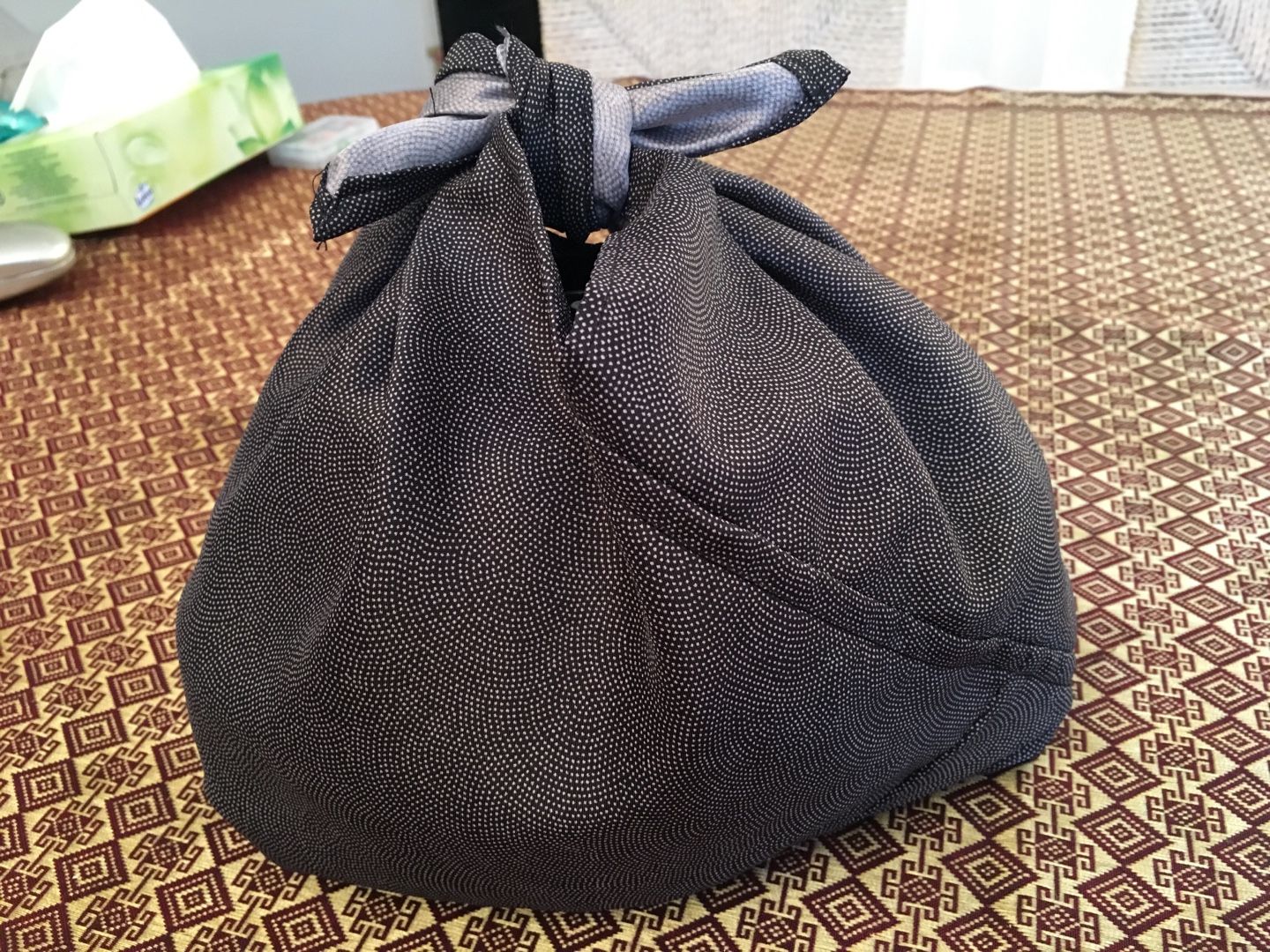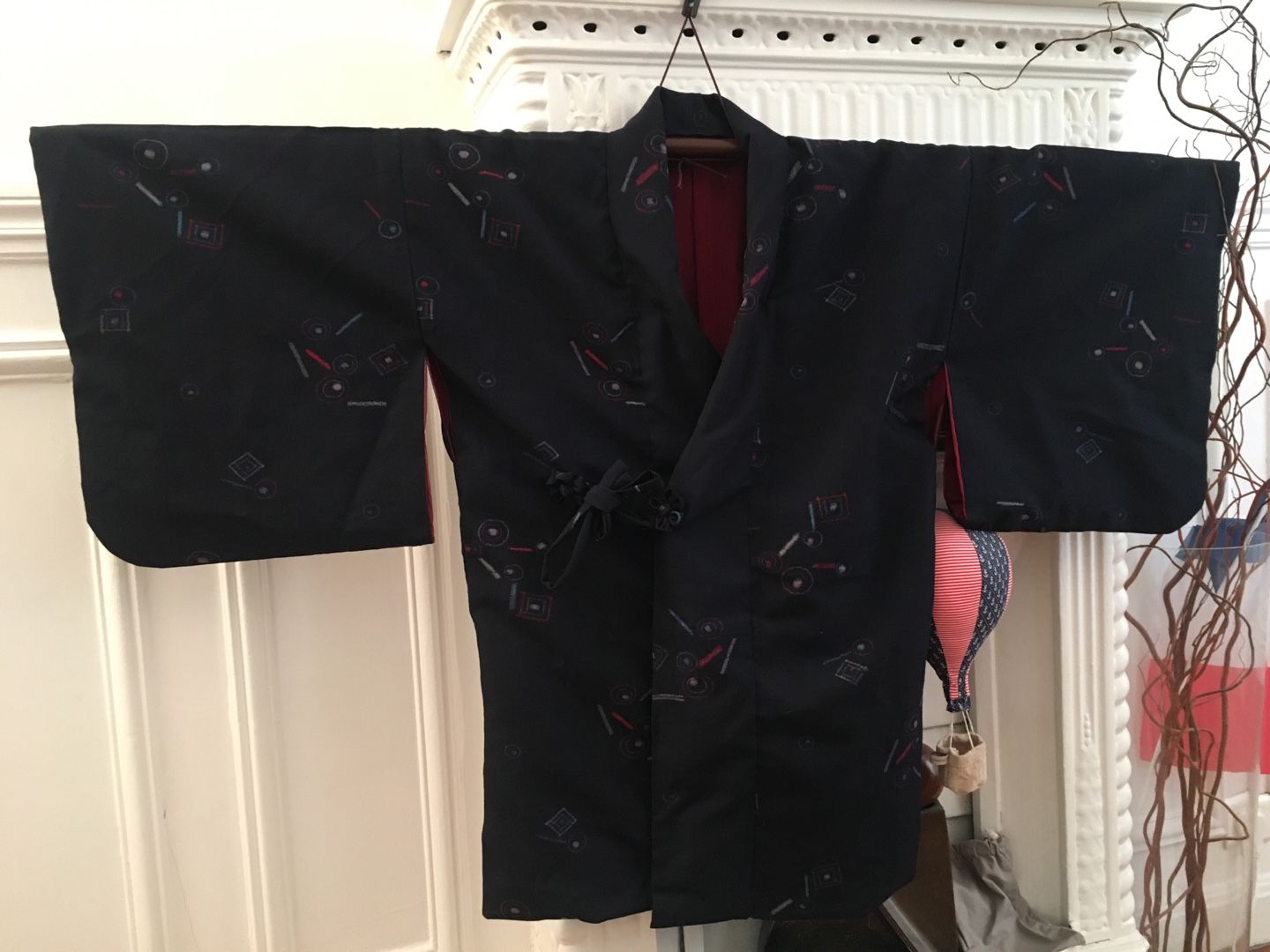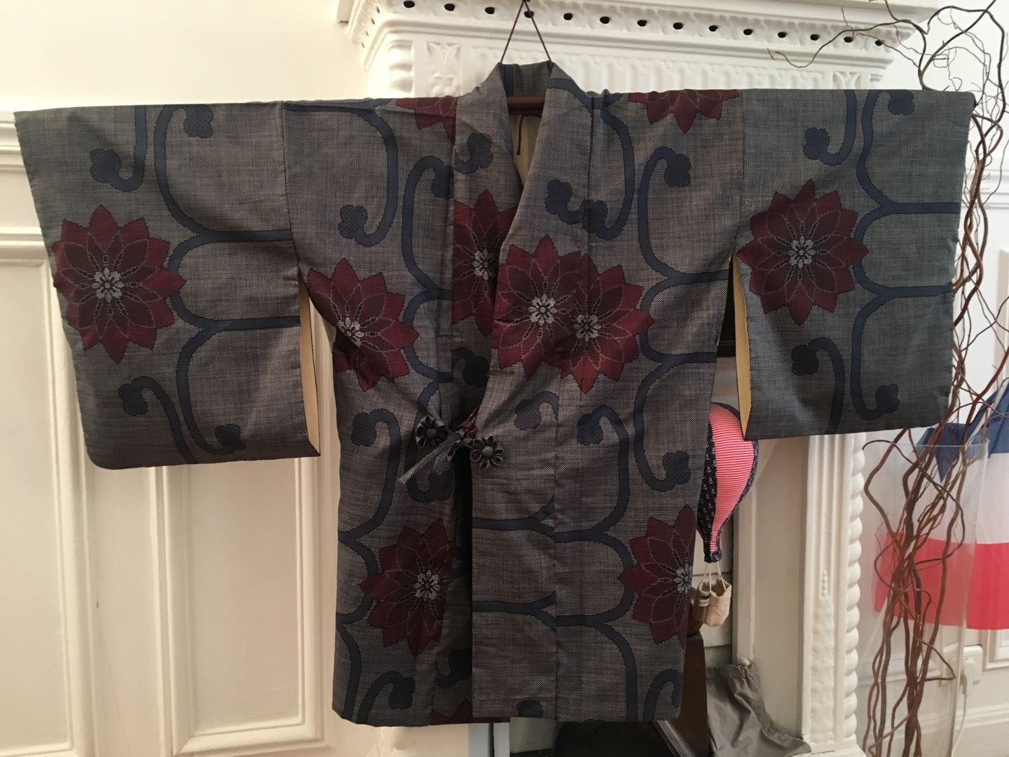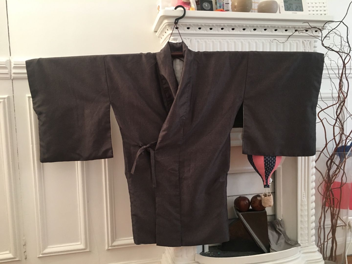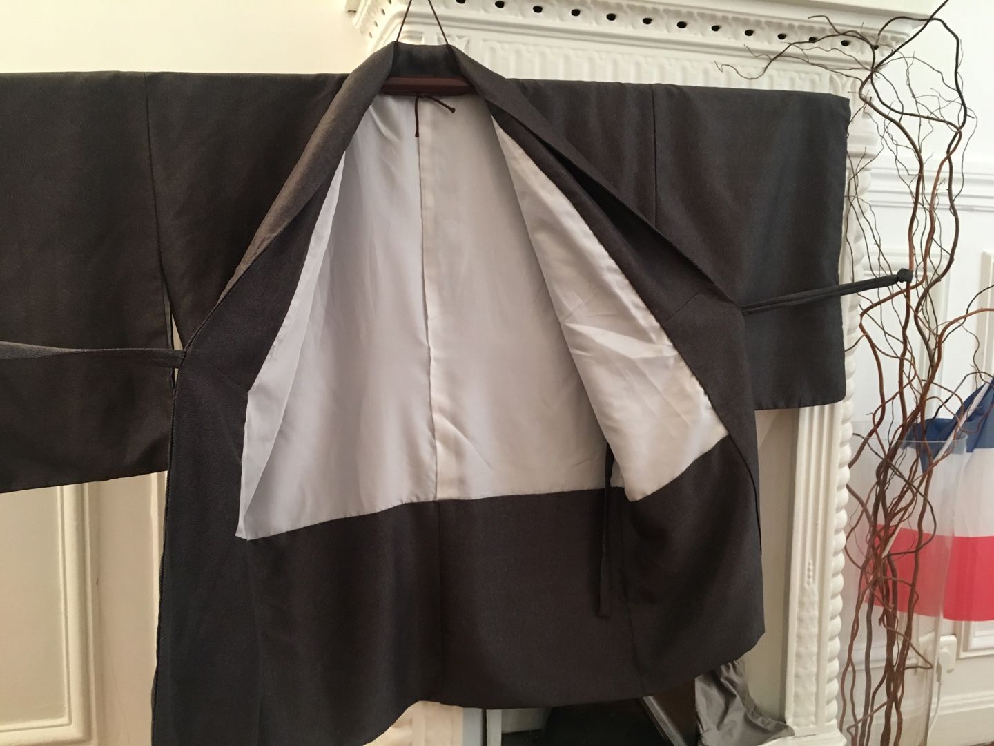 とにかく簡単に作れて簡単に羽織れるように頑張りました✨ すでに一着、和裁の先生が作られた物をお持ちだったので、それをお借りし見本にしました! まずは男性物の上着にリメイクする灰色の小紋。 鮫小紋よりも細かい地紋が入っています。 ![]() あんちゃん、ちょっとどいててね・・・ 袖、衿をそれぞれ外します。 共衿とおくみは不要になるのでこれも外します。 裾も解き八掛と胴裏のジョイント部分も解いておきます。 裏の八掛は不要になるので袖口も衿下も全て取り除きます。 衿は限界まで延ばしおくみ無しの本体に付けなおします。 この時の衿の限界の長さが身丈になります。 一般的な衿の長さは200センチ~220センチなので身丈は100~110が限界って事になりますね。 それ以上長くするには衿の長さが足りない。 衿を継ぐのはちょっと考えられないですもんね。。。 共衿のふりをして3枚で継いでしまうっていう手も有りかもしれませんが・・・ちょっとカッコ悪い 下部分の表地は折り返して八掛風にするのでその部分以外の長すぎる裾は切ってしまいます。 ![]() 袖フキも表地と同布で入れなおします。 わかりにくいですが、袖口部分です。 ここの部分は不要になった共衿を使いました。 衿裏は身頃と一体になっているため下部分が見えてしまうので、この部分も表地と共布にしました。 衿の裏地は不要になったおくみを繋いで使いました。 なるべく見える心配のない胸下あたりで繋ぐようにしてみました。 ![]() 最後は中と表に2本づつ、合計4本紐を作って腰の止め紐にしました。 これで完成。 男性物ということだったので限界まで長くしてみました。 ![]() 背後に奇妙な生き物が見えますが無視してください 2枚目は大き目な柄の大島紬でした。 作業に入る前に1枚撮っておくのを忘れた~ ![]() 胴裏がだいぶ劣化していたので本当は八掛を使って入れ替えたかったのですが どうしても袖の裏地までの布が足りなかったので断念しそのまま胴裏を使用・・・ 和裁の先生いわく、洋裁の場合は裏地に白は使わないそうで・・・ 今回は依頼者さんと相談の上、そのまま胴裏を利用させて頂きました。 ![]() 完成 少し短めという希望だったので見本より10センチ短くしました。 やっぱ大島は軽くてやわらかくて着心地抜群 ![]() 腰紐の留め部分はかぶせボタンとつまみ細工でお花を作りました ![]() 3枚目、最後のお着物は超難関。 単衣の紬だったのでーーーす ![]() 前の2枚と同じ工程ですが裏地がありません。 ポリエステルですが手持ちの洋服用の極薄裏地を使い、新規作成しました。 でも表地の素材とマッチしていないのでとっても縫い難いんですよ・・・(-_-;) ![]() もともと重さのある表地(ウールだったのかな?)なので裏地を使ったのは良かったかも。 ![]() あまり布が沢山出てしまった大島は手付き巾着も作ってみました。 ![]() 他のあまり布はあづま袋に。 ![]() この柄、意外と可愛い ![]() 製作期間は1日当たり2時間~4時間で1枚2週間弱。 3枚で6週間ほど頂きました。 そして無事、お届も完了しました! 川沿いの素敵な場所~ やっぱ郊外って良いわぁ