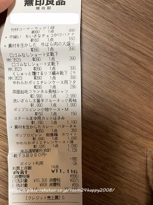 必要なものもあったし、1万円分の買い物をしました♪ レシートは最後にアップしています。 雨が降る前の午前中のうちに夫と行ってきました! ![]() 救急箱、二拠点のほうではなかったから やっと買えました☆ やわらか収納ケース深型は、備蓄用の保存水2L 6本がピッタリ入ります。 ![]() これは4本だけ収納していますが、実際は6本入ります。 2本は分散したほうがいいかなと、別の部屋で保管しています。 収納ケースの下は平台車です。 二拠点のほうでは、台車はニトリで買ったものですが 向こうのマンションでは、無印良品の平台車を使用しています。 無印のほうは、耐荷重80kgなので お米や水の保存なら無印の平台車がいいと思いました! 台車の上に置くことで、移動がラクになって 掃除機がかけやすいです^^ ・やわらかポリエチレンケース・深 税込 1,090円 ・フタ 税込 290円 ・スチールまゆ用カットはさみ 税込 1,190円 まゆバサミは、前に使ってた眉ハサミは 向こうのマンションに帰ったとき用に置いてきました。 二拠点のほうでは、節約のためにと100均で買ってみたんですが 眉毛をうまくすくってくれなくて、切れ味もイマイチで使いにくくて(^^;) それでも4ヶ月は使いました。 もったいないので裁縫用にしようかな。 ・救急箱 ホワイトグレー 税込 1,690円 ・夫の洋服 両面起毛フランネル長袖シャツ 洗いざらし太番手クルーネック長袖 ![]() 私の靴下 選べる3足 税込990円 靴下3足990円は、無印週間10%OFFの対象外です。 ボーダーと無地ネイビー、無地ブラック ![]() リブ編み靴下は4足目です^^ 靴下はユニクロでも買いますが 無印の靴下も履き心地いいし、長持ちで好きです^^ ![]() ・いつものカレーと不揃いバウム 不揃いバウム、今回は「チョコがけバナナ」にしてみました♪ ・小物ケースM 税込 150円 小物ケースは、お出かけ用バッグに入れる 鼻炎薬や頭痛薬などの常備薬を入れるために買いました。 ・竹材コーナーラック1段 税込 990円 ![]() 組み立て式です。夫が選びました☆ 990円のわりに、しっかりした作り^^ 丈夫でしなやかな竹材を使用したラックです。 デッドスペースになりがちなコーナーを生かして 収納スペースを増やすことができます。 <本日の家計簿> お買上点数 14点 無印週間割引合計 -1,128円 合計金額 11,116円 楽天pay払いが使えない店舗だったのが残念(^^;) 楽天デビットカードでタッチ決済しました。 お買い物のレシートです。 ![]() 無印週間で必要なものが10%OFFで買えて いいお買い物ができました♪ ↓こちら↓を応援ポチッとしていただけると嬉しいです。 また、参考になりましたら1クリックお願いします♪ ↓買い回りの参考になります。 #楽天で買って良かったもの #楽天お買い物マラソン #楽天スーパーセール ↓こちらから返礼品ランキングなども見れます♪ 応援クリックして頂けると嬉しいです。 また、参考になりましたら応援ポチッと↓ お願いします♪ 人気ブログランキング 最後まで見てくださり、ありがとうございました お気に入りの記事を「いいね!」で応援しよう