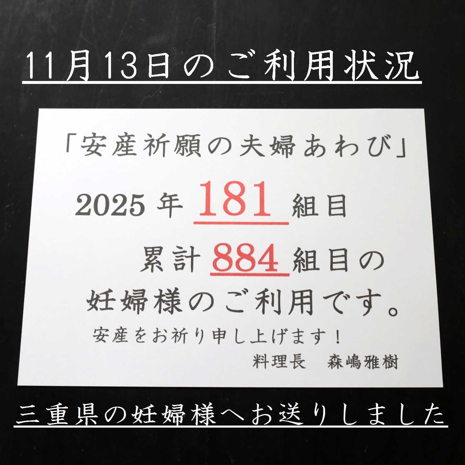 ![]() 三重県最北端 いなべ市 「阿下喜 あげき」の 日本料理 昭栄館 の料理長のブログ。 2006年9月13日から19年間毎日更新中です。 私 料理長 53歳。 もう33~28年前になりますが、 有名料亭 神戸吉兆で修行して参りました。 ![]() 当店のこと 毎日発信している情報 画像など、 昭栄館リットリンクからご覧下さいませ。 ![]() ![]() ↑ いなべ市ってこんなところ。 2022年4月より、 ![]() 楽天市場 日本料理 昭栄館 にて、いろいろ販売しております。 ![]() 全国各地にお送りしていますよ~。 楽天市場 日本料理 昭栄館 是非、一度ご覧下さいませ。 本日は、2025年 11月13日 木曜 友引 戌の日。 「楽天市場 日本料理 昭栄館」に 1,489 1,490回目のご注文! 地元 三重県の妊婦様へお送りの商品は、 ![]() ・冷凍 安産祈願の夫婦あわびセット 東京の皆様 いらっしゃいませ~。 冷蔵(1週間) 冷凍(2週間)と 消費期限が長くなりますので、 お日柄(戌の日)の都合 お仕事の都合に合わて ご利用になりやすく 人気が出てきて 最近 冷凍のご注文が増えて これからの時期 大雪 コチラ三重県では、古くから 妊娠中に 夫婦あわび と食べると、 「目の綺麗な子が生まれる」 「眼病にかからない」 「安産で産まれる」と言い伝えられています。 もちろん、我が家も「安産祈願の夫婦あわび」を妻 ![]() 3,500~4,016グラムと、大きな赤ちゃん 3人共みんな 超安産でした。 風邪もひかない、元気で丈夫 あれから16~21年程経ちますが、 今でも 「あわび食べてもらって良かったな~」 と思っております。 ![]() あわびと妻 ![]() ![]() ![]() ![]() 当店は、安産祈願の夫婦あわび料理で大人気のお店です。 ・店内での「安産祈願の夫婦あわび料理」 ・テイクアウトで「楽天市場の安産祈願の夫婦あわびセット」 共に、たくさんのご利用がございますよ。 ![]() ![]() 身重な妊婦さんへの気遣いはもちろん、 お腹の赤ちゃんの健やかな誕生を願って・・・ 安産祈願に、心を込めたあわび料理を・・・ 妊婦さんへの一番のプレゼント 大人気です! 2025年 ![]() 181組目の妊婦様のご利用。 累計884組目の 妊婦様のご利用になります。 「写真撮るの忘れて食べちゃった。 「産まれてきた赤ちゃんに、安産祈願のあわび料理を見せてあげたかった。 ご安心ください!! いつか、大きく成長されたお子様に、 この安産祈願の夫婦あわび料理を食べて、あなたが産まれたのよ とお伝え出来ますように、毎回のあわび料理をアップしております。 是非、いつか私のブログにアクセスしていただき、 ご家族揃って、お楽しみくださいませ!!! 当店の安産祈願の夫婦あわび料理を召し上がって、 ![]() ![]() 初節句のお祝い 赤ちゃんのお食い初めで再度ご来店いただくお客様も たくさんございます! 楽天アワビランキング 1位を獲得したこと 74回あります! 2023年は、6回。 8月6日分 9月20日 10月5日分 10月9日分 11月15日分 11月18日分 2024年は、32回! 1月14日分 1月15日分 1月16日分(3日連続! 1月28日分 1月29日分 1月31日分 2月1日分 2月13日分 2月16日分 3月4日分 3月17日分 3月19日分 5月21日分 6月8日分 6月9日分 6月18日分 6月29日分 7月2日分 7月21日分 8月1日分 8月17日分 8月26日分 8月27日分 8月31日分 9月12日分 9月29日分 9月30日分 10月4日分 10月6日分 10月10日分 10月17日分 10月29日分 2025年は、早くも36回! 1月7日分 1月8日分 1月12日分 1月23日分 1月24日分 1月25日分 3日連続!!! 1月28日分 1月30日分 3月2日分 3月4日分 3月5日分 2日連続!!! 3月25日分 3月26日分 2日連続!!! 3月30日分 4月3日分 4月8日分 4月20日分 5月3日分 5月4日分 2日連続!!! 6月8日分 6月27日分 7月11日分 7月12日分 2日連続!!! 7月31日分 8月6日分 8月16日分 8月24日分 8月25日分 2日連続!!! 9月3日分 9月6日分 9月7日分 2日連続!!! 9月9日分 9月23日分 10月10日分 10月13日分 ![]() ↑ 2025年 10月19日 デイリーランキング部門にて 2025~2026年の「戌の日カレンダー」です。 ![]() 今度の「戌の日」は、11月25日 火曜日!!! 全国の妊婦様 ご家族様 是非ご注文ください! こちらの不手際により 「真空袋が閉じられてなくて、汁が漏れていた! 「あわびの殻で袋が破れていた! 様々なご意見を頂戴しまして、 梱包の仕方など、日々改善 どうぞ 安心してお求めくださいませ!!! 昨年末から「冷凍」もお選びいただけるようになりました。 冷蔵(1週間) 冷凍(2週間)と 消費期限が長くなりますので、 お日柄(戌の日)の都合 お仕事の都合に合わて ご注文いただきやすくなったと思います。 昨年末から テイクアウト 「楽天市場の安産祈願の夫婦あわびセット」 ↑ 始めていますよ! ![]() こだわって、国産の夫婦あわびを使用していますので イイお値段になります。 オスの黒あわびは、鳥取県産 メスのメガイあわびは、山口県産を使用しました。 ![]() ↑ 恒例の メッセージ旗 もお付けしましたよ! 楽天レビュー インスタグラムなどでご利用頂けると嬉しいです。 続いて、 遠く 長野県の赤ちゃんへお送りの商品は、 ![]() おうちでお食い初めセット 長野の皆様 いらっしゃいませ~。 幸せレストラン 昭栄館 私 料理長が心を込めてお料理しています。 お食い