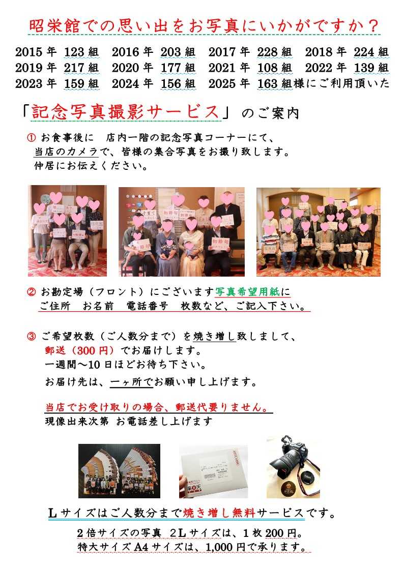 ![]() 本日は、2026年 1月11日 日曜日。 テイクアウトお料理 ご来店のご予約 まずは、テイクアウトお料理から。 「おひとり様オードブル 2,800円」のお献立です。 ![]() 橙色で印刷してあるのが、地元 三重県食材。 地産地消 国消国産に力 5膳承っていました。 「ごちそう弁当 扇 3,500円」のお献立です。 ![]() 4膳 13膳 合計17膳承っていました。 13膳は、員弁町 楚原地区へお届け 大切なお席に当店のお料理のご注文ありがとうございました。 続いてご来店のお客様。 三味線の初弾き 自治会の新年会など、合計30名様。 お昼席 13名様のお献立です。 ![]() 雅会席 5,500円のご注文でした。 お食事後に承った記念写真 ![]() ↑ こんな感じにお撮りできています。 昭栄館オリジナルの記念写真用メッセージカードを いろいろお持ちになって、おめでたいお写真となりました。 いなべの昭栄館は、幸せレストラン お写真、早速現像に出しています。 出来上がりまで 一週間~10日ほどお待ちくださいませ。 大切なお席に当店のご利用ありがとうございました! 2015年 123組 2016年 203組 2017年 228組 2018年 224組 2019年 217組 2020年 177組 2021年 108組 2022年 139組 2023年 157組 2024年 156組 2025年 163組のお客様がご利用になった ![]() 2026年 記念写真 撮影サービス 2組目の皆様でした。 累計 1,897組目 の皆様のご利用になります。 昭栄館公式インスタグラムからもお写真ご覧になれますよ! Lサイズ(普通サイズ)の写真は、ご人数分まで無料です。 2Lサイズ(Lサイズの倍の大きさ)の写真は、1枚 200円。 A4サイズ(コピー用紙のサイズ)の写真は、1枚 1,000円で承ります。 郵送の場合 送料300円頂戴します。(2025年 5月28日より) 当店でお受け取りの場合、郵送代は要りません。 大切なお席に当店のご利用ありがとうございました。 続いて夜席 自治会の新年会 ![]() 雅会席 5,500円のご注文でした。 13名様は、 ![]() 飲み放題のご利用でした。 いろいろたくさんお飲みになりましたよ。 地元 阿下喜 赤神地区 大安町 石榑東地区の皆様 大切なお席に当店のご利用ありがとうございました。 三重県最北端 いなべ市 「阿下喜 あげき」の 日本料理 昭栄館 の料理長のブログ。 2006年9月14日から19年間毎日更新中です。 こちらから 最近の昭栄館の様子(ブログ)を日を追ってご覧になれますよ。 私 料理長 53歳。 もう33~28年前になりますが、 有名料亭 神戸吉兆で修行して参りました。 ![]() 当店のこと 毎日発信している情報 画像など、 昭栄館リットリンクからご覧下さいませ。 ![]() ![]() ![]() ↑ いなべ市ってこんなところ。 昨年 令和7年3月29日(土曜)15時に、 いなべインターチェンジが開通。 高速降りて、当店までお車 テイクアウトお料理 ![]() ご来店のお料理 ![]() ご予約は、 お電話 0594-72-2065 日本料理 昭栄館 又は、 昭栄館LINE公式アカウントから 24時間 365日承ります。 AIによる自動応答(ヘンテコな応答かも)ですが、 24時間以内に 私 料理長からお返事差し上げますので、 しばらくお待ちくださいませ。 昭栄館LINE公式アカウント お友だち登録お待ち申し上げます。 (お急ぎの場合は、お電話 ![]() お撮りしたお写真 LINEからお送りすることが出来ますので、とても喜ばれております。 今後とも いなべの昭栄館をよろしくお願い申し上げます。 ![]() 料理長 森嶋雅樹
