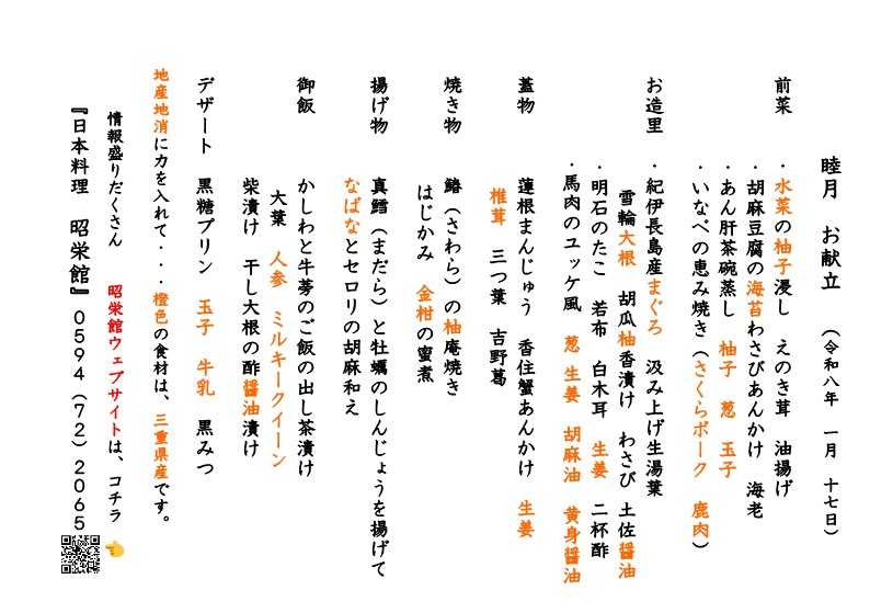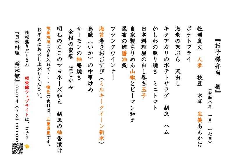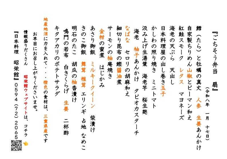 ![]() ![]() 本日は、2026年 1月17日 土曜日。 テイクアウトお料理 ご来店 たくさんのご予約 本日の昭栄館の様子 まずは、テイクアウトお料理から。 「ごちそう弁当 扇 3,500円」のお献立です。 ![]() 橙色で印刷してあるのが、地元 三重県食材。 地産地消 国消国産に力 8膳 12膳 13膳の合計33膳承っていました。 12膳は、大安町 平塚地区 13膳は、員弁町 御薗地区へお届け 「ごちそう弁当 雅 5,500円」のお献立です。 ![]() 15膳承っていました。 地元 阿下喜 赤神地区へお届け 「お子様弁当 扇 豪華版 3,500円」のお献立です。 ![]() 1膳承っていました。 大切なお席に当店のお料理のご注文ありがとうございました。 続いてご来店のお客様。 自治会の新年会 北町 赤神地区の皆様 合計34名様。 お献立です。 ![]() 雅会席 5,500円のご注文でした。 ![]() ![]() 今年もよろしくお願い申し上げます。 大切なお席に当店のご利用ありがとうございました! 三重県最北端 いなべ市 「阿下喜 あげき」の 日本料理 昭栄館 の料理長のブログ。 2006年9月14日から19年間毎日更新中です。 こちらから 最近の昭栄館の様子(ブログ)を日を追ってご覧になれますよ。 私 料理長 53歳。 もう33~28年前になりますが、 有名料亭 神戸吉兆で修行して参りました。 ![]() 当店のこと 毎日発信している情報 画像など、 昭栄館リットリンクからご覧下さいませ。 ![]() ![]() ![]() ↑ いなべ市ってこんなところ。 昨年 令和7年3月29日(土曜)15時に、 いなべインターチェンジが開通。 高速降りて、当店までお車 テイクアウトお料理 ![]() ご来店のお料理 ![]() ご予約は、 お電話 0594-72-2065 日本料理 昭栄館 又は、 昭栄館LINE公式アカウントから 24時間 365日承ります。 AIによる自動応答(ヘンテコな応答かも)ですが、 24時間以内に 私 料理長からお返事差し上げますので、 しばらくお待ちくださいませ。 昭栄館LINE公式アカウント お友だち登録お待ち申し上げます。 (お急ぎの場合は、お電話 ![]() お撮りしたお写真 LINEからお送りすることが出来ますので、とても喜ばれております。 今後とも いなべの昭栄館をよろしくお願い申し上げます。 ![]() 料理長 森嶋雅樹
