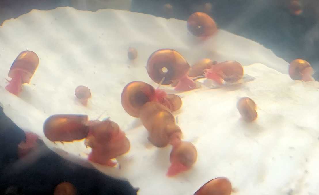昨日のバレンタインは、あちこちでスイートな画像を拝見しました♪ラブラブなのは微笑ましい限りでございます。さて、今日は…?レッドラムズホーンとヨザクラムズホーンの中から、大きく成長している代表選手をこちらに分ける事にしました。東の横綱(白砂学校から移しました)ご長寿の風格。触角が青い?気がします。ブルーラムズの家系かも?西の横綱(さくら幼稚園から移しました)ヨザクラムズホーンは最近、分け始めたばかりなので…大きい子は少ないです。暫くの間、大きいラムズホーンを別室で観察したいと思います。レッドラムズホーン(⌒‐⌒) のびのびと動く姿を見つめていると、現実の時を忘れてしまいそうです★めだかも人間もおやつの時間だよー★