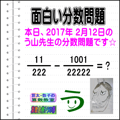 ![]() ※─────────────────────────※ 【算太・数子の算数教室】(R) 【算数合格トラの巻】 ※─────────────────────────※ (o^-')b 大人気☆[う山先生式・分数計算]の問題です♪ ※─────────────────────────※ □ 2017/02/12(日) (o^-')b【ツイッター問題539】 [う山先生の分数・通算468問目] [分数問題(2017年-019)] 本日は2017年02月12日です。 次の分数計算をしてね♪ 11/222 - 1001/22222 = ? □ 【答え】後程♪ □ ※─────────────────────────※ (*^ー^)ノ[う山先生の分数(2017年-019)]です☆ 本日は、初めの式が【2と1と0】という 面白い分数問題を作成しました♪ 分子・分母ともどうなるかな♪ ※─────────────────────────※ 中学受験算数・数学・算数数学プロ家庭教師・個人指導 ※─────────────────────────※ □ □□□□□□□□□□□□□□□□□□□□□□□□□□□ [発行者氏名]【う山雄一】 [発行者web]【算数合格トラの巻】 [発行者web]【算太・数子の算数教室】(R) [著作]【算太・数子の算数教室】(R) 「さんた・かずこのさんすうきょうしつ」 [著作]【算遊記】 □ [仕事URL] https://sansu.theblog.me/ http://santakazuko.wix.com/uyama http://www.geocities.jp/sansu_gokaku_toranomaki/ □ [成績表・偏差値アップ] http://www.geocities.jp/santa_kazuko_1994/ □ [算遊記(さんゆうき)]算蔵法師・算悟空 http://www.geocities.jp/san_yu_ki/ □ [仕事用フェイスブック] https://www.facebook.com/kazuko.santa.5 □ [仕事用メール] ??????@hotmail.com ??????@gmail.com □ [ブログ]【算数合格トラの巻】 http://ameblo.jp/sansu/ http://blogs.yahoo.co.jp/sansu_gokaku_toranomaki http://uyama.blog.jp/ □ [ブログ]【算太・数子の算数教室】(R) http://ameblo.jp/santa-kazuko/ http://blogs.yahoo.co.jp/santa_kazuko_1994 http://blog.goo.ne.jp/santa_kazuko http://santakazuko.wordpress.com/ http://santa-kazuko.at.webry.info/ http://santa-kazuko.blogspot.jp/ http://ch.nicovideo.jp/santa-kazuko http://santa-kazuko.blog.jp/ □ [ブログ]【う山先生】 http://happy.ap.teacup.com/uyama/ http://blog.livedoor.jp/sansu/ http://blogs.yahoo.co.jp/san_yu_ki http://sansugokaku.blog.fc2.com/ □ [ブログ]【オルドビスキー博士】 http://ameblo.jp/ordovisky/ □ [動画配信]【う山TV】 http://www.geocities.jp/sansu_gokaku_toranomaki/3-uyama-tv [分数、楽しい!]シリーズ [知的ゲーム]シリーズ [一瞬で解こう!]シリーズ [解けたら天才♪]シリーズ [家庭教師]シリーズ [算数・数学ファイル/SSファイル]シリーズ □ □□□□□□□□□□□□□□□□□□□□□□□□□□□ ☆ ☆ ☆ ☆ ☆ ☆ ☆ お気に入りの記事を「いいね!」で応援しよう