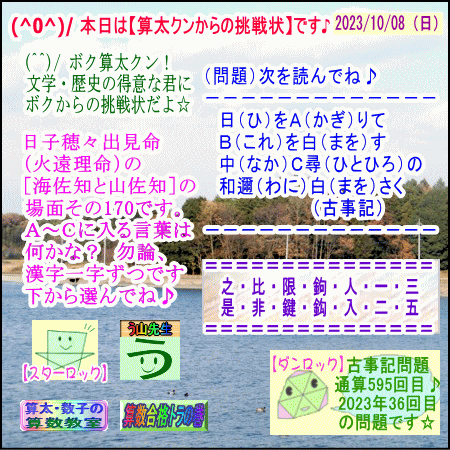 ![]() □──────────────────□ 【う山TV】(スタディ)(バラエティ) 【算数合格トラの巻】 【算太・数子の算数教室】(R) 【カンブリア・アカデミー】 □──────────────────□ (o^-')b 本日はこの問題にチャレンジ☆ 【算太クンからの挑戦状2023】(文学・歴史・古事記) です☆ □──────────────────□ □ 2023年10月08日(日) □ (^0^)/ 本日は【算太クンからの挑戦状】です♪ □ (^^)/ ボク算太クン! 文学・歴史の得意な君に ボクからの挑戦状だよ☆ □ (問題)次を読んでね♪ --------------- 日(ひ)をA(かぎ)りて B(これ)を白(まを)す 中(なか)C尋(ひとひろ)の 和邇(わに)白(まを)さく (古事記) --------------- □ 日子穂々出見命(火遠理命)の [海佐知と山佐知]の 場面その170です。 A~Cに入る言葉は何かな? 勿論、漢字一字ずつです♪ 下から選んでね♪ □ =============== 之・比・限・鉤・人・一・三 是・非・鍵・鈎・入・二・五 =============== □ [算太クンからの挑戦状・2023] [令和5年・文学・歴史・古事記] □ □ □──────────────────□ (*^ー^)ノ 大人気☆【算太クンからの挑戦状】です! □ さてさて算太クンが、 君たちに挑戦してきました! □ 【ダンロック君】が言ってます、 『古事記問題 通算595回目♪ 2023年36回目 の問題です☆』 です☆ □ 大人気の選択問題です! 今回も選択問題を作成いたしました☆ 14個の漢字から、 A,B,C,の漢字1文字合計3個の 正解を選べるかな?(^^)/ □ 正解した方は、 『文学歴史の天才クン』です☆(o^-')b □ う山先生の予想正答率は、 1個正解 → 50%以下 2個正解 → 15%以下 3個正解 → 10%以下 です☆ □ ではレッツ・ゴー!!☆(^o^)/ □ 答えは、 □ ↓ ↓ ↓ ↓ ↓ ↓ ↓ ↓ ↓ □ 【答え】[A=限、B=之、C=一]です。 (*^ー^)ノ □ 【参考・古事記原文】 限日而白之中 一尋和邇白 * (2023年10月08日) 日(ひ)を限(かぎ)りて 之(これ)を白(まを)す 中(なか)一尋(ひとひろ)の 和邇(わに)白(まを)さく □ ♪( ´θ`)ノ 【日子穂々出見命(火遠理命)】 [海佐知と山佐知」です☆ □ #古事記 #日本書紀 #文学 #クイズ #解けたら天才 #家庭教師 #う山TV #う山先生 #う山雄一先生 #オルドビスキー博士 #シルルちゃん #デボン君 #白亜紀先生 #カンブリアアカデミー #勉強 #勉強垢 #算太数子の算数教室 #算太・数子の算数教室 #計算問題 #数学垢 #数学教えて #数学教える #中学受験 #中学入試 #高校入試 #高校受験 #相互フォロー □ □──────────────────□ 算数・数学・家庭教師・個別指導・質問教室 □──────────────────□ □ □□□□□□□□□□□□□□□□□□□□ [氏名]【う山雄一】 [動画]【う山TV(スタディ)】 [動画]【う山TV(バラエティ)】 [著書]【算太・数子の算数教室】(R) □ [メインサイト]【う山先生のHP】 https://uyama.theblog.me/ □ □ [成績表・偏差値アップ] http://uyama.aikotoba.jp/seiseki/seiseki.html □ □ [YouTube・チャンネル]【う山TV】(スタディ) https://www.youtube.com/channel/UCnMIEU_iFTH2iP5uAH1qevQ □ □ [YouTube・チャンネル]【う山TV】(バラエティ) https://www.youtube.com/channel/UC32D4Nf7sEpxD_VvoaHsJaA □ □ □□□□□□□□□□□□□□□□□□□□ ☆ ☆ ☆ ☆ ☆ ☆ ☆ ☆ ☆ ☆ ☆ ☆ ☆ お気に入りの記事を「いいね!」で応援しよう