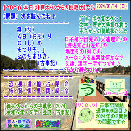 ![]() □──────────────────□ 【う山TV】(スタディ)(バラエティ) 【算数合格トラの巻】 【算太・数子の算数教室】(R) 【カンブリア・アカデミー】 □──────────────────□ (o^-')b 本日はこの問題にチャレンジ☆ 【算太クンからの挑戦状2024】(文学・歴史・古事記) です☆ □──────────────────□ □ 2024年 1月14日(日) □ (^0^)/ 本日は【算太クンからの挑戦状】です♪ □ (^^)/ ボク算太クン! 文学・歴史の得意な君に ボクからの挑戦状だよ☆ □ (問題)次を読んでね♪ --------------- 無(な) AB(おそ)り C(し)め まつりそ。」 とのたまひき。 (古事記) --------------- □ 日子穂々出見命(火遠理命)の [海佐知と山佐知]の 場面その184です。 A~Cに入る言葉は何かな? 勿論、漢字一字ずつです♪ 下から選んでね♪ □ =============== 恐・畏・虞・惶・占・閉・命 怖・賢・惧・皇・閉・締・令 =============== □ [算太クンからの挑戦状・2024] [令和6年・文学・歴史・古事記] □ □ □──────────────────□ (*^ー^)ノ 大人気☆【算太クンからの挑戦状】です! □ さてさて算太クンが、 君たちに挑戦してきました! □ 【ダンロック君】が言ってます、 『古事記問題 通算609回目♪ 2024年の2問目 の問題です☆』 です☆ □ 大人気の選択問題です! 今回も選択問題を作成いたしました☆ 14個の漢字から、 A,B,C,の漢字1文字合計3個の 正解を選べるかな?(^^)/ □ 正解した方は、 『文学歴史の天才クン』です☆(o^-')b □ う山先生の予想正答率は、 1個正解 → 50%以下 2個正解 → 15%以下 3個正解 → 10%以下 です☆ □ ではレッツ・ゴー!!☆(^o^)/ □ 答えは、 □ ↓ ↓ ↓ ↓ ↓ ↓ ↓ ↓ ↓ □ 【答え】[A=惶、B=畏、C=令]です。 (*^ー^)ノ □ 【参考・古事記原文】 然者汝送奉 * (2024年1月14日) 無(な) 惶畏(おそ)り 令(し)め まつりそ。」 とのたまひき。 □ ♪( ´θ`)ノ 【日子穂々出見命(火遠理命)】 [海佐知と山佐知」です☆ □ #古事記 #日本書紀 #文学 #クイズ #解けたら天才 #家庭教師 #う山TV #う山先生 #う山雄一先生 #オルドビスキー博士 #シルルちゃん #デボン君 #白亜紀先生 #カンブリアアカデミー #勉強 #勉強垢 #算太数子の算数教室 #算太・数子の算数教室 #計算問題 #数学垢 #数学教えて #数学教える #中学受験 #中学入試 #高校入試 #高校受験 #相互フォロー □ □──────────────────□ 算数・数学・家庭教師・個別指導・質問教室 □──────────────────□ □ □□□□□□□□□□□□□□□□□□□□ [氏名]【う山雄一】 [動画]【う山TV(スタディ)】 [動画]【う山TV(バラエティ)】 [著書]【算太・数子の算数教室】(R) □ [メインサイト]【う山先生のHP】 https://uyama.theblog.me/ □ □ [成績表・偏差値アップ] http://uyama.aikotoba.jp/seiseki/seiseki.html □ □ [YouTube・チャンネル]【う山TV】(スタディ) https://www.youtube.com/channel/UCnMIEU_iFTH2iP5uAH1qevQ □ □ [YouTube・チャンネル]【う山TV】(バラエティ) https://www.youtube.com/channel/UC32D4Nf7sEpxD_VvoaHsJaA □ □ □□□□□□□□□□□□□□□□□□□□ ☆ ☆ ☆ ☆ ☆ ☆ ☆ ☆ ☆ ☆ ☆ ☆ ☆ ☆ お気に入りの記事を「いいね!」で応援しよう