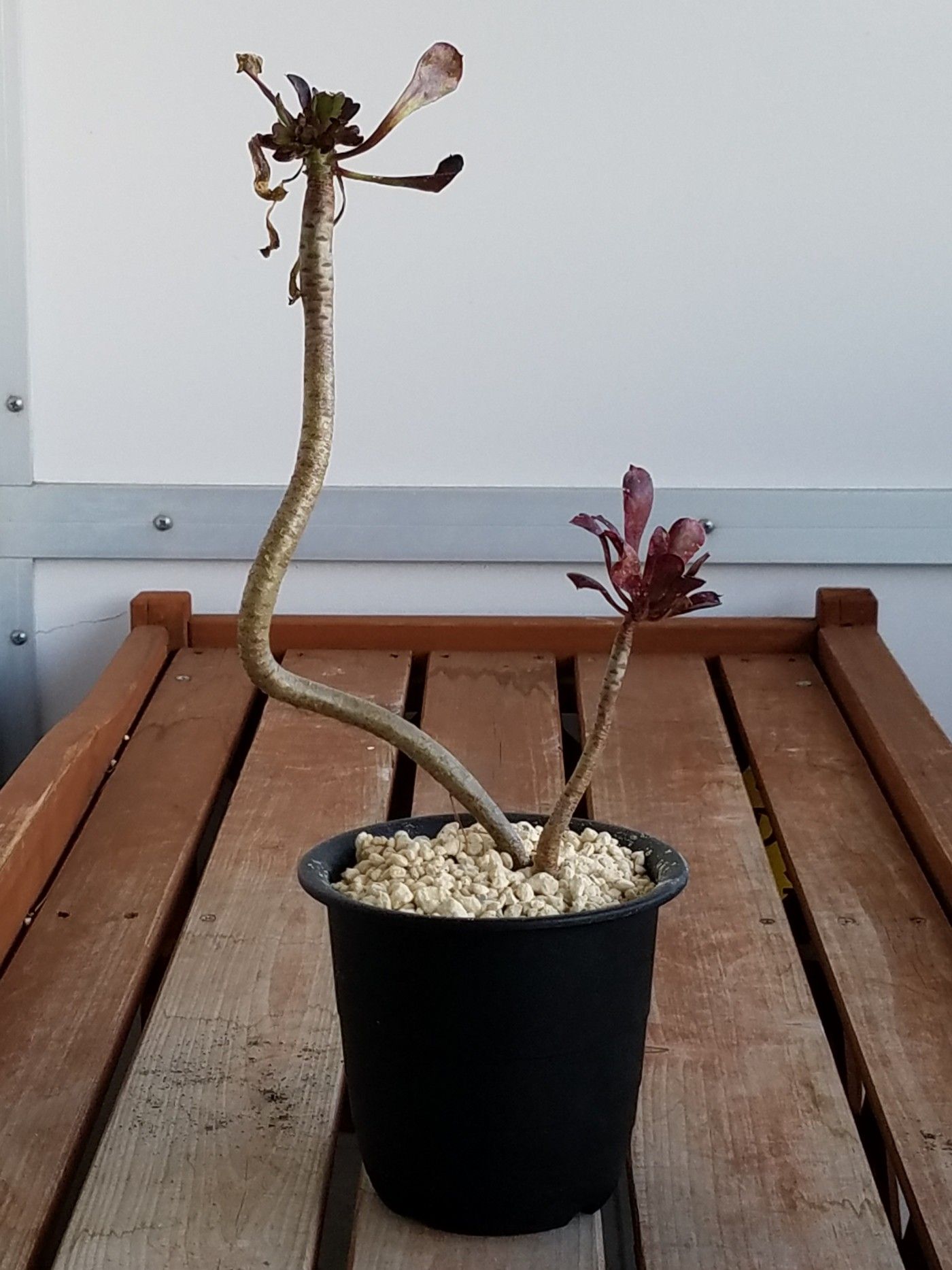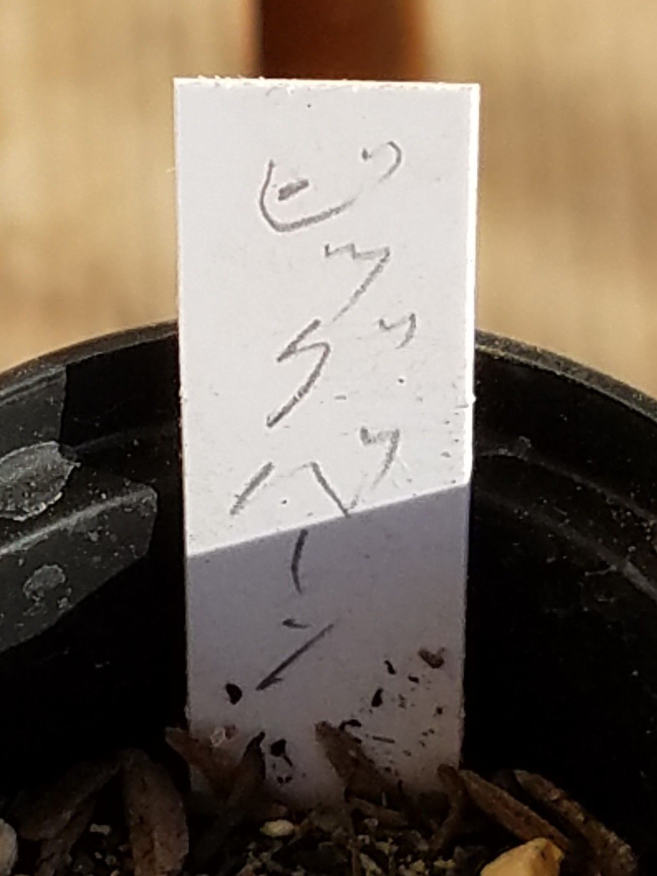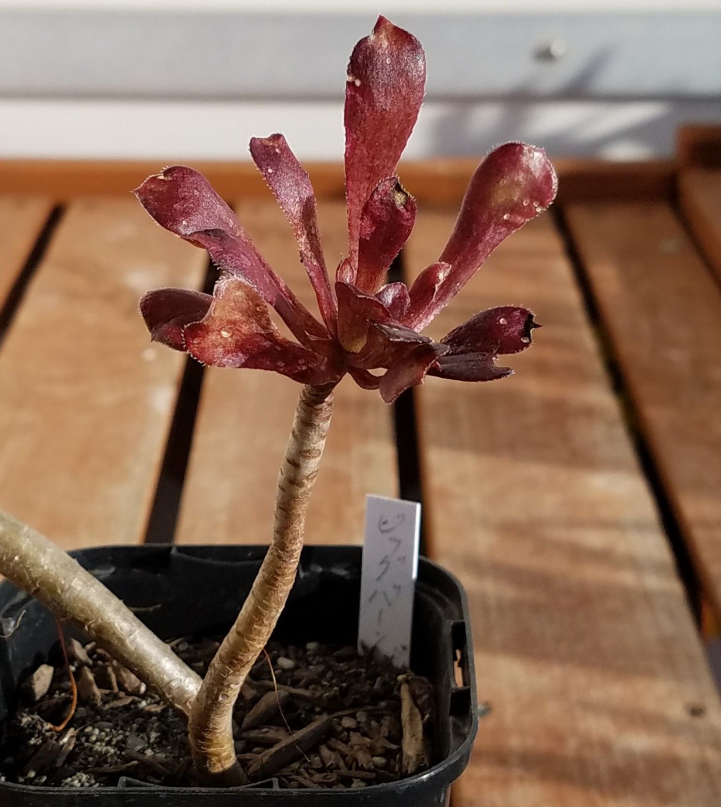 ![]() くねくねと曲がった茎。 ![]() その先端には汚い葉っぱが付く。 ![]() 黒法師だね。 でも札にはそうは書かれていない。 ![]() ビッグバーン? 黒法師じゃないの? ビッグバーンを調べてみる。 アエオニウム・ビッグバーンで検索。 あった。 黒法師の緑斑入りか。 ビッグバーンじゃなくてビッグバンみたいね。 ![]() よく見ると緑の斑があるように見えなくもないが、コレじゃよく分かんねえな。 そもそもロゼットが小さい。 成長期真っ只中でこの大きさ。 一旦成長点が死んでそこからいくつか仔が出たのかな。 もうひとつの枝。 ![]() コイツに緑はない。 黒くもない。 赤い。 ![]() 成長点は緑だが斑らしきものは見当たらない。 謎のビッグバン。 コイツに斑は出るのか? 検索した際には黒と緑のコントラストが素晴らしいビッグバンの姿が出ていたが、うちのこのショボ野郎はそうはならないだろうな。 とりあえず成長期だし植え替えた。 ![]() 水は数日おいてやる。 冬に生育する黒法師。 コイツもすぐにきれいになるだろう。 化けるかもしれないと密かに期待しながら育ててみるとするか。 にほんブログ村 【ラッキーシール対応】観葉植物/アエオニウム:黒法師(クロホウシ)斑入り3号ポット アエオニウム 黒法師 斑入り 多肉植物 3号鉢 (観葉植物)アエオニウム 黒法師 斑入り 3号(1ポット) 沖縄別途送料 北海道冬期発送不可 アエオニウム 真っ黒法師斑入り(3〜3.5号)