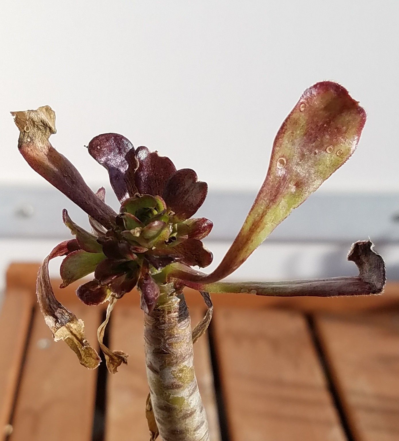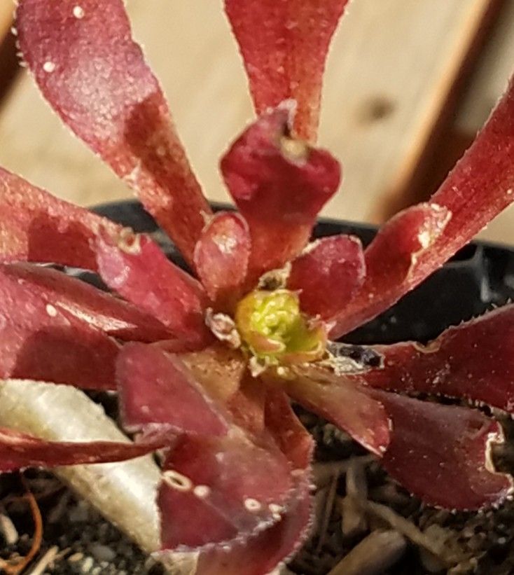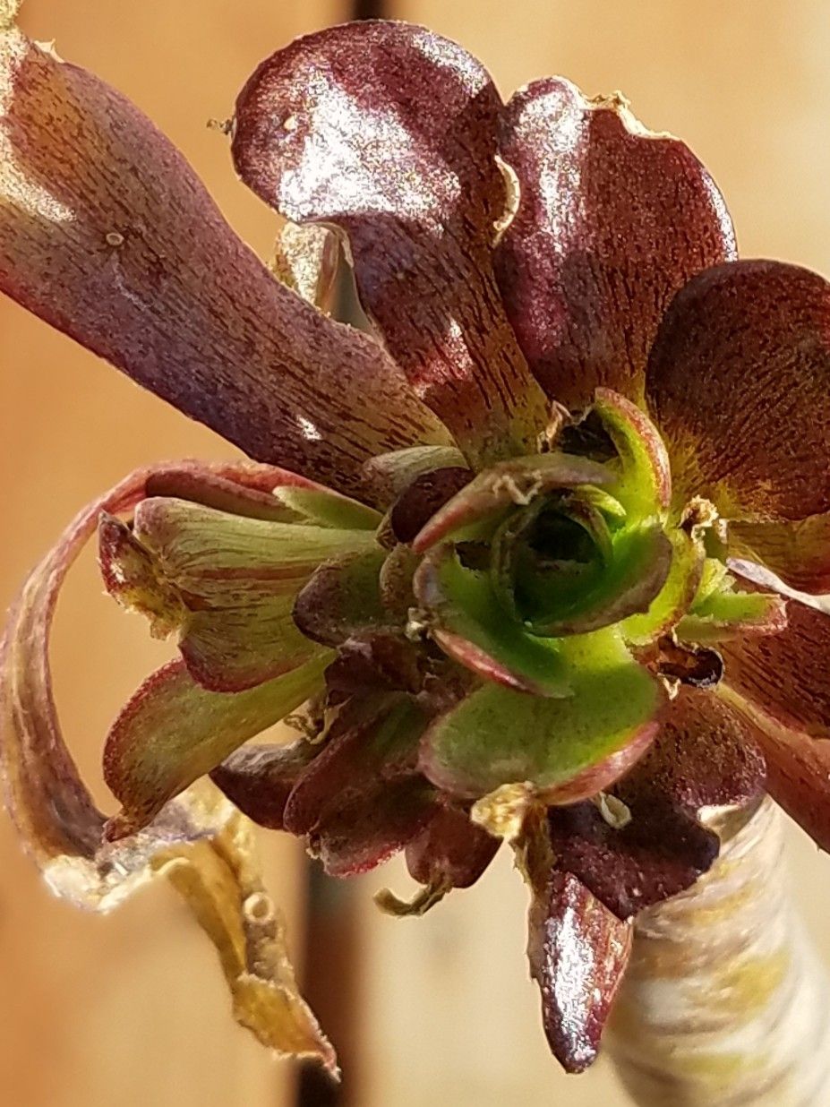 ![]() くねくねと曲がった茎。 ![]() その先端には汚い葉っぱが付く。 ![]() 黒法師だね。 でも札にはそうは書かれていない。 ![]() ビッグバーン? 黒法師じゃないの? ビッグバーンを調べてみる。 アエオニウム・ビッグバーンで検索。 あった。 黒法師の緑斑入りか。 ビッグバーンじゃなくてビッグバンみたいね。 ![]() よく見ると緑の斑があるように見えなくもないが、コレじゃよく分かんねえな。 そもそもロゼットが小さい。 成長期真っ只中でこの大きさ。 一旦成長点が死んでそこからいくつか仔が出たのかな。 もうひとつの枝。 ![]() コイツに緑はない。 黒くもない。 赤い。 ![]() 成長点は緑だが斑らしきものは見当たらない。 謎のビッグバン。 コイツに斑は出るのか? 検索した際には黒と緑のコントラストが素晴らしいビッグバンの姿が出ていたが、うちのこのショボ野郎はそうはならないだろうな。 とりあえず成長期だし植え替えた。 ![]() 水は数日おいてやる。 冬に生育する黒法師。 コイツもすぐにきれいになるだろう。 化けるかもしれないと密かに期待しながら育ててみるとするか。 にほんブログ村 【ラッキーシール対応】観葉植物/アエオニウム:黒法師(クロホウシ)斑入り3号ポット アエオニウム 黒法師 斑入り 多肉植物 3号鉢 (観葉植物)アエオニウム 黒法師 斑入り 3号(1ポット) 沖縄別途送料 北海道冬期発送不可 アエオニウム 真っ黒法師斑入り(3〜3.5号)