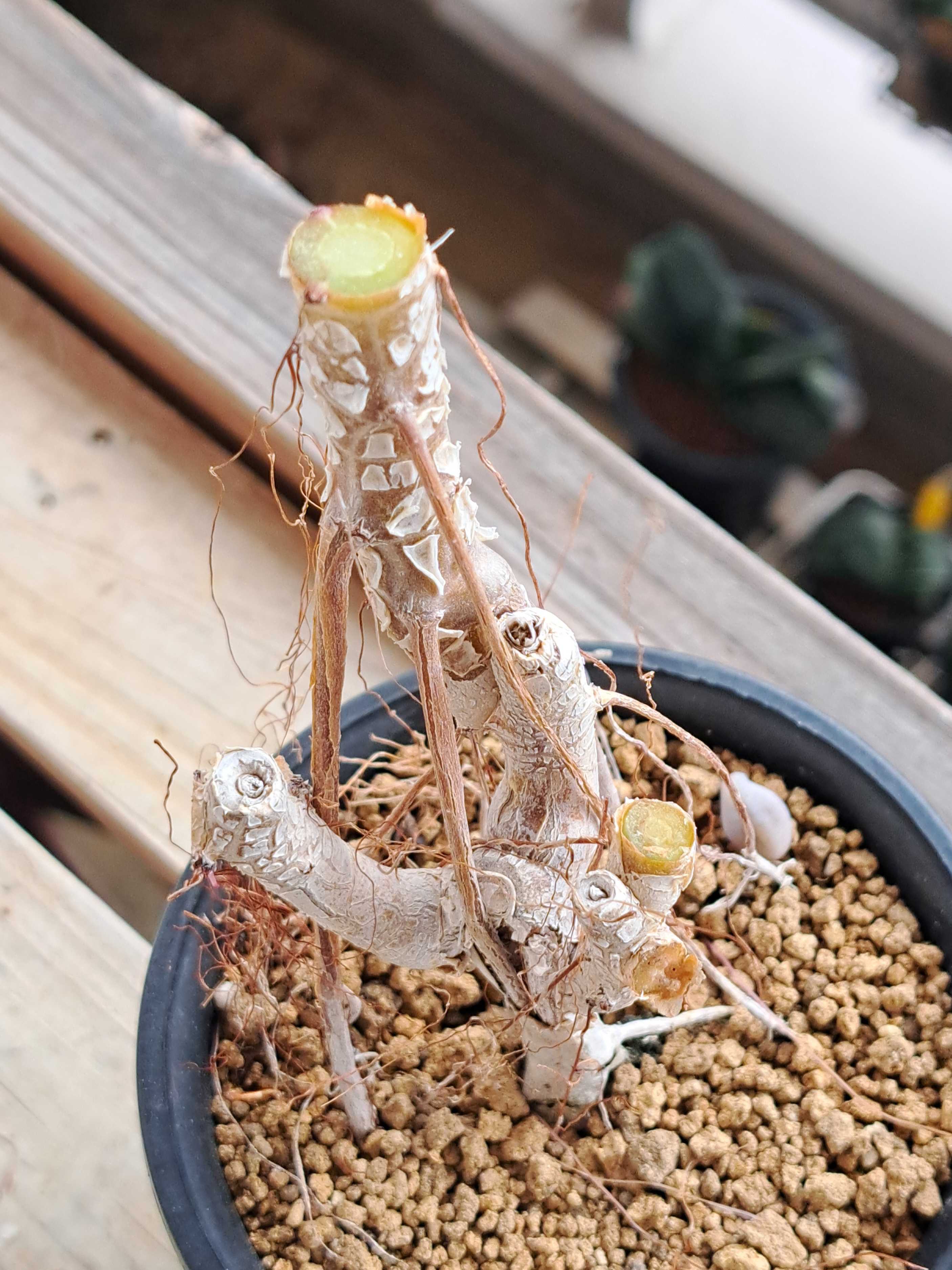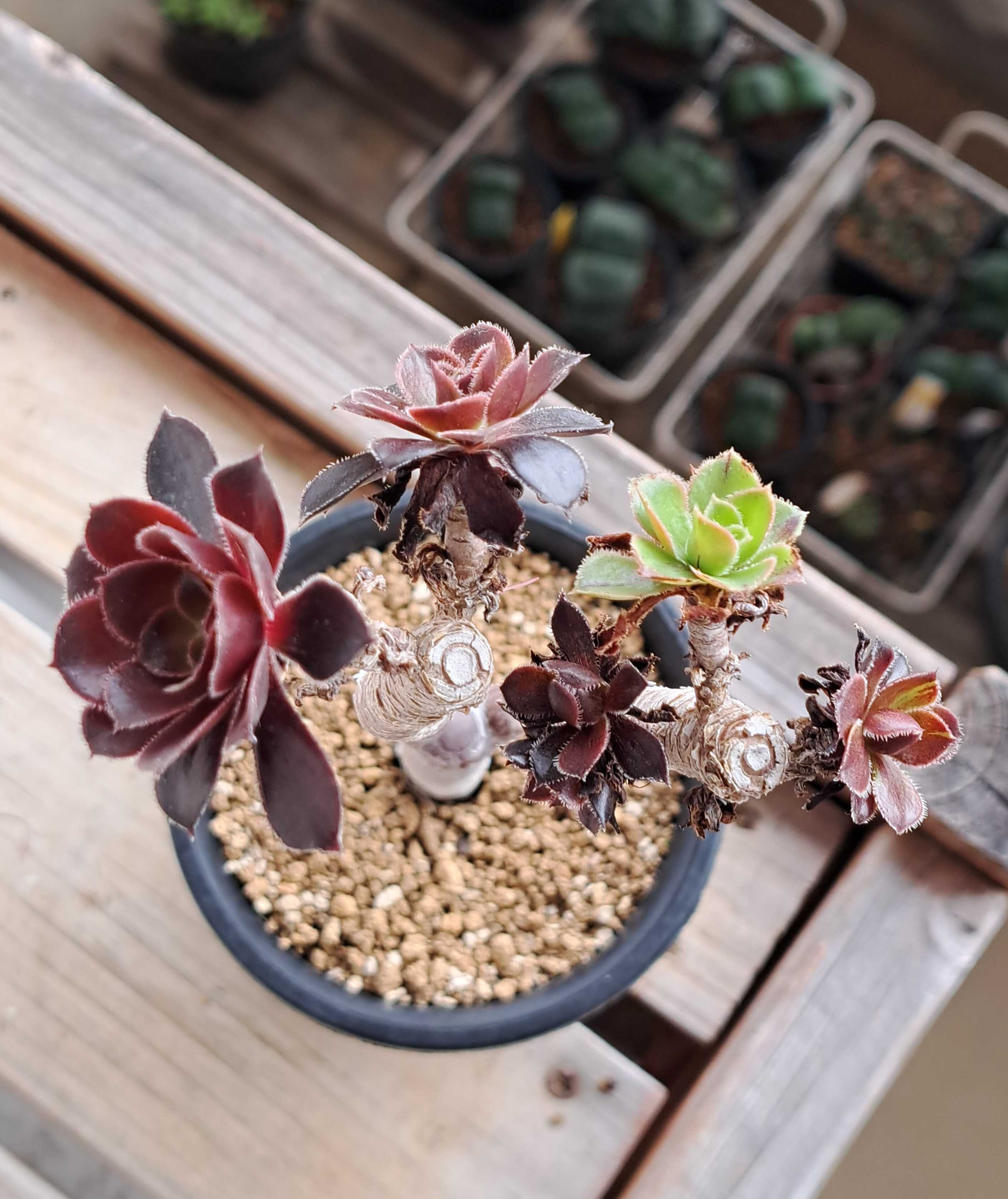 アエオニウムその3は黒法師だ。 気根ボーボー黒法師。 ![]() 生育が悪い。 そもそも気根が出てきたのも茎に異常があるためだと思われる。 ロゼットまで水分や栄養分が上がってこないのだ。 ![]() 全く動いていないわけではない。 ゆっくりとロゼットは成長している。 問題はその成長速度だ。 これが普通。 ![]() 縮こまっていたロゼットが盛り上がり葉が長くなる。 この時期はだいたいこうなのだ。 茎の大元に異常があるため全枝生育不良なのだ。 少し前から思っていたが切っちゃえ。 ![]() 切り口を数日乾かし土に挿す。 残った元の方。 ![]() コイツはもうダメかもしれんが芽が出る可能性もあるので捨てずに持っておく。 二股の黒法師。 枝先はさらに分岐している。 ![]() コイツも通常より生育は悪いが一応動いてはいる様子。 ロゼットは盛り上がり葉が伸びてきた。 ![]() 5個あるロゼット。 中にはミドリのものや黒とミドリが混じるものがいる。 ![]() 以前はもっと黒ミドリ入り交じりが多かったのだがいつの間にかこうなった。 数本の寄せ植え。 ![]() 挿し木をまとめたものだ。 黒っぽいヤツ、赤っぽいヤツ、まだら、いろいろいる。 よく日に当てできるだけ黒く育てたいもんだね。 (多肉植物)アエオニウム 黒法師 2.5〜3号(1ポット) まだら黒法師(マダラクロホウシ) アエオニウム属 多肉植物 9cmポット観葉植物 雑貨 おすすめ インテリア 暮らし 多肉植物 ポット ロゼット 多年草 Aeonium 【黒法師】★ アエオニウム サンシモン ロゼット状の葉 多肉植物 おしゃれ インテリア 贈り物 プレゼント □多肉植物□ センポニウム デスティニー 4号ポット苗 〈アエオニウム(黒法師)×センペルビウムの交配によって生まれた新品種〉 お気に入りの記事を「いいね!」で応援しよう