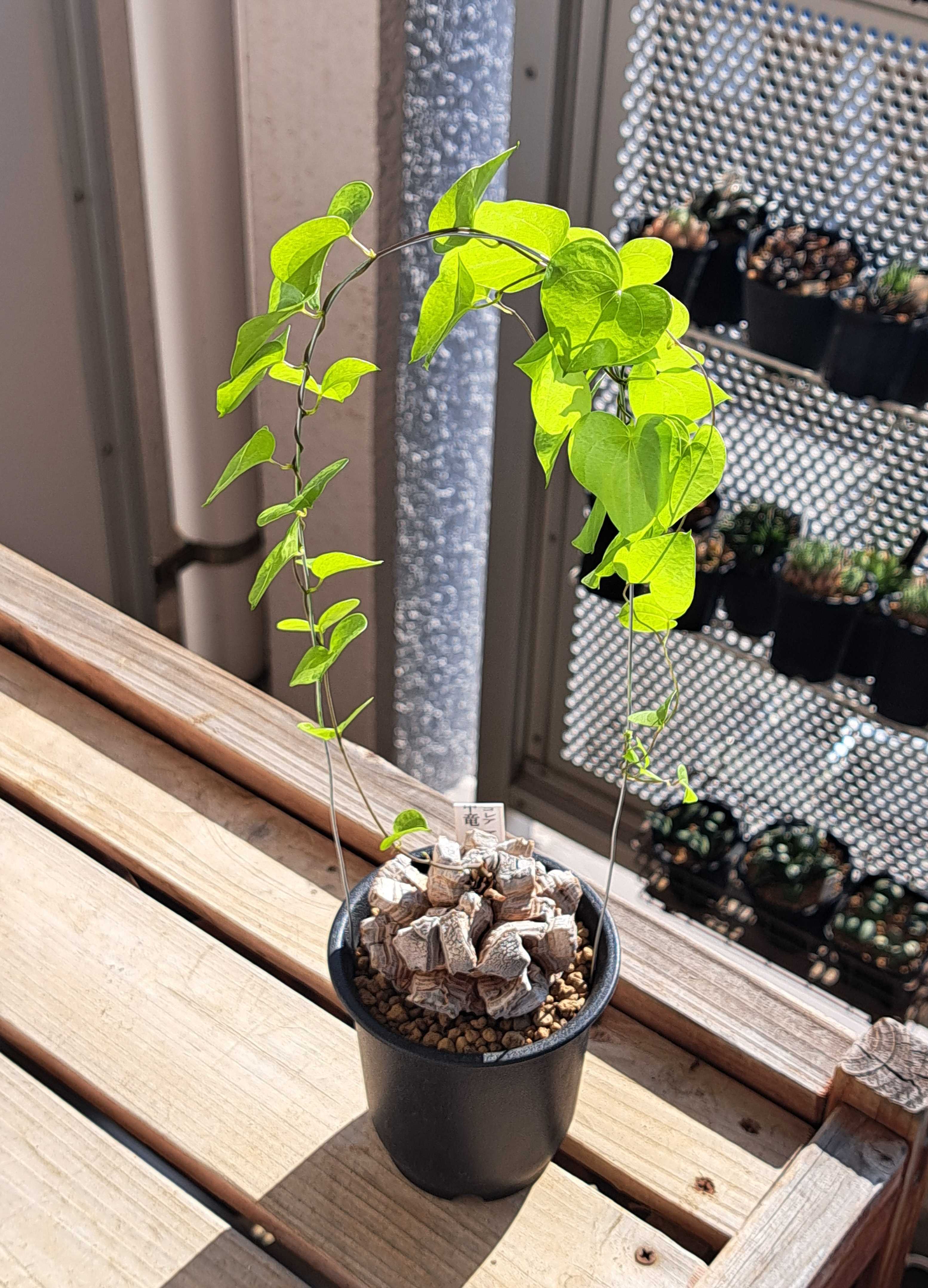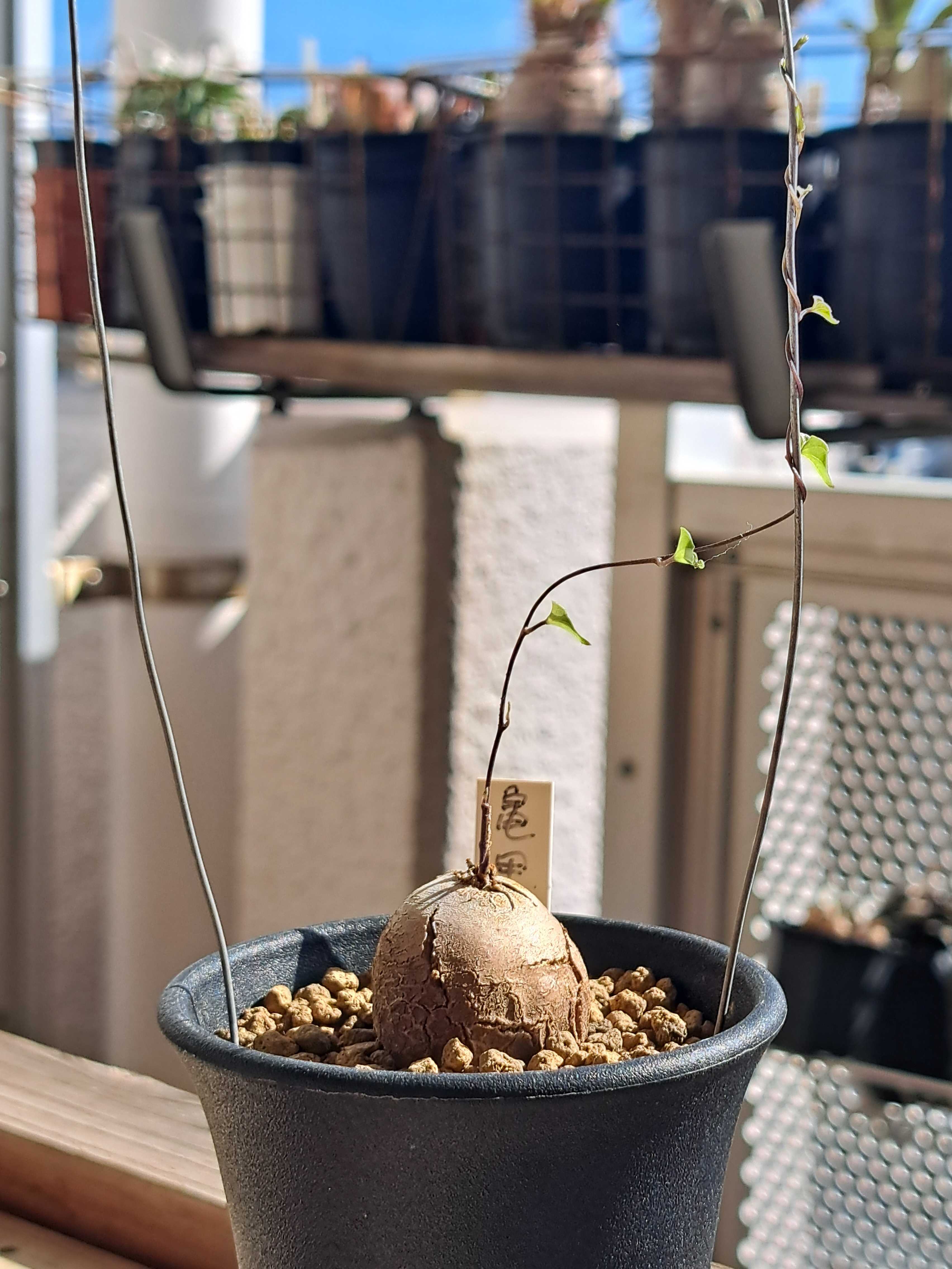 亀甲竜の様子を見よう。 前回撮影時からどう変わったか? 亀甲竜1号。 9月24日。 ![]() 現在。 ![]() 葉が数枚出て終わり。 去年もこんな感じだった。 あまりツルを伸ばさないタイプなのか? 支柱立てているがいらないかもしれない。 ![]() 塊根は依然縦長。 毎年ヒビが入り太っていると思うがまだまだ縦長。 丸くなるにはかなり時間がかかりそうだ。 亀甲竜2号。 9月24日。 ![]() 現在 ![]() 1号より小さいのによくツルを伸ばす。 葉も連なり良い具合。 ![]() 塊根は最初から丸く去年ぐらいからヒビ割れしてきた。 すでにタテにもヨコにもヒビが。 将来有望ではないだろうか。 3号。 9月24日 ![]() 現在。 ![]() ツルが伸び葉もワサワサ。 あっという間だ。 デカい亀甲竜は早いね。 ![]() 塊根の成長も早い。 一年も経つと明らかにデカくなっている。 来年の今ごろにはひとまわりデカくなっていることだろう。 亀甲竜3個。 全てベランダ奥の半日陰的場所。 水は2週に1回たっぷり。 毎年これで問題なく育つ。 春まではずっとこの管理。 すくすくそだってほしい。 アフリカ亀甲竜(アフリカキッコウリュウ) 3.5号サイズ 鉢植え 多肉植物 観葉植物/ディオスコレア:エレファンティペス Mana’s farmのアフリカ亀甲竜実生株 2.5号鉢植え 【現品】アフリカ亀甲竜 3号 黒鉢(36〜40)【選べる観葉植物】【観葉植物/インテリア/おしゃれ/ナチュラル/鉢植え/贈り物/楽天/通販/スモールサイズ/ミニ/ブラック/珍奇植物】 アフリカ亀甲竜 ☆特価☆コーデックス:アフリカ亀甲竜*塊根幅6.5cm 現品!一品限り ☆特価☆コーデックス:アフリカ亀甲竜*塊根幅9cm 現品!一品限り お気に入りの記事を「いいね!」で応援しよう