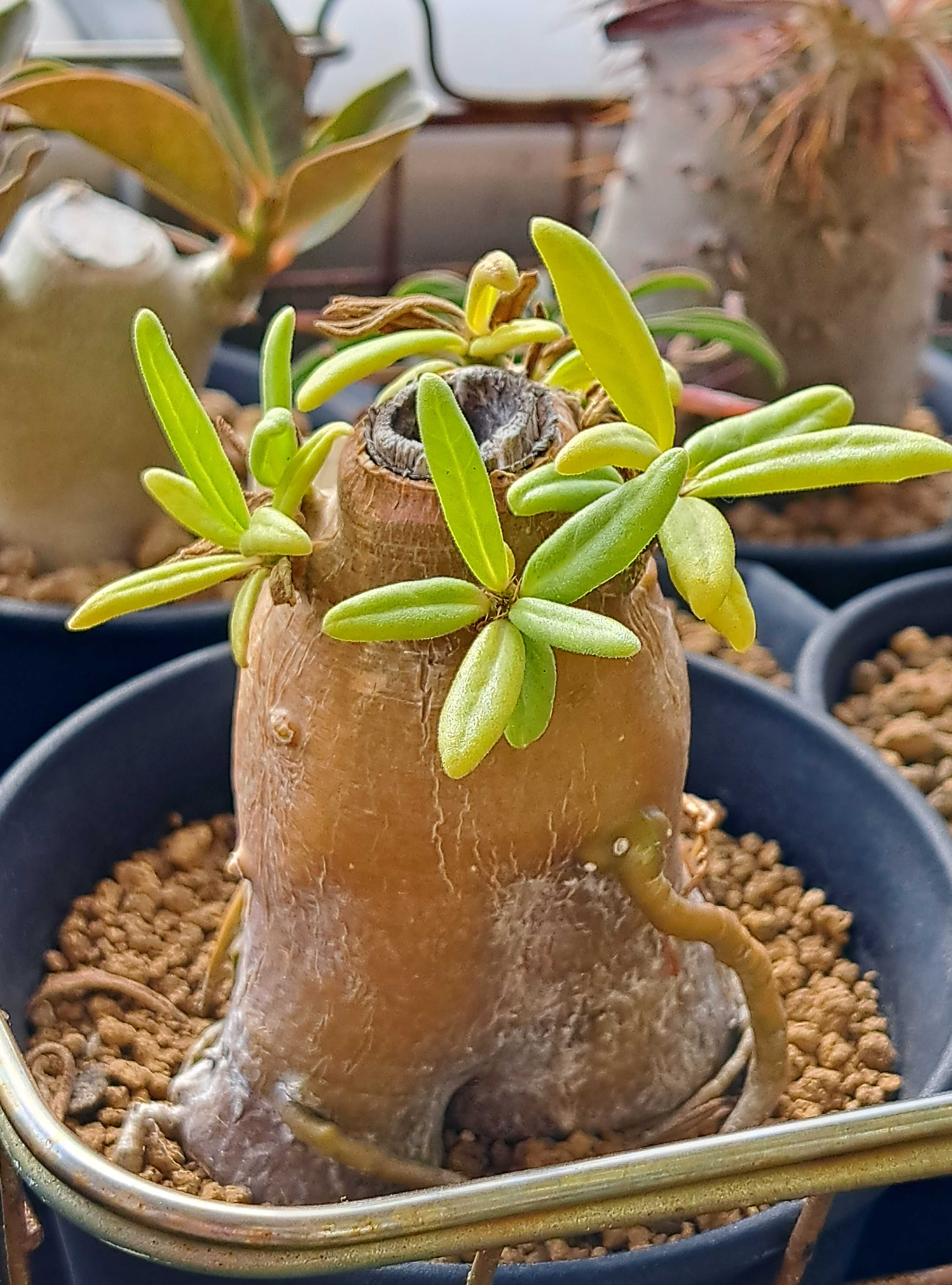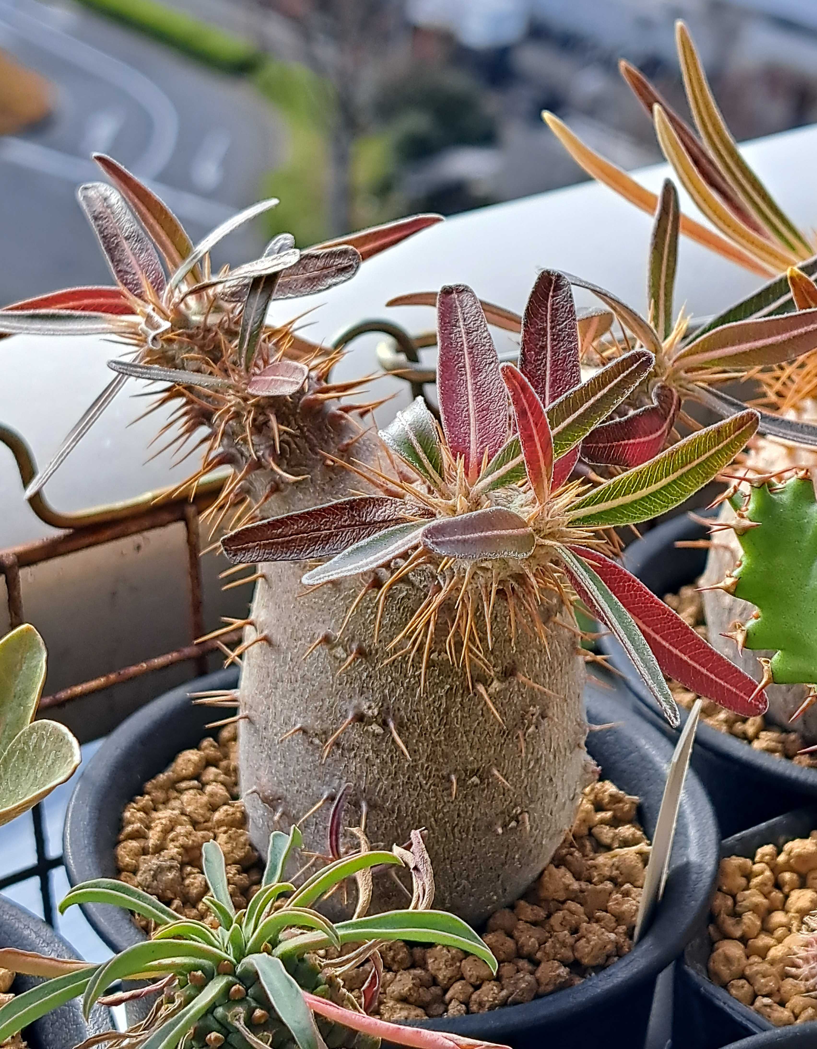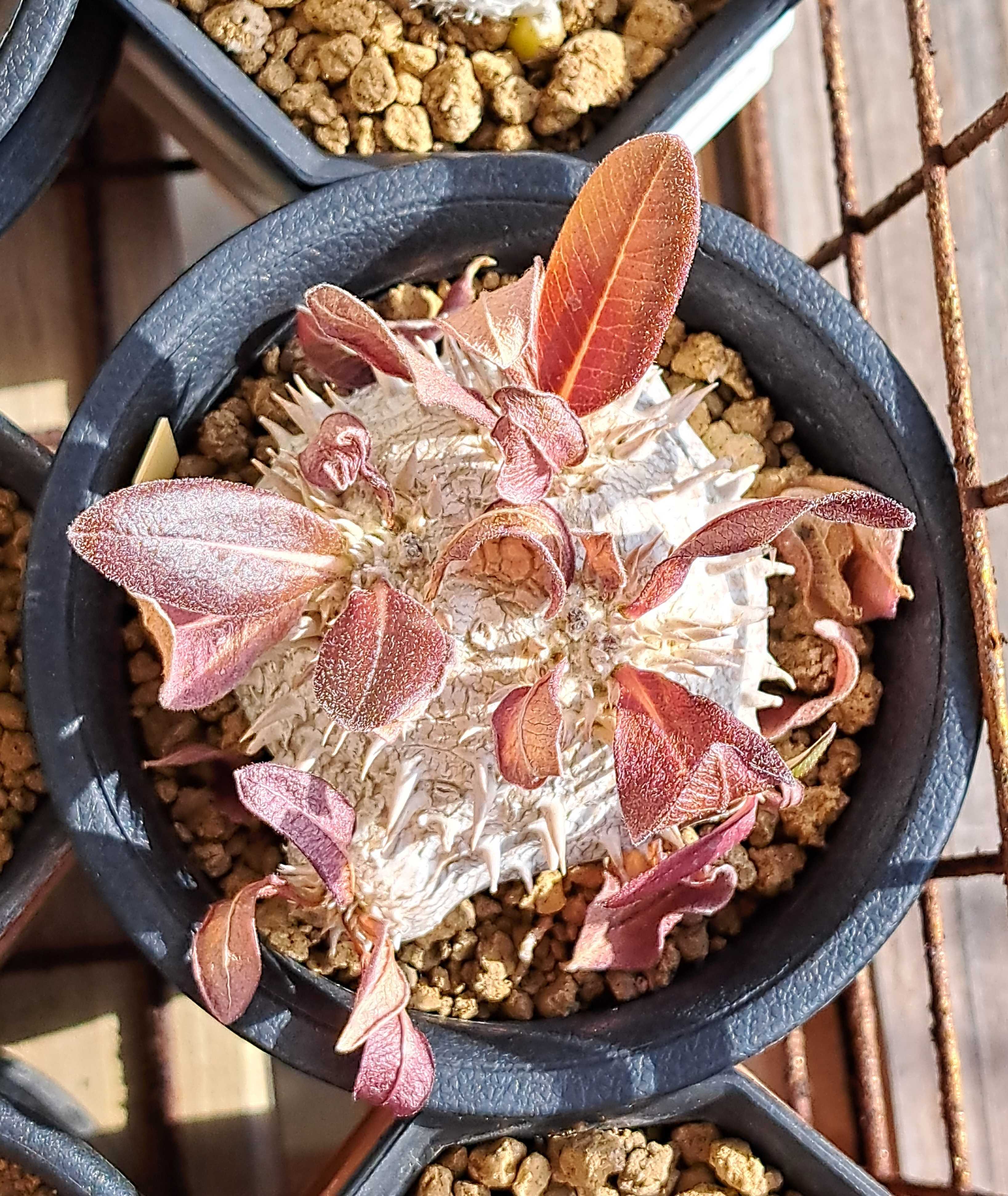 昨日に続いて夜間室内取り込み組の様子を見てみよう。 アデニウム・アラビカムから。 ![]() 朝から夜まで外に出しているが葉はなかなか枯れない。 丸坊主になっているアラビカムもいるし性質がよく分からん。 プセウドリトス・ミギウルティヌス。 ![]() ガガイモは寒さに弱いと聞く。 夜間取り込み5℃以下の低温には当てない方が良さそう。 こぼれ種野郎が一個だけ生き残っているが、 ![]() 越冬できるだろうか? パキポディウム恵比寿笑い。 ![]() 昨日登場したのと別の個体。 一気に紅葉が進み丸坊主一歩手前。 カクチペス。 ![]() コイツもしぶといなー。 まだ葉が残っている。 ま、あと2週間もすれば丸坊主だろうが。 グラキリス。 ![]() 紅葉真っ盛りといったところか。 デカくなるとパキポの落葉は遅くなるようだ。 逆に小っちゃい恵比寿大黒はすでに丸坊主。 ![]() でもこの姿も可愛いなあ。 真っ白の饅頭状でてっぺんにトゲ。 実にいい。 寒さに強いサキュレンタム。 ![]() まだミドリ。 うちにあるパキポの中では最も耐寒性がある。 始動も早く1月か2月には葉を出し始める。 ユーフォルビア・ブレビフォリア。 ![]() コイツもまだ葉がある。 しぶといね。 寒さに強いのかな? バリダ。 ![]() 夏ははっきりしなかったストライプがくっきり。 寒いとこうなるのか。 峨眉山。 ![]() ある程度の葉は枯れるが完全丸坊主まではいかず冬を越す。 ある程度の耐寒性はあるようだ。 夜間室内取り込み組。 結構な数があり出したり入れたり面倒くさいが仕方がない。 極寒のとき以外は引き続き出したり入れたりする。 5℃以上あるかどうかが目安だ。 (多肉植物)プセウドリトス ミギウルティヌス 2.5号(1鉢) ☆特価☆多肉植物:ユーフォルビア バリダ*S 幅4.5cm ☆赤松実生 ☆特価☆多肉植物:ユーフォルビア バリダ*M 幅6cm ユーフォルビア・峨眉山 9cm鉢 カクタス長田 日本作出交配種 仔吹き群生株トウダイグサ科 多肉植物 コーデックス 塊根植物 珍奇植物 峨眉山 お気に入りの記事を「いいね!」で応援しよう