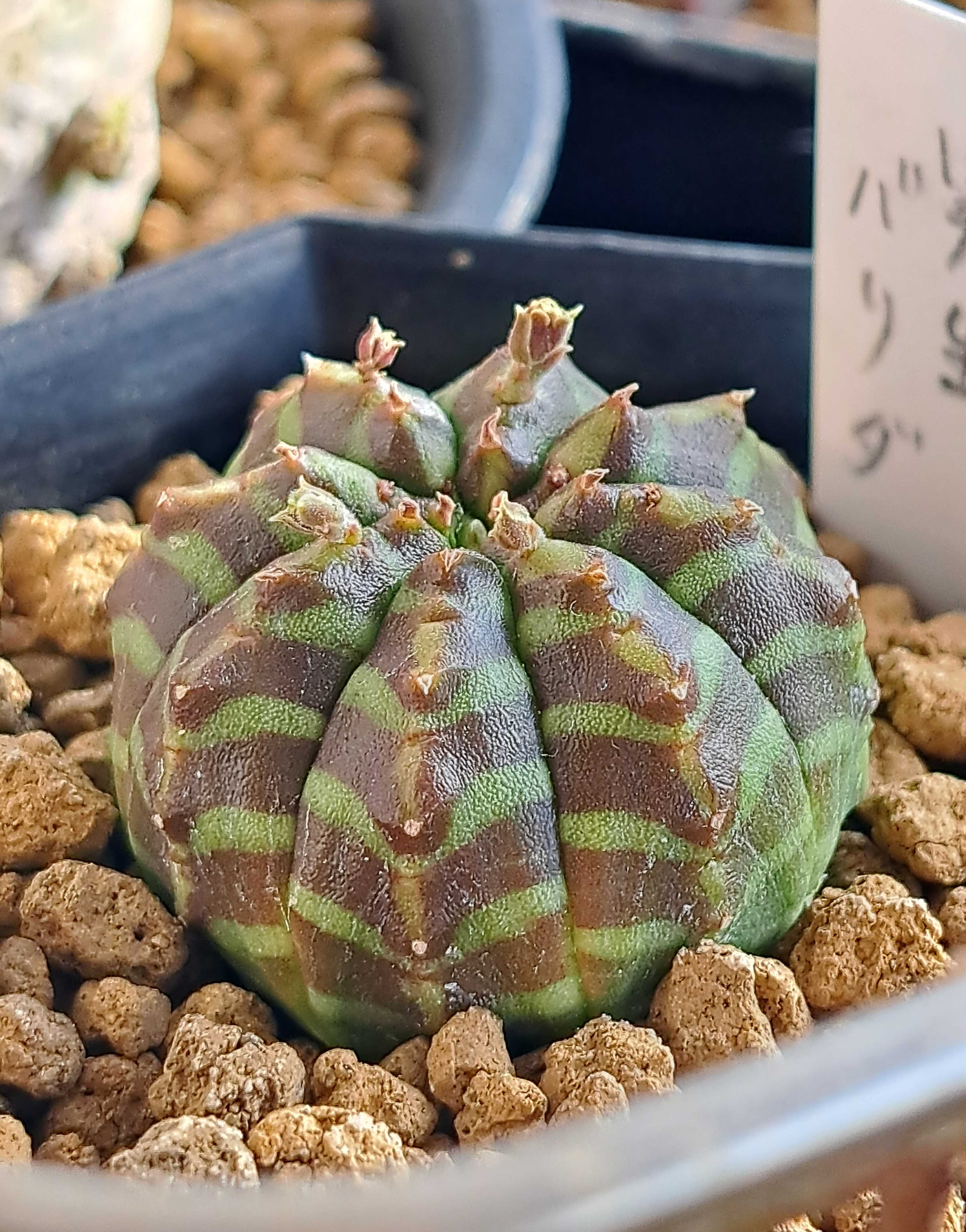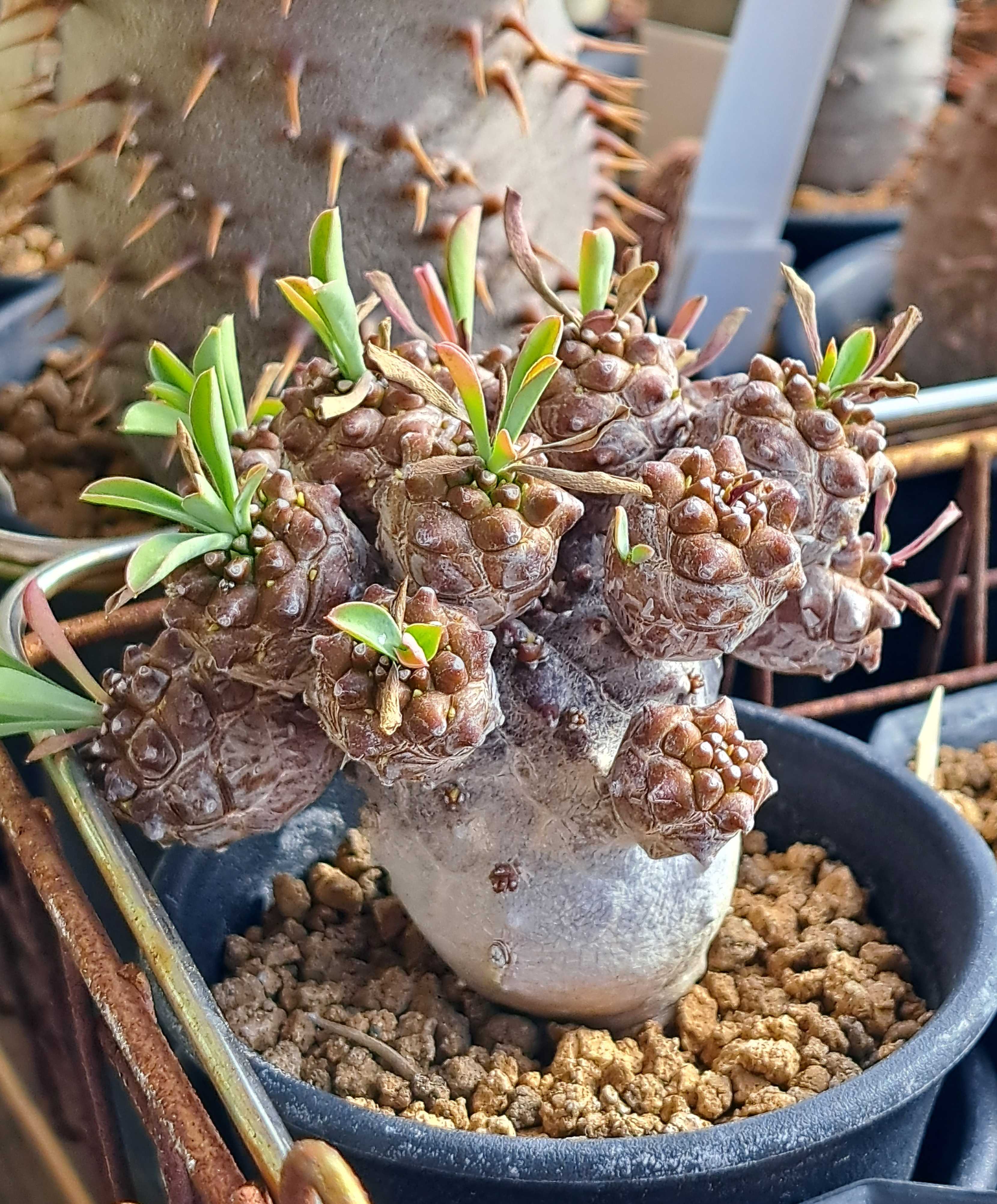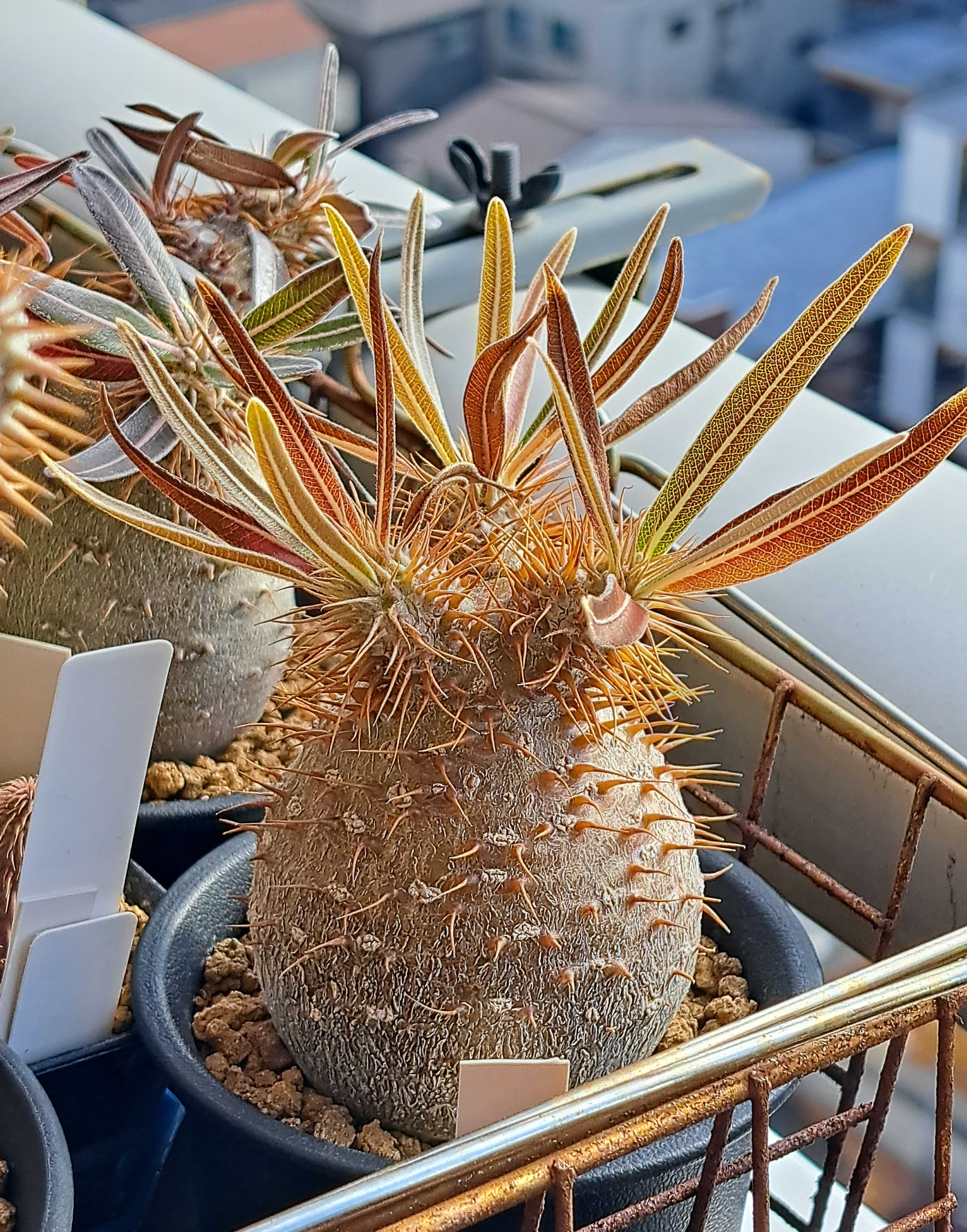 昨日に続いて夜間室内取り込み組の様子を見てみよう。 アデニウム・アラビカムから。 ![]() 朝から夜まで外に出しているが葉はなかなか枯れない。 丸坊主になっているアラビカムもいるし性質がよく分からん。 プセウドリトス・ミギウルティヌス。 ![]() ガガイモは寒さに弱いと聞く。 夜間取り込み5℃以下の低温には当てない方が良さそう。 こぼれ種野郎が一個だけ生き残っているが、 ![]() 越冬できるだろうか? パキポディウム恵比寿笑い。 ![]() 昨日登場したのと別の個体。 一気に紅葉が進み丸坊主一歩手前。 カクチペス。 ![]() コイツもしぶといなー。 まだ葉が残っている。 ま、あと2週間もすれば丸坊主だろうが。 グラキリス。 ![]() 紅葉真っ盛りといったところか。 デカくなるとパキポの落葉は遅くなるようだ。 逆に小っちゃい恵比寿大黒はすでに丸坊主。 ![]() でもこの姿も可愛いなあ。 真っ白の饅頭状でてっぺんにトゲ。 実にいい。 寒さに強いサキュレンタム。 ![]() まだミドリ。 うちにあるパキポの中では最も耐寒性がある。 始動も早く1月か2月には葉を出し始める。 ユーフォルビア・ブレビフォリア。 ![]() コイツもまだ葉がある。 しぶといね。 寒さに強いのかな? バリダ。 ![]() 夏ははっきりしなかったストライプがくっきり。 寒いとこうなるのか。 峨眉山。 ![]() ある程度の葉は枯れるが完全丸坊主まではいかず冬を越す。 ある程度の耐寒性はあるようだ。 夜間室内取り込み組。 結構な数があり出したり入れたり面倒くさいが仕方がない。 極寒のとき以外は引き続き出したり入れたりする。 5℃以上あるかどうかが目安だ。 (多肉植物)プセウドリトス ミギウルティヌス 2.5号(1鉢) ☆特価☆多肉植物:ユーフォルビア バリダ*S 幅4.5cm ☆赤松実生 ☆特価☆多肉植物:ユーフォルビア バリダ*M 幅6cm ユーフォルビア・峨眉山 9cm鉢 カクタス長田 日本作出交配種 仔吹き群生株トウダイグサ科 多肉植物 コーデックス 塊根植物 珍奇植物 峨眉山 お気に入りの記事を「いいね!」で応援しよう