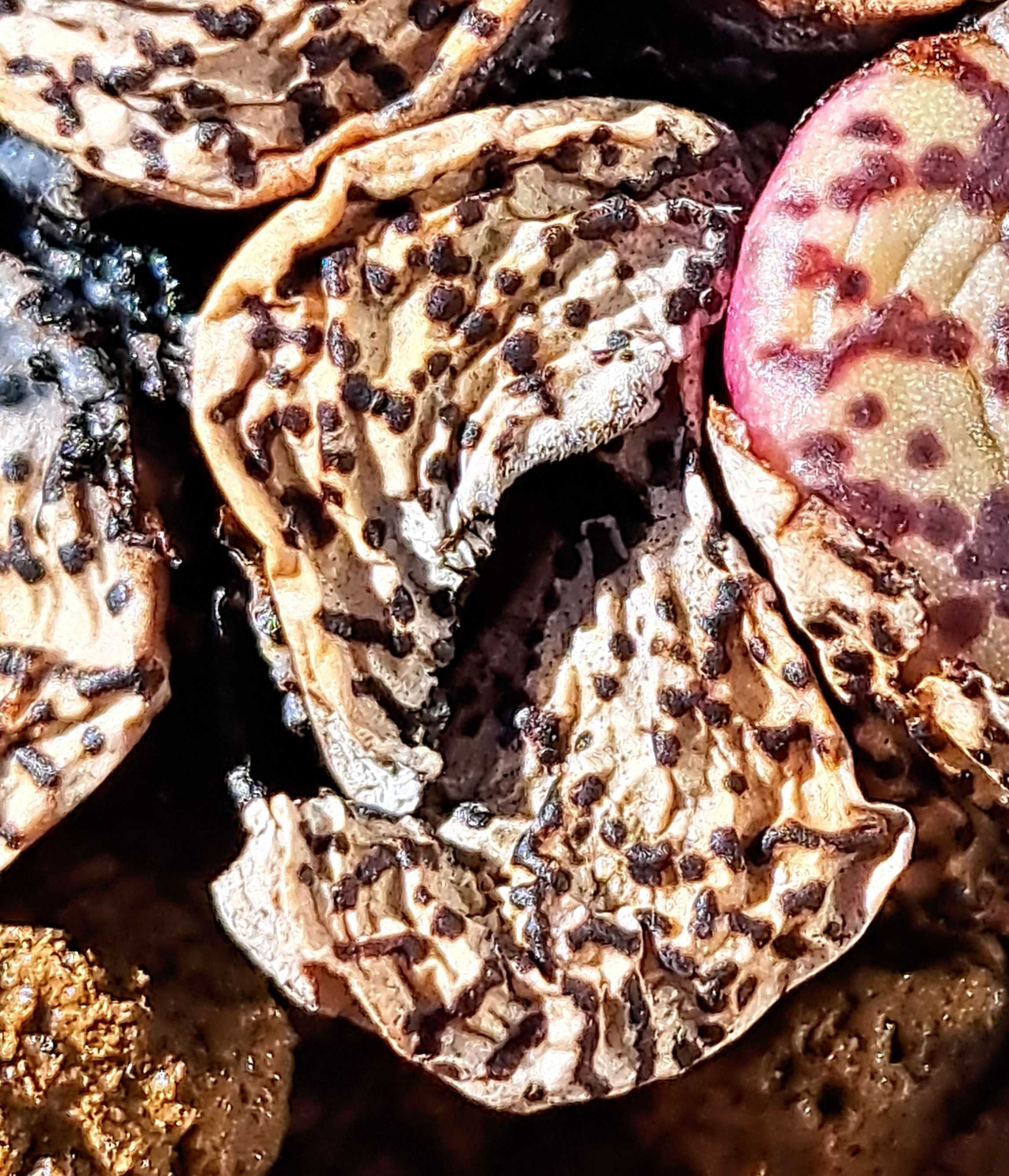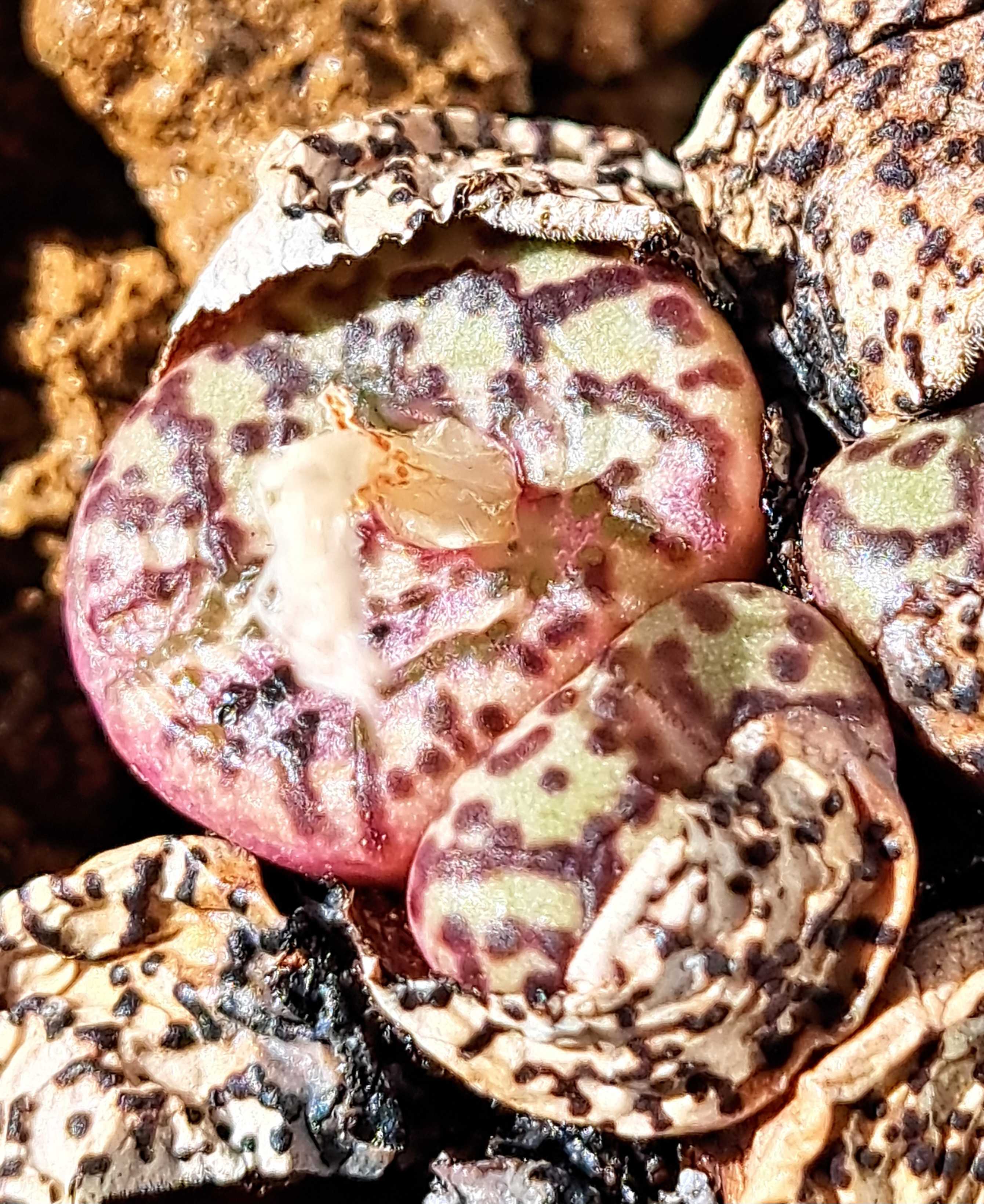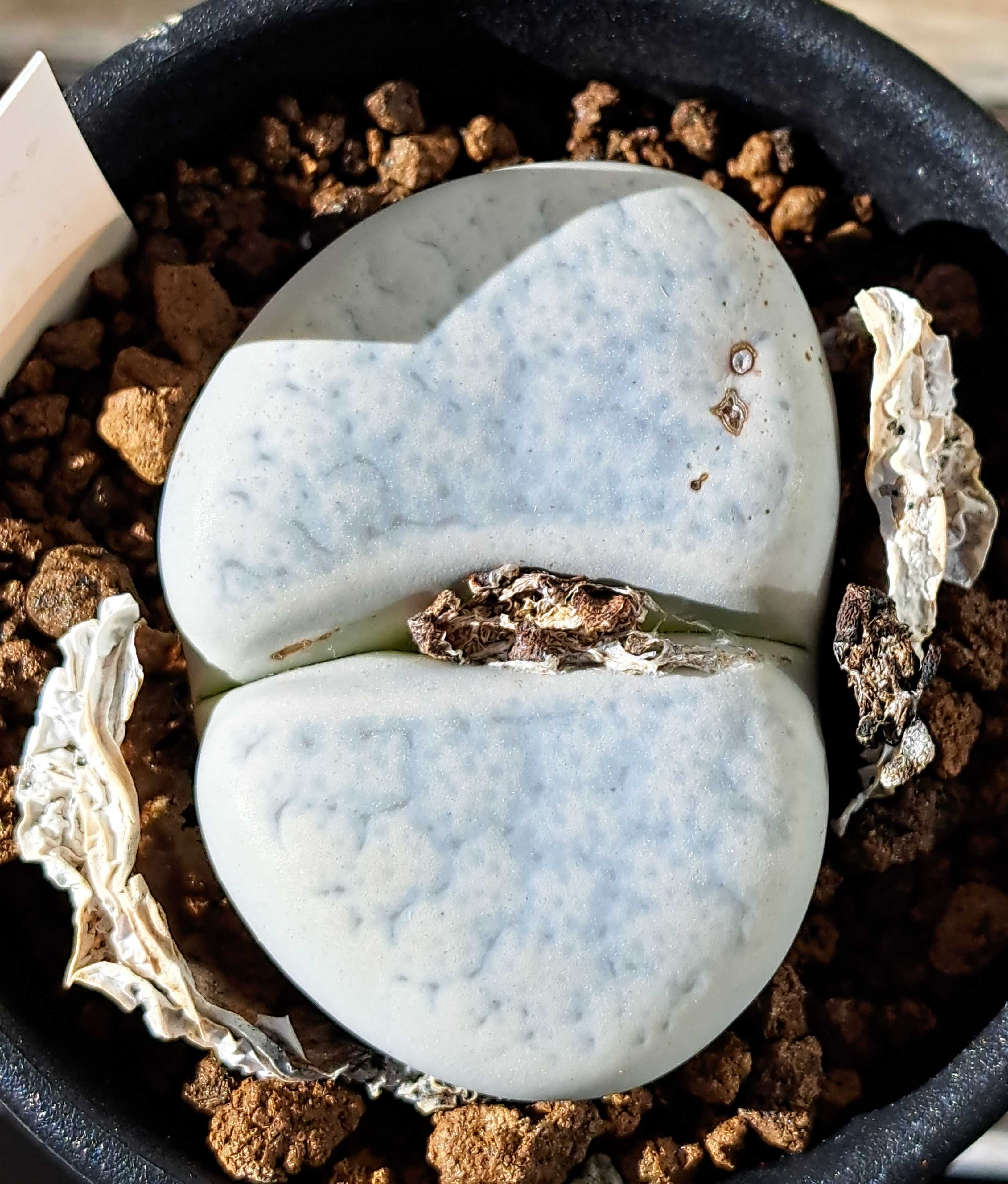 メセンの様子をいくつか見てみよう。 まずはプレイオスピロス帝玉。 ![]() すでに脱皮が始まっている。 早ええ~。 リトープスと似ているから同じ時期に脱皮するのかと思っていたよ。 だいぶ早いのね。 ![]() 新葉も徐々に大きくなっていく。 1月ぐらいには旧葉と同じぐらいまでいくのかね? よく分からん。 コノフィツム・ムンダム。 ![]() コノフィツムの脱皮はは春ごろ始まって秋に終わる。 今年は夏に腐ってしまったつぶが出た。 ![]() 暑さで溶けてしまったのだろう。 旧葉の中は空洞。 不気味だ。 こっちは無事脱皮したつぶ。 ![]() 分頭している。 コノフィツムはよく分頭する。 倍々に増えていく感じ。 あ、でもコイツは違うな。 ウィッテベルゲンセ。 ![]() 今年は分頭していない。 去年は確か全て分頭し倍になったはず。 毎年するわけではないのね。 ![]() なかなか面白い模様と色合い。 薄いブルーグリーンにパープルというあまり見かけない配色。 リトープス・ボルキー。 ![]() リトは春先に脱皮が始まる。 今は内部で新葉が育っている時期。 外見は変わらないが成長期なのだ。 白花黄紫勲。 ![]() 春の脱皮で分頭し2頭→4頭へ。 だが両方とも片方が小っちゃい。 旧葉と花殻が汚いね。 そのうち取ってやるかな。 多肉植物:メセン プレイオスピロス 帝玉 ネリー*幅3cm ☆赤松実生 プレイオスピロス・帝玉 7.5cm鉢 カクタス長田 ハマミズナ科 ネリー 冬型メセン 脱皮植物 ぺブルプランツ 多肉植物 珍奇植物 農園直売 多肉植物 コノフィツム属 紫帝玉 メセン 観葉植物 インテリア 多肉専門VERVE 紫帝玉 メセン ビザールプランツ 多肉植物 サボテン アガベ 塊根植物 ユーフォルビア 寄せ植え インテリア 観葉植物 おしゃれ 雑貨 お気に入りの記事を「いいね!」で応援しよう