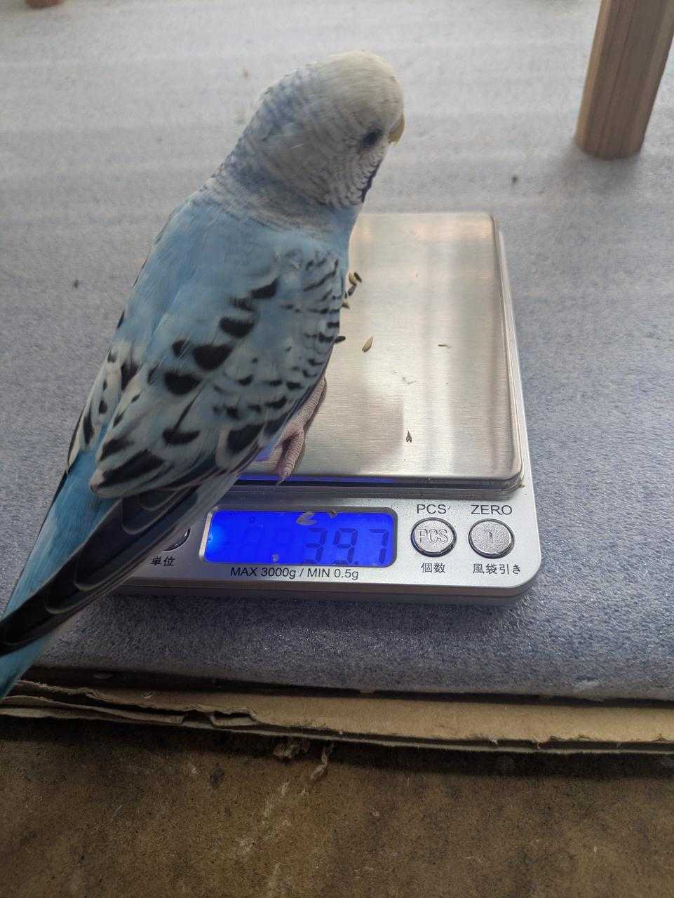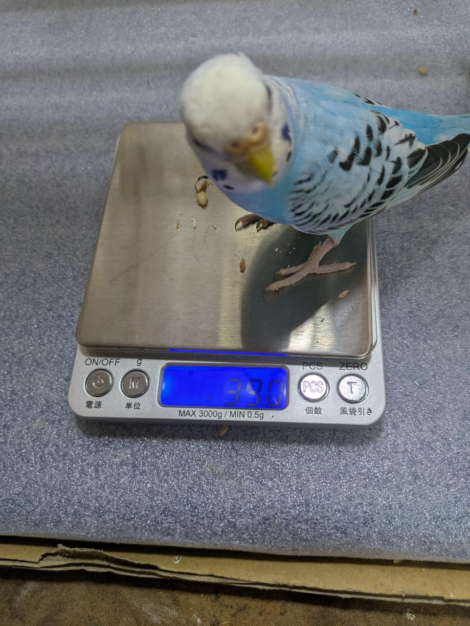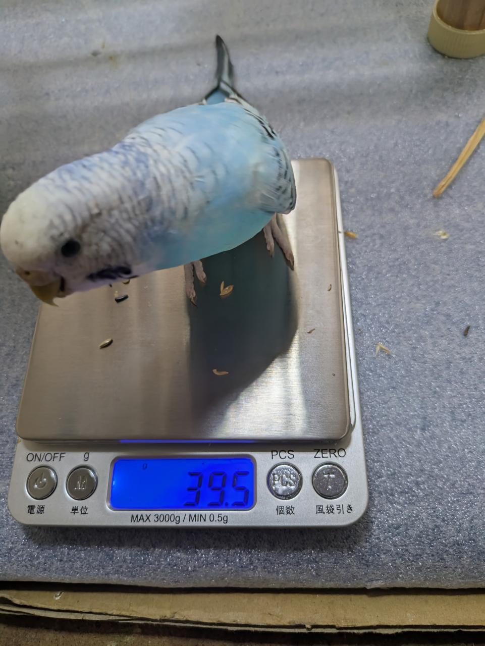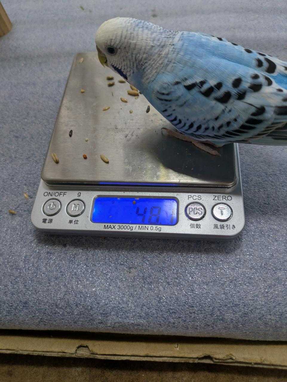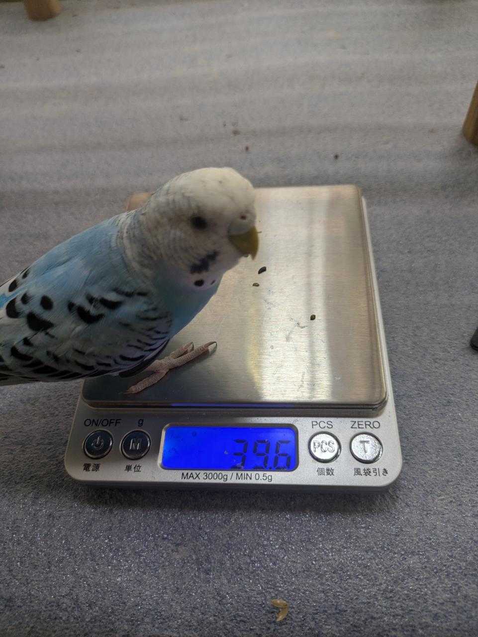 減り続けていた体重もそろそろ落ち着いてきたようです。換羽もだいぶ抜け羽毛も減ってきて換羽期も終盤なのでしょうか。39g台。いつもこのあたりが体重の下限で48g台が体重の上限のように思います。このように10gの体重の増減があってもいたってぴぃちゃんは変わらず元気で過ごしています。おそらく緩やかな体重の上下限はそれほど大きな負担になっていないように思われます。病気などではやはり急激な増加や減少が起こるのでしょう。毎日体重を計ることでこうした変化も見過ごすことなく察知することも出来ますね。このところぴぃちゃんの部屋の温度も夕方になると14℃辺りまで下がって来ましたのでなんとかケージに戻そうと奮闘するのですが逃げ回るは口を大きく開けて噛みついてくるはでにっちもさっちも行きません。エアコンがなくて暖房はガスファンヒーターなのですが夜中じゅう点けっぱなしにしておくことも出来ません。おそらく深夜や朝方はもうすでに10℃を下回ると思いますのでなんとか夜だけでもケージに戻したいのですが・・・。(ケージには鳥さん用のヒーターがあり20℃設定にしています。)苦戦中です!!家のぴぃちゃんですが、現在1歳と3ヶ月になりますが目の周りのアイリスリングがあるかないかぐらいの程度でジィーっと見るとあるようなないような・・。鼻の上のロウ膜も薄っすら青みが掛かったり肌色ぽかったりしてオスなのかメスなのかもよく分かりませんが、聞いたところによると1歳を過ぎて卵を産まなかったらオスだとか・・。にほんブログ村にほんブログ村