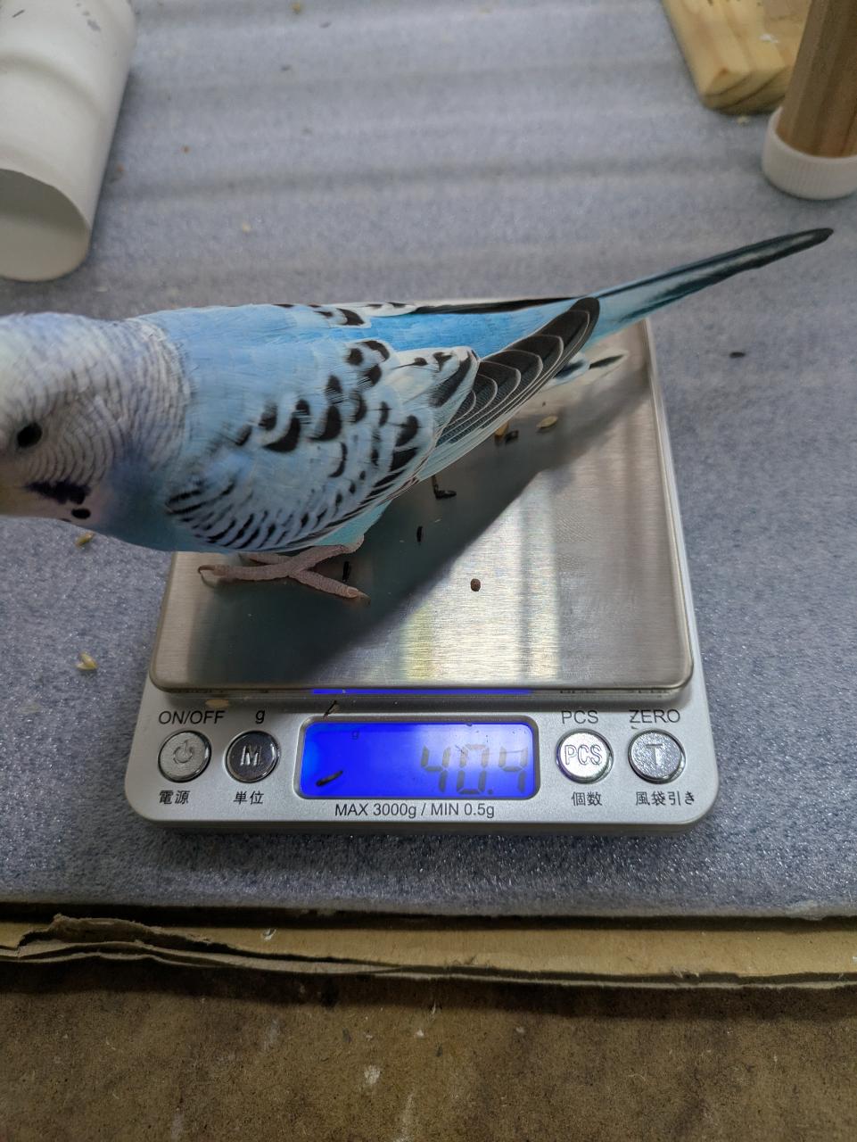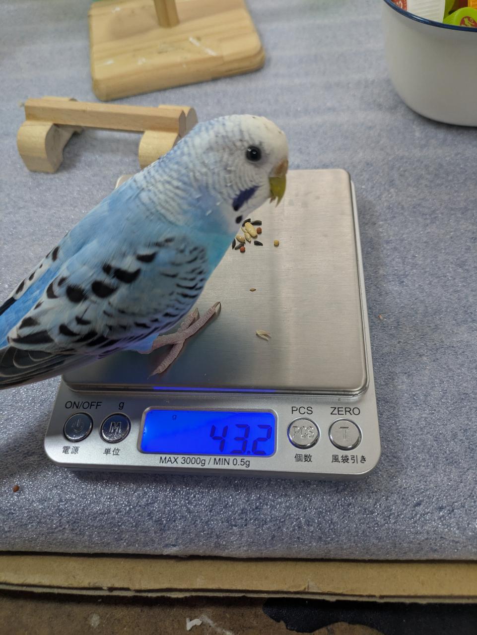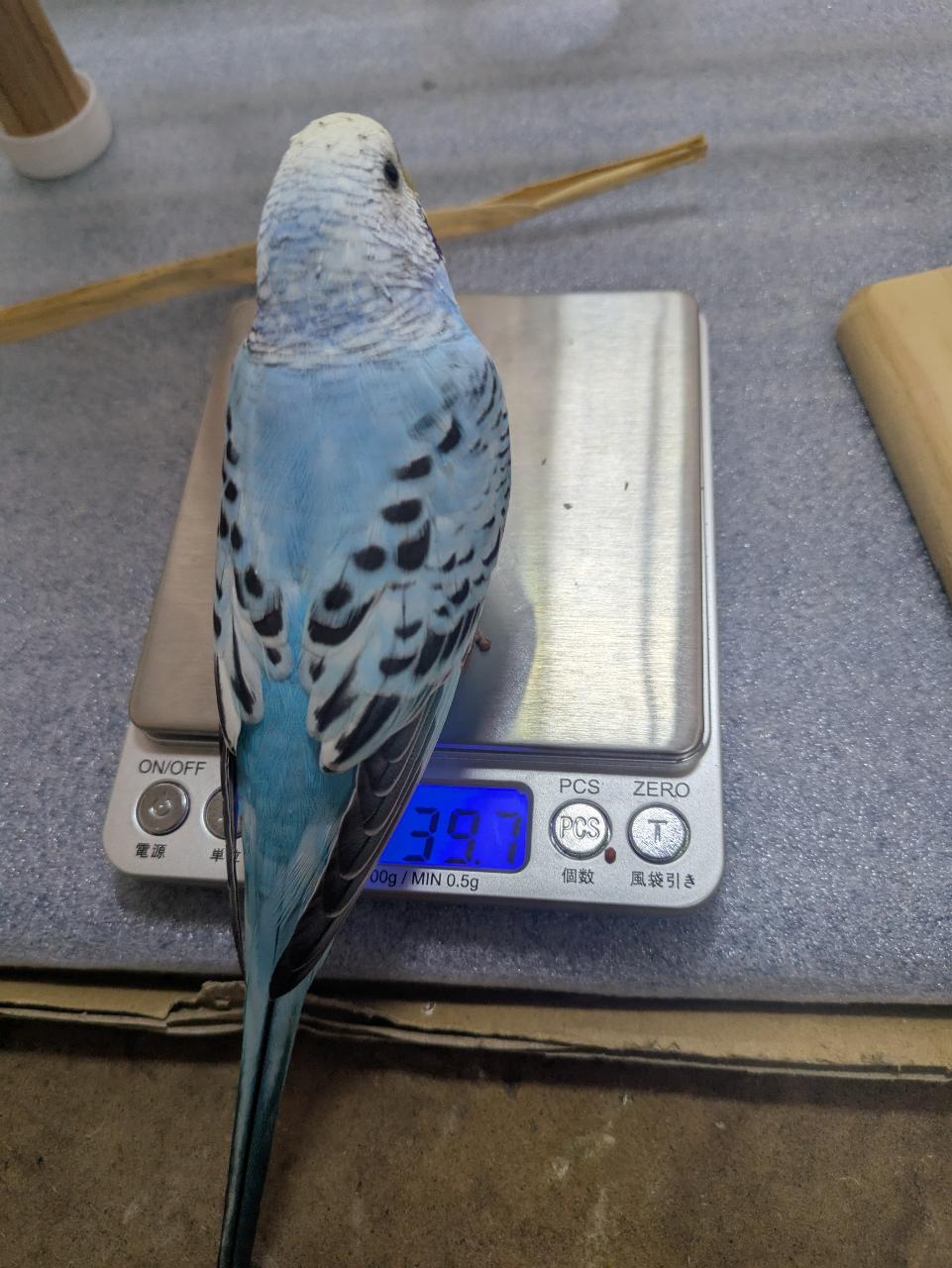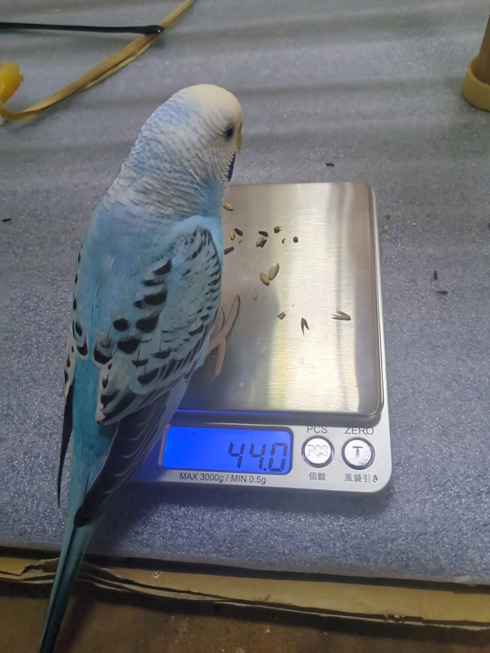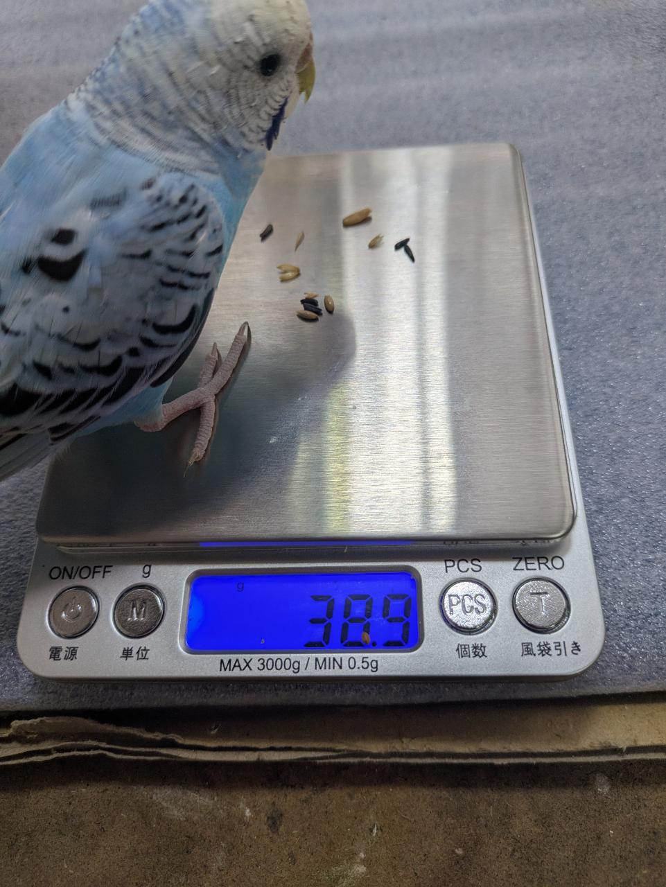 減り続けていた体重もそろそろ落ち着いてきたようです。換羽もだいぶ抜け羽毛も減ってきて換羽期も終盤なのでしょうか。39g台。いつもこのあたりが体重の下限で48g台が体重の上限のように思います。このように10gの体重の増減があってもいたってぴぃちゃんは変わらず元気で過ごしています。おそらく緩やかな体重の上下限はそれほど大きな負担になっていないように思われます。病気などではやはり急激な増加や減少が起こるのでしょう。毎日体重を計ることでこうした変化も見過ごすことなく察知することも出来ますね。このところぴぃちゃんの部屋の温度も夕方になると14℃辺りまで下がって来ましたのでなんとかケージに戻そうと奮闘するのですが逃げ回るは口を大きく開けて噛みついてくるはでにっちもさっちも行きません。エアコンがなくて暖房はガスファンヒーターなのですが夜中じゅう点けっぱなしにしておくことも出来ません。おそらく深夜や朝方はもうすでに10℃を下回ると思いますのでなんとか夜だけでもケージに戻したいのですが・・・。(ケージには鳥さん用のヒーターがあり20℃設定にしています。)苦戦中です!!家のぴぃちゃんですが、現在1歳と3ヶ月になりますが目の周りのアイリスリングがあるかないかぐらいの程度でジィーっと見るとあるようなないような・・。鼻の上のロウ膜も薄っすら青みが掛かったり肌色ぽかったりしてオスなのかメスなのかもよく分かりませんが、聞いたところによると1歳を過ぎて卵を産まなかったらオスだとか・・。にほんブログ村にほんブログ村