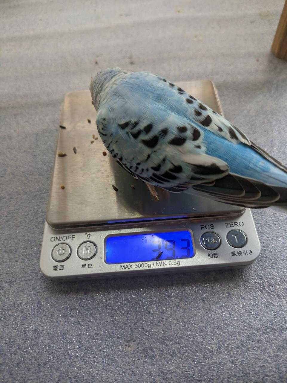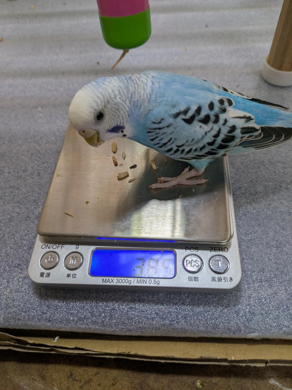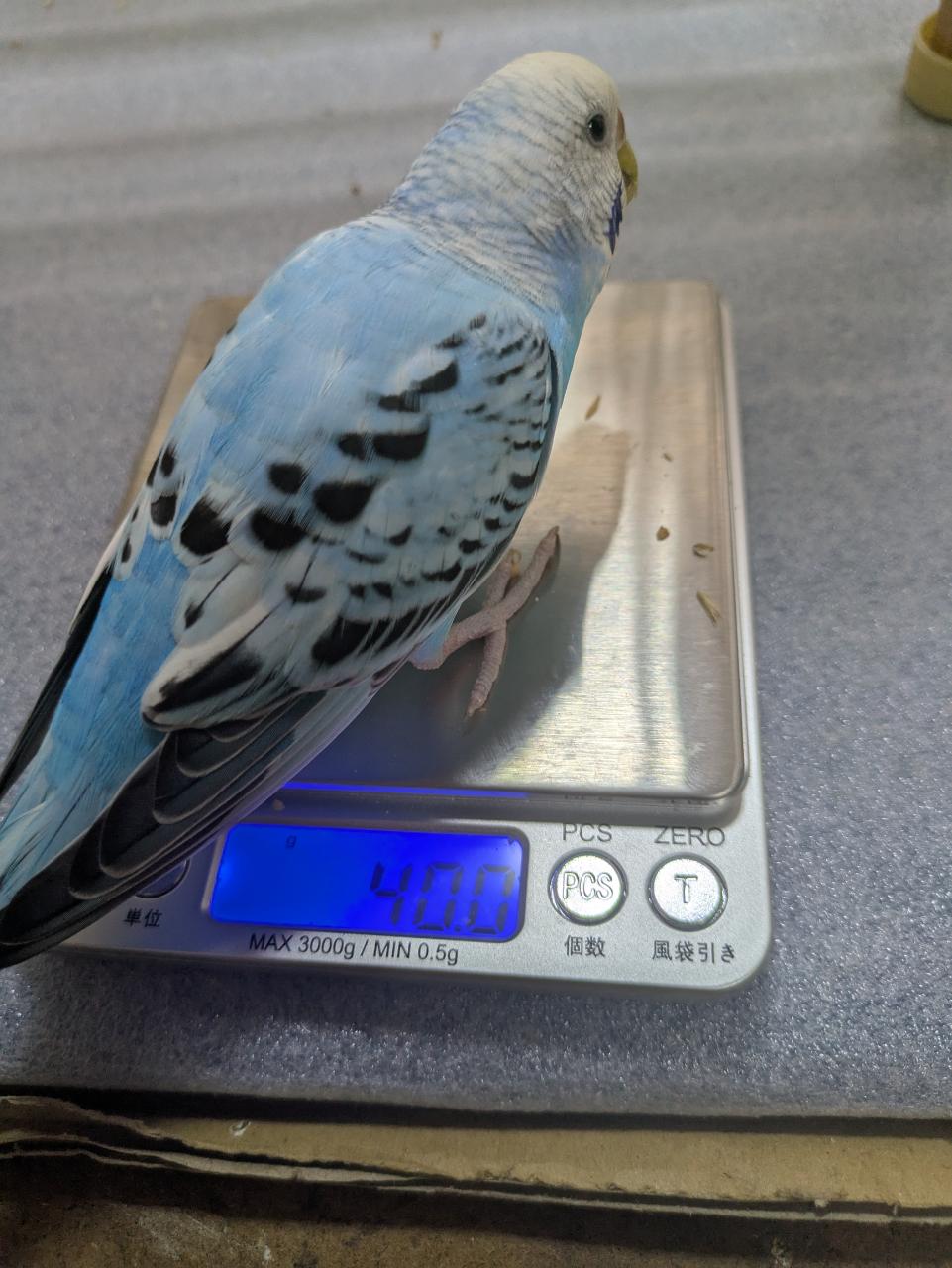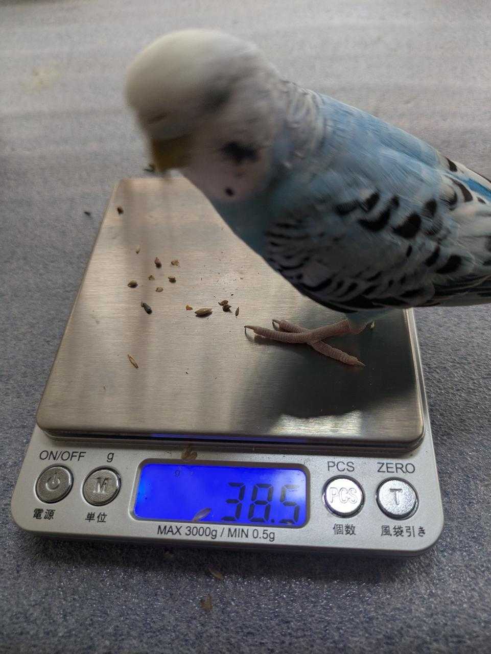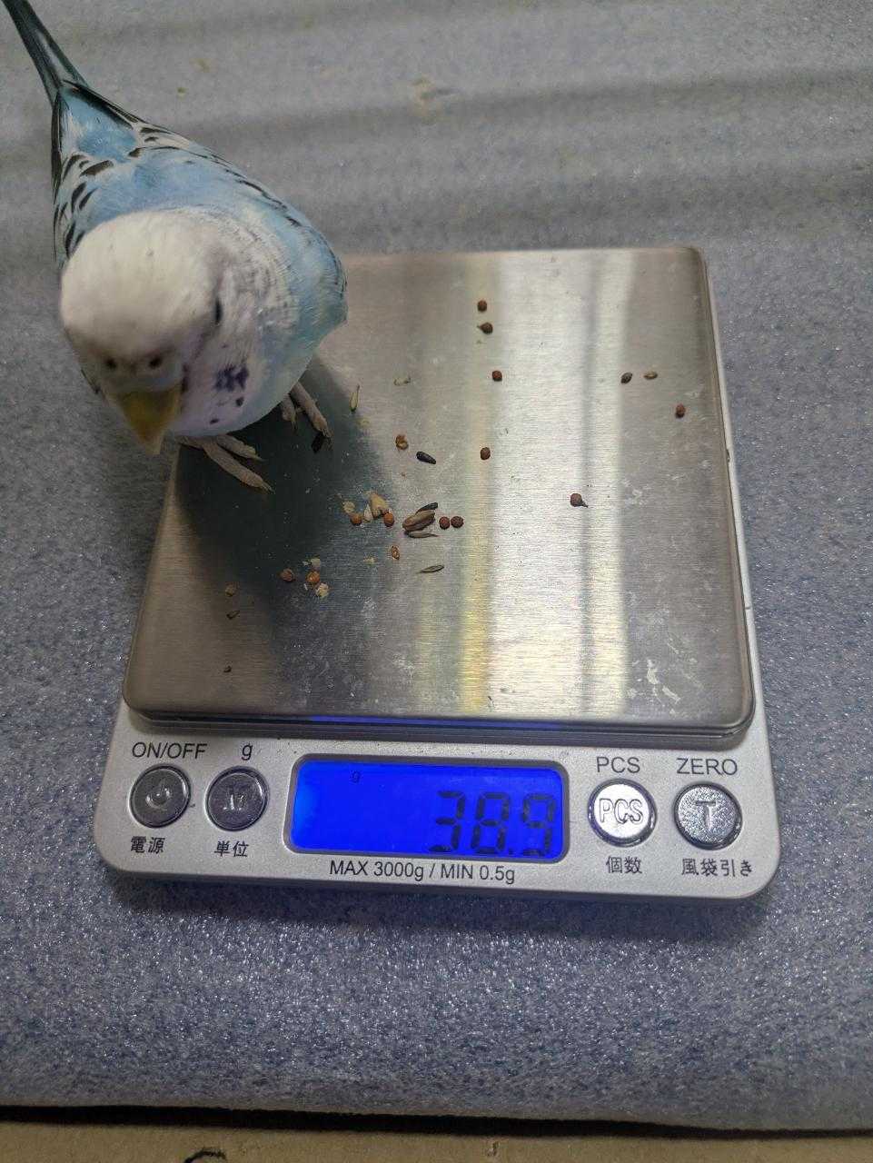 減り続けていた体重もそろそろ落ち着いてきたようです。換羽もだいぶ抜け羽毛も減ってきて換羽期も終盤なのでしょうか。39g台。いつもこのあたりが体重の下限で48g台が体重の上限のように思います。このように10gの体重の増減があってもいたってぴぃちゃんは変わらず元気で過ごしています。おそらく緩やかな体重の上下限はそれほど大きな負担になっていないように思われます。病気などではやはり急激な増加や減少が起こるのでしょう。毎日体重を計ることでこうした変化も見過ごすことなく察知することも出来ますね。このところぴぃちゃんの部屋の温度も夕方になると14℃辺りまで下がって来ましたのでなんとかケージに戻そうと奮闘するのですが逃げ回るは口を大きく開けて噛みついてくるはでにっちもさっちも行きません。エアコンがなくて暖房はガスファンヒーターなのですが夜中じゅう点けっぱなしにしておくことも出来ません。おそらく深夜や朝方はもうすでに10℃を下回ると思いますのでなんとか夜だけでもケージに戻したいのですが・・・。(ケージには鳥さん用のヒーターがあり20℃設定にしています。)苦戦中です!!家のぴぃちゃんですが、現在1歳と3ヶ月になりますが目の周りのアイリスリングがあるかないかぐらいの程度でジィーっと見るとあるようなないような・・。鼻の上のロウ膜も薄っすら青みが掛かったり肌色ぽかったりしてオスなのかメスなのかもよく分かりませんが、聞いたところによると1歳を過ぎて卵を産まなかったらオスだとか・・。にほんブログ村にほんブログ村