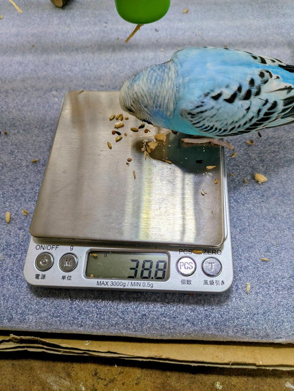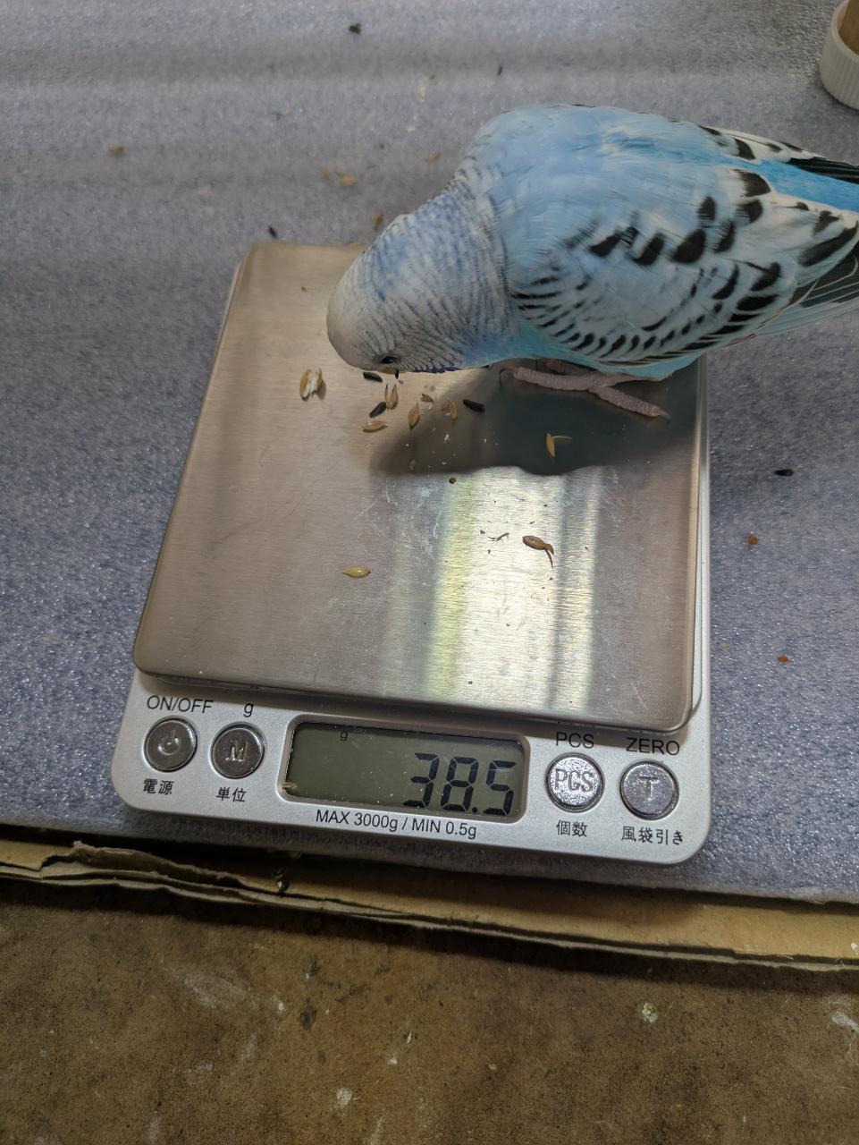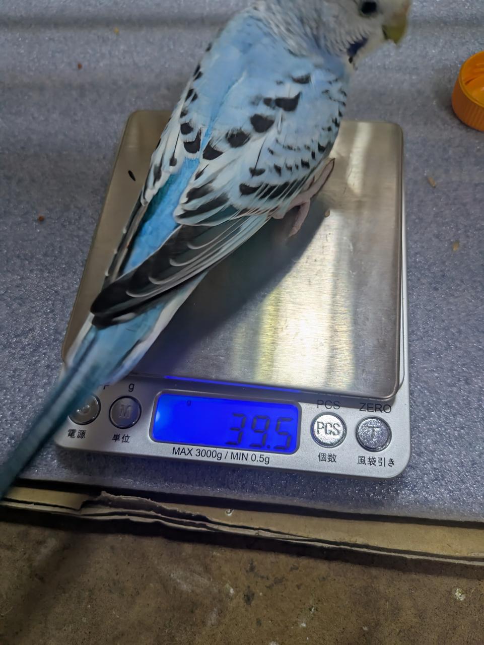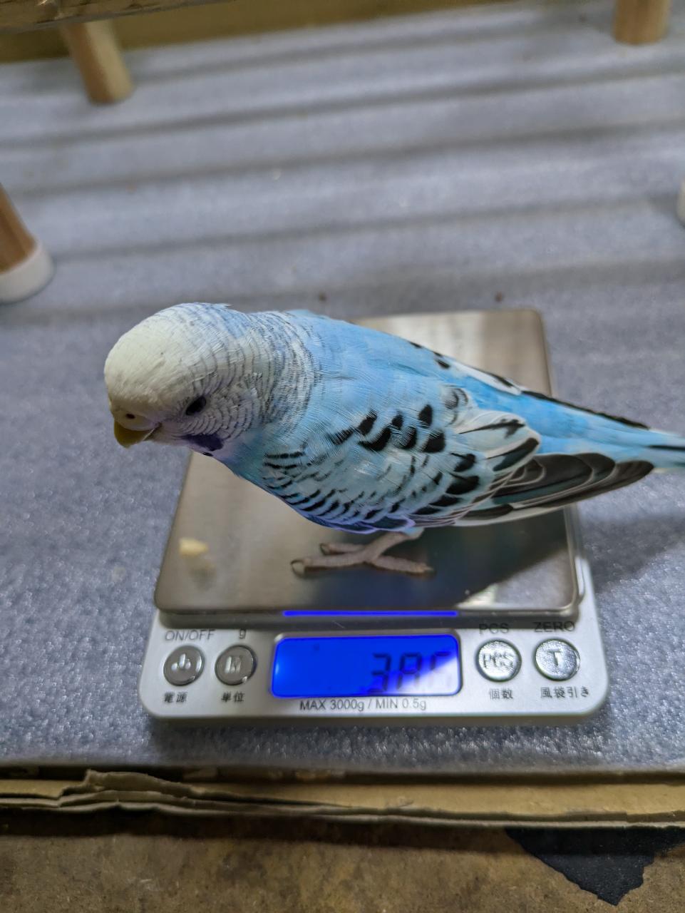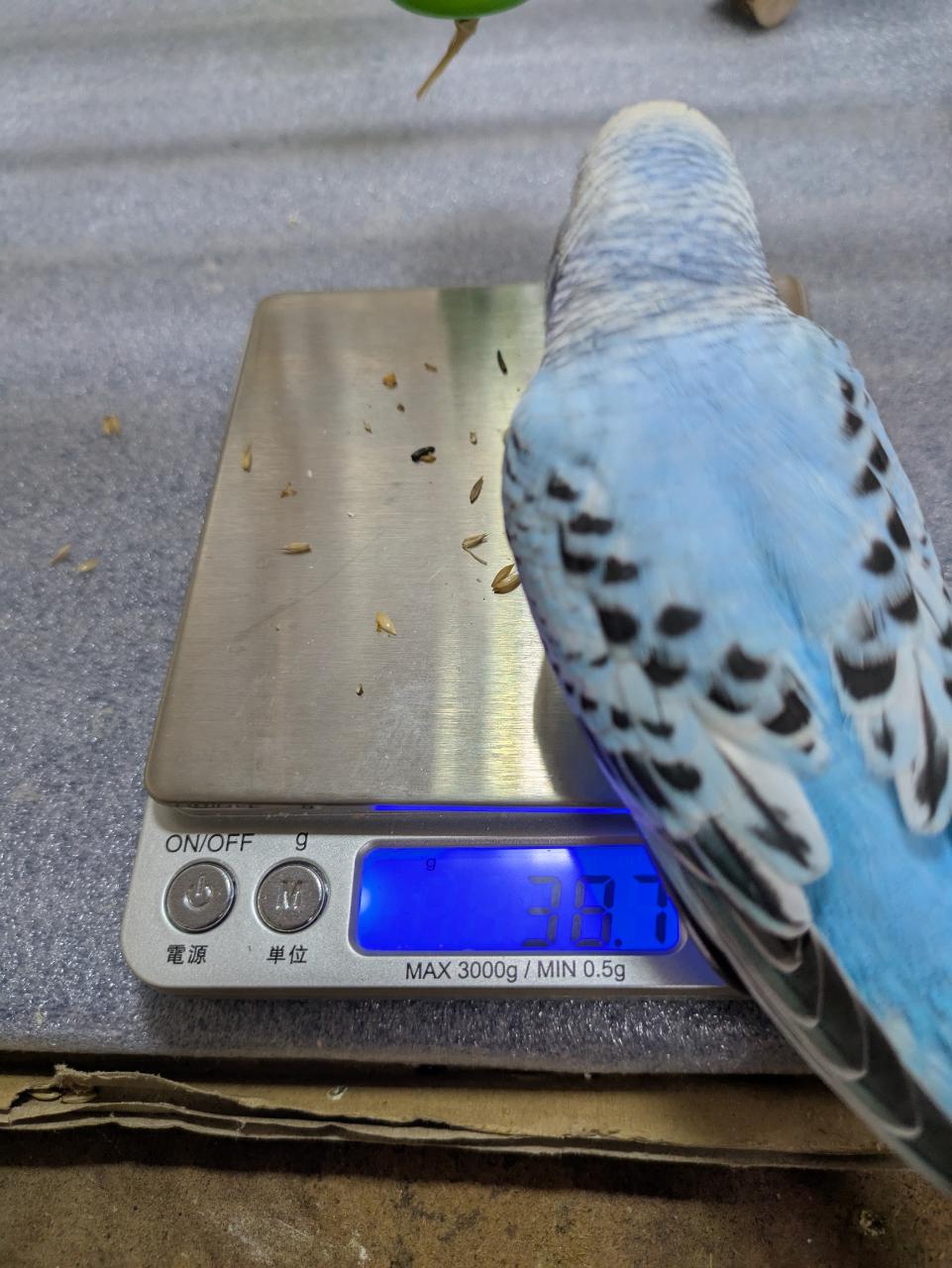 減り続けていた体重もそろそろ落ち着いてきたようです。換羽もだいぶ抜け羽毛も減ってきて換羽期も終盤なのでしょうか。39g台。いつもこのあたりが体重の下限で48g台が体重の上限のように思います。このように10gの体重の増減があってもいたってぴぃちゃんは変わらず元気で過ごしています。おそらく緩やかな体重の上下限はそれほど大きな負担になっていないように思われます。病気などではやはり急激な増加や減少が起こるのでしょう。毎日体重を計ることでこうした変化も見過ごすことなく察知することも出来ますね。このところぴぃちゃんの部屋の温度も夕方になると14℃辺りまで下がって来ましたのでなんとかケージに戻そうと奮闘するのですが逃げ回るは口を大きく開けて噛みついてくるはでにっちもさっちも行きません。エアコンがなくて暖房はガスファンヒーターなのですが夜中じゅう点けっぱなしにしておくことも出来ません。おそらく深夜や朝方はもうすでに10℃を下回ると思いますのでなんとか夜だけでもケージに戻したいのですが・・・。(ケージには鳥さん用のヒーターがあり20℃設定にしています。)苦戦中です!!家のぴぃちゃんですが、現在1歳と3ヶ月になりますが目の周りのアイリスリングがあるかないかぐらいの程度でジィーっと見るとあるようなないような・・。鼻の上のロウ膜も薄っすら青みが掛かったり肌色ぽかったりしてオスなのかメスなのかもよく分かりませんが、聞いたところによると1歳を過ぎて卵を産まなかったらオスだとか・・。にほんブログ村にほんブログ村