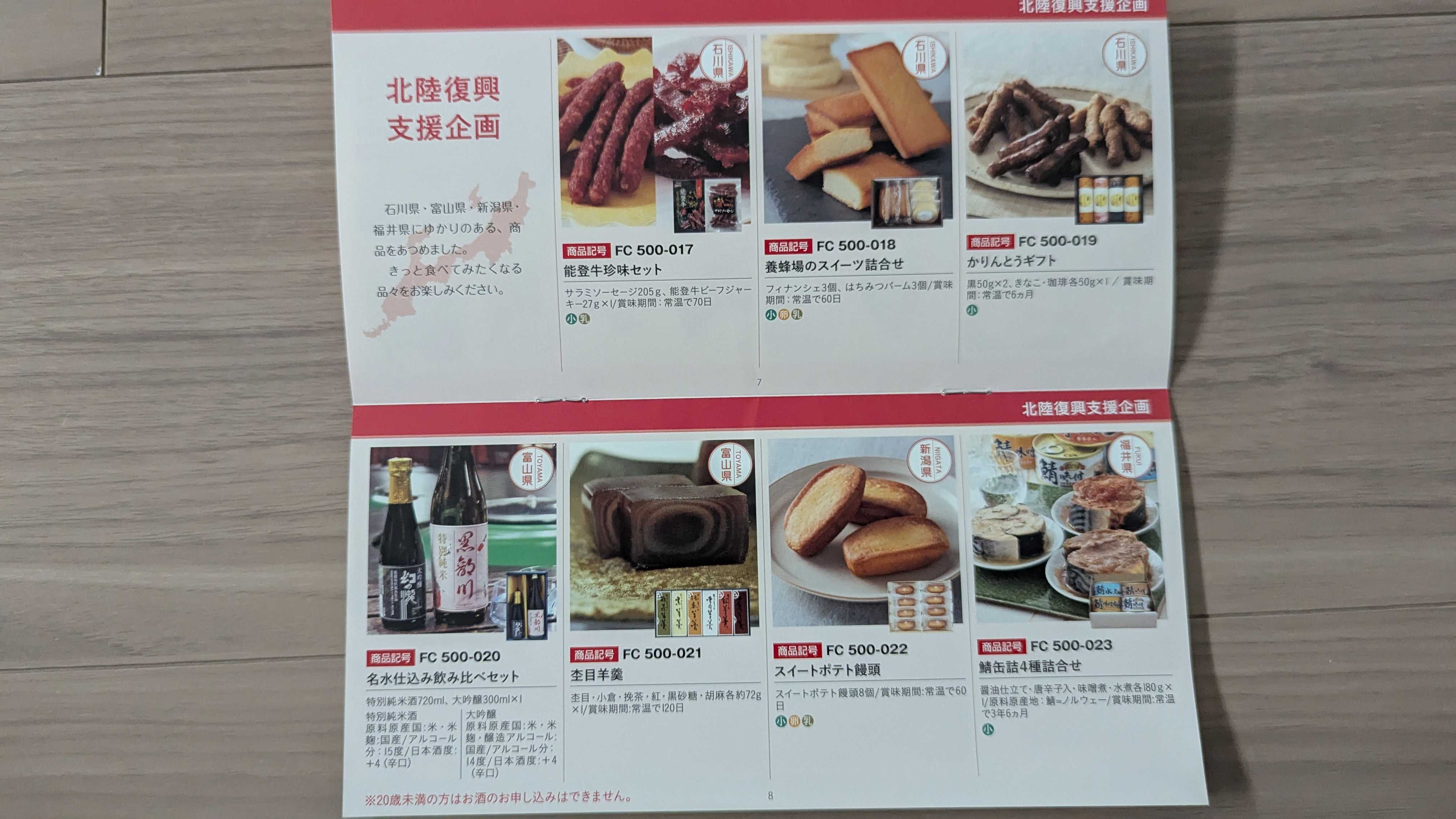 1952 新日本空調 今回紹介するのは空調工事の設計、施工管理を行う新日本空調です。 3月優待 2024/7/25時点の株価は2639円、予想配当利回り3.03%(80円)です。 今期予想PERは13.5、PBRは1.72です。 権利月は3,9月になります。 3月の優待内容は 300株以上保有で3000円相当のカタログギフト になります。 実際に届いたものが以下になります。 ![]() 中身を見てみると、東北復興支援や北陸復興支援ということで名産が沢山のっています。 ![]() ![]()