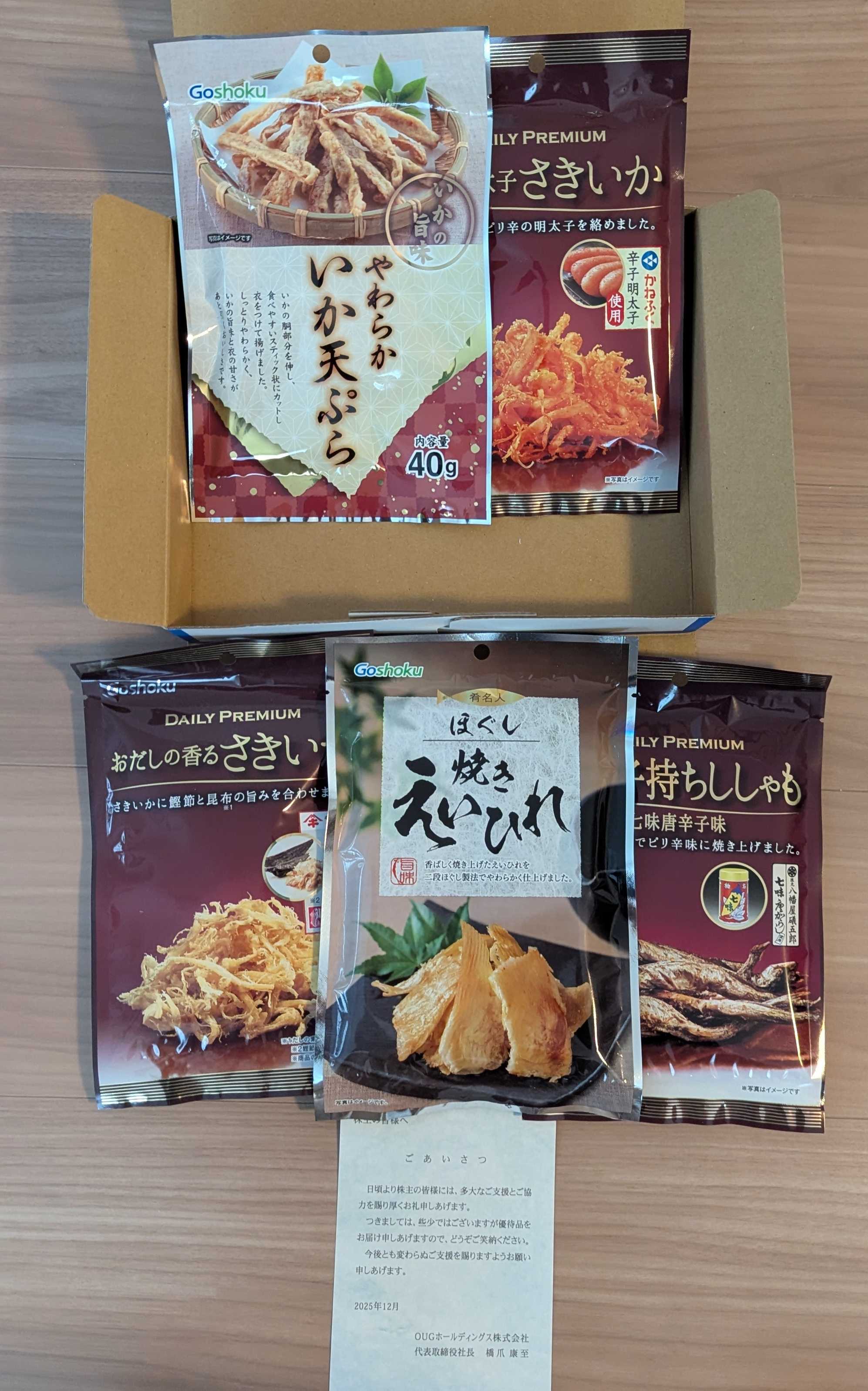 私は100株3年未満ですので、2500円相当になります。 実際に届いたものが以下になります。 ![]() 大体お正月の時期に届くので、お神酒の日本酒に合いそうなものばかりです。 私も日本酒に合わせていただきました。 少し味が濃いものが多いので、お酒が進みまました。大変美味しかったです。 こういうものがいただけるのはありがたいですね。 さてOUGホールディングスですが、大阪を中心に水産卸売業を中心に水産関係の事業を展開しています。 具体的には養殖、食品加工、水産物に関する物流事業などです。