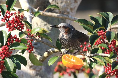そのうちに、二手に分かれて枝に刺していたミカンをつっつき始めました。待っていたお客さんはメジロですが、ヒヨドリを恐れてチューイ、チューィという鳴き声さえ聞こえません。