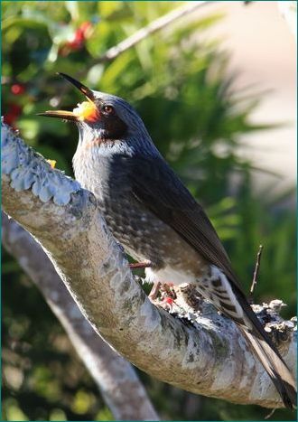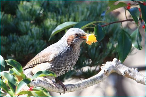 どう猛で大食漢 今日も好天気です。先日に続いてのヒヨドリです。今回は前回よりも長いレンズで撮ってみました。(写真はトリミングしています) 見通しの良いこんな日には小さな鳥はどっかに隠れているのでしょうか。すっかりメジロの鳴き声は聞こえなくなりました。ねらいはメジロなんですがサッパリ姿を見せません。