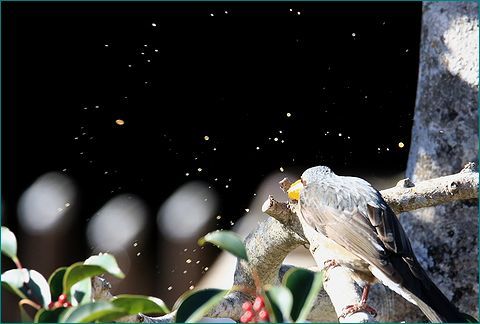 ミカンの水分が飛び散っているのが判ります。相手(エサ)を弱らせようとする本能なのでしょうか。それとも、水分が多いために揺さぶって飛ばしているのでしょうか。