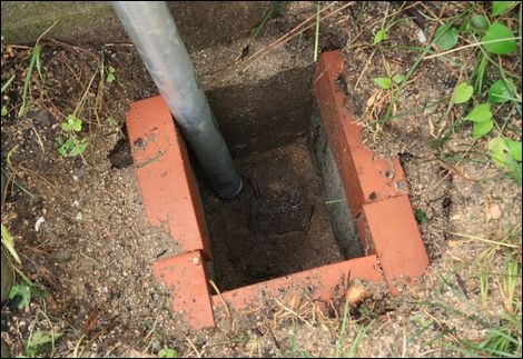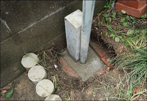 アンテナの再工事 ダイポールアンテナはこれまでと少し向きを変え、ほぼ東西に張ることにした。裏庭と玄関わきの2か所にポール用の支柱を建てコンクリートで固定した。しかし、この時の2本は中心部からの距離が不足して使えないことがわかった。 「玄関わきの支柱」 結局は上の写真の支柱は使わず、門のわきに更にもう一本建てて、屋根馬の位置を西に3mほどずらして、裏庭の支柱と門のわきの支柱の2本でダイポールアンテナを支えることにした。そうして完成したアンテナが、6月23日の記事と写真で紹介したものである。 しかし、よく見てみると、この状態では2本の支柱の位置と屋根馬上の支柱の位置が直線上にない。この状態でダイポールアンテナの銅線にテンションをかけると、屋根馬の支柱に南方向の力が加わり、悪くすればアンテナが南側に倒れる危険がある。 相談できるエンジニアがいないので、自分でじっくり検討した結果、最初に施工した裏庭側の支柱も廃棄せざるを得ないという結論に達した。そして、裏庭の既設のポールの位置より2.5mほど北側に新たに支柱を建てることにした。 「支柱の位置きめと穴掘り」 ことは急を要する。台風が来る前に新しい支柱を使える状態にしなければならない。6月30日夕方にコンクリート打ちを完成させようと思ったが、雨になり工事を断念した。翌7月1日、普通よりも早起きして、8時から工事を開始して、10時半に完成した。 「予定した作業の終わり」 これで4本目の支柱建てである。今までに建てた2本の支柱は無駄になるけど仕方がない。今回接近している台風が、このアンテナの強度を試す試金石である。そのためには、万全の状態にアンテナをしておく必要がある。 「裏庭の当初の支柱と新たな支柱」 材料的には、工事現場の足場用の48mmのスチール管がアンテナポールの支柱として有効であった。長さは穴の深さによって選べるが、基本的には1.5mか2mものを使った。できるだけ高さを稼ぐため、最終回の今回はコンクリート製の10cm角の境界杭を使った。