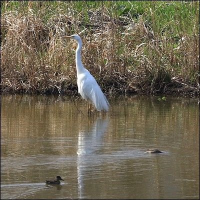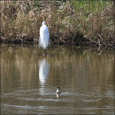 エサを横取り ダイサギはゆっくりしたモーションでエサを探しているようですが、なかなか上手くいきません。姿が大きいので、獲物から気付かれる確率が高いのでしょう。 「そこに乱入者が」 ダイサギが後ろを振り向きました。すると目を離したすきに、小さなくちばしで、器用に獲物を捕らえました。 「小さな体の大食漢」 今度は2羽が一緒に乱入してきました。このようなシーンにはダイサギもすっかり慣れているようで、追い払おうなんてしません。 「今度は2羽一緒に乱入」 ダイサギも時おり水の中に長いくちばしを入れています。でも、何かをゲットした様子はありません。大きな体を維持するためには大量のエサが必要なはずです。 小一時間観察しましたがダイサギはエサにありつけませんでした。どうやらここはダイサギにとっては休養の地で、えさ場は別の場所にあるのでしょう。 この湿地に住みついているカモ、目のまわりが緑色、頭部が茶色になっているところからするとどうやら「コガモ」のようです。