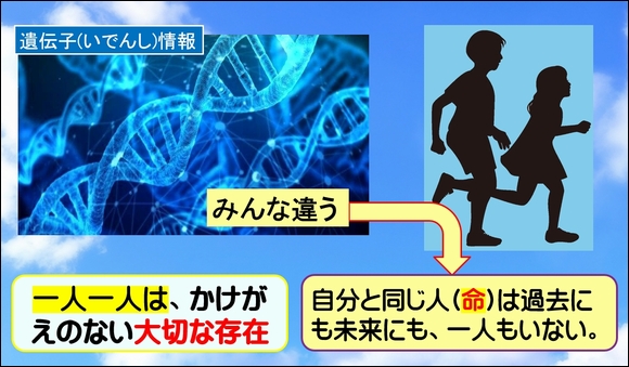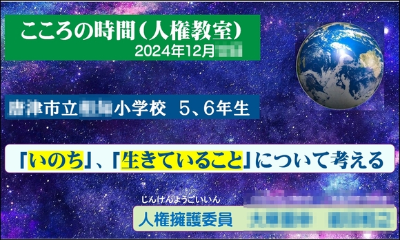 法務省は「人権教室」という言葉を使う。この「人権教室」という言葉は、役所(政府)が使う「上から目線」の言葉だ。明治維新以降、国家とか国民(臣民)という概念が生まれ、日本は近代国家をめざす歩みを始めた。 明治新政府は西欧列強に追いつき追い越すため「富国強兵」の実現を目指した。だから、大日本帝国憲法下では、「国民を教育する」という意識から脱却できなかった。そして戦後になって新憲法のもとでも「お役所目線」は変わっていない。 「主権者教育」という言葉こそ、お役所の「上から目線」を表した言葉はない。文科省の役人が考えだろうが、「主権者を教育しよう」など不遜極まりない。 「こころの時間」 ![]() 私は、人権は「上から目線で教えるものではない」と思う。だから、人権教室ではなく「こころの教室」と呼ぶ。できるだけ「子どもの目線」で身近な問題を考えさせ、行動に移すための「心の栄養」を与えることを大事にしている。 冒頭で子どもたちに、「今日はどんな答えでも、正解とか間違いということはありません。いろんな考えがあることが当たり前なのです」と告げる。まずは、子どもたちを聴くだけの受け身の姿勢から、主体的に考え発言する姿勢に変えたい。 「かけがえのない自分(いのち)」 小学5,6年生の子どもたちにとって、「いのち」とか「生きることの意味」を考えさせるのは無駄なことではない。普段あまりこのようなことについて考えることが無いからこそ、立ち止まって考えさせたいと思う。 「命は継がれてゆく」 ![]() 現生人類になって20万年、その中で命は継がれてきた。そして、自分と全く同じ人間は現在でも過去でも未来でも二度と表れない。だからこそ、いのちはかけがえのない大切なもの。このことを「いのちの歌」(作詞 竹内まりや」の歌詞を考えさせながら伝えていった。 「人権という言葉は最後に出す」 ![]() 感想文には、模範解答的な言葉が並んでいたが、「こころの時間」の中でいくつかの発問を投げかけたが、そのなかにいくつかの光る言葉があった。いつも、子どもたちの中から出てくるこの素朴な発言の中に、はっとさせられる言葉がある。 そんなとき、自分は「子ども目線に立ち得ていない」のだなと思う。この一期一会の時間は、自分が生きているからこそもらえる「大切な宝物」なのだ。 ↓ランキングに参加しています。よかったらクリックして下さい。 写真日記ランキング お気に入りの記事を「いいね!」で応援しよう