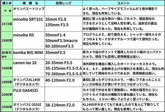 カメラ放浪記、現在の主力機はSONY製 最初に買った一眼レフカメラはミノルタSRT-101だった。開放測光が出来て、ペンタックスなどの一歩先を行った最新機だった。 ![]() (左は兄から譲ってもらったハーフサイズの OLYMPUS TRIP) 新製品が出るたびにカメラは買い替えてきた。2000年までに買ったカメラは次の表のようになる。それぞれに思い出深いものだ。しかし、この表は2000年現在のもので、21世紀も4分の1が過ぎた今、一つも手元には残っていない。 ![]() (2000年現在) 1995年にWindows95が出てパソコンの世界は一変し、インターネットが一気に普及した。カメラの世界でもデジタル化が急ピッチで進んだ。EOS 10 はまだフィルムカメラだった。最初に買ったデジタルカメラはOLYMPUSだった。 ![]() 上の写真は2015年から16年にかけての地球一周南回りの船旅で持ち出したカメラだ。キャノンのボデイが2台とズームレンズが3本。しかし、これらは今はもう手元にない。 2023年までに2年間ほどかけて全部SONY製に入れ替えた。SONYはミラーレス化をいち早く進め、交換レンズも豊富だった。現在は別に OLYMPUS のボディ2台とレンズを2本もあるが使用頻度は少ない。 しかしそろそろ断捨離しようと思う。まずカメラとレンズからかな。 ↓ランキングに参加しています。下のアイコンをクリックして下さい。 写真日記ランキング