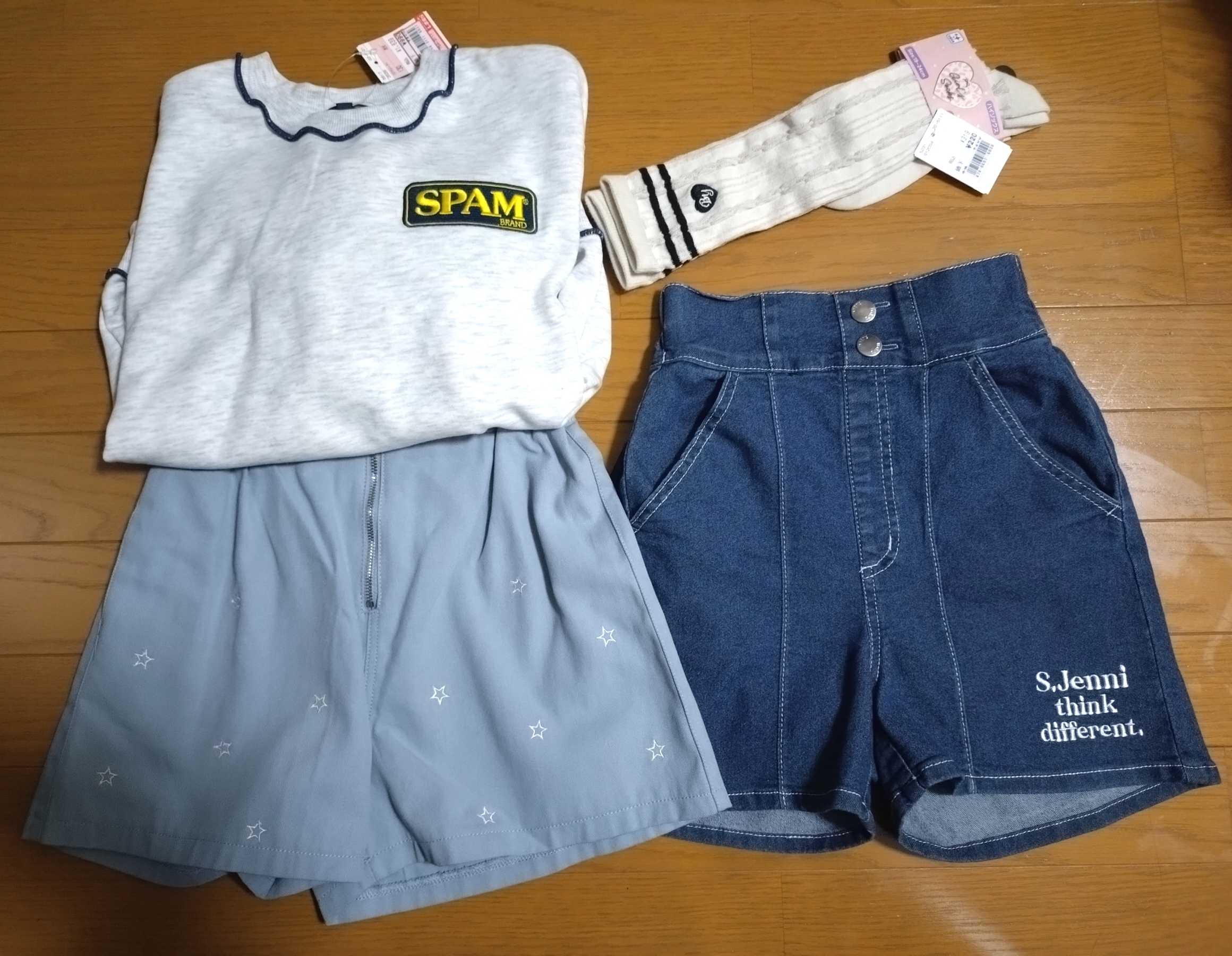 ほぼリアルタイム投稿です.久しぶりに、しまむらに服を見る目的で、そのために行きました。用事のついでとか、予約のシールの引き取りとかではなく、純粋に服を見に。長女の春服です。いよいよ4月から4年生。ただでさえ早生まれなのに、更に同じ月齢の中でも小さめな子でしたが、いよいよモノによっては140でも違和感なく着れるようになりました。次女と違ってお下がりは回って来ないので、買わないと増えない長女服。取り急ぎ春休み中に私服で行く学童に良さそうなのはないかな〜と。本日の購入品はこちらです。SPAMトレーナー 130 税込990円ハイソックス 20-24cm 税込220円星刺繍ショーパン 150 税込990円ジェニィショーパン 140 税込1320円SPAMのトレーナーは私が一目惚れ。でも絶対長女も好きなやつだと思いました。前面はシンプルですが、背面のスパム缶やハンバーガーのデザインが可愛い過ぎる。スパム(減塩)SPAM ポークランチョンミート 340g×6缶セット,, /沖縄/お土産/おみやげ/土産/ご当地グルメ/スパムおにぎり/豚肉/加工品/缶詰/沖縄食材/業務用/沖縄/食品/珍味/酒のつまみ/お酒の肴/おつまみ/イベント/お祭り/景品/プレゼント/ギフト/SPAMスパム キッズTシャツ(缶詰 in okinawa) /スパム缶 沖縄 Tシャツ【M便】ワッペン スパム 缶 SPAM CAN ミニ MW180 ワッペン アイロン ブランド 通販 アップリケ ブレザー シャツ エンブレム アルファベット イニシャル ミリタリー カンパニー 名前 キャラクター SSSちなみに長女、スパム大好きです。たまにしか食卓に出しませんが、めちゃめちゃ食べます。ボトムスが不足してたので、2着買いました。こちらは150でしたが、後に紹介する140のボトムスと平置きで比べて殆ど差がなかったので買ってみました。星刺繍のショーパンです。女童 キッズ 女の子 夏 春夏 牛仔 デニム ショートパンツ 短パン かわいい 甘め スイート スタイル 休日 バカンス 百搭 合わせやすい 復古 レトロ スリム 細見え 星 プリント 刺繍 綿 コットン 柔らかい 酵素加工 洗い加工 中腰 ボタン ジッこちらはジェニィのショーパン。スパムのトレーナーと同じ色味だから、早速この組み合わせで着せたい。☆70%OFF以下☆SISTER JENNI(シスタージェニィ)デニムサス付きワイドパンツ 89103_春夏ハイソックスは制服に合わせる用ですが、不足してたのでありがたい。長女服、もう少し買い足したいな。140になると、キッズではなくジュニアになるのね。140だとしまむらみたいな売り場だと、次女とお揃い服見つけるの難しい。売り場がまだ慣れなくて見にくくて、しかもモノによってはまだ130の方がいいし、キッズとジュニアを行ったり来たり。140になると、服の系統も一気に変わりますよね。まだ、手探り中です。