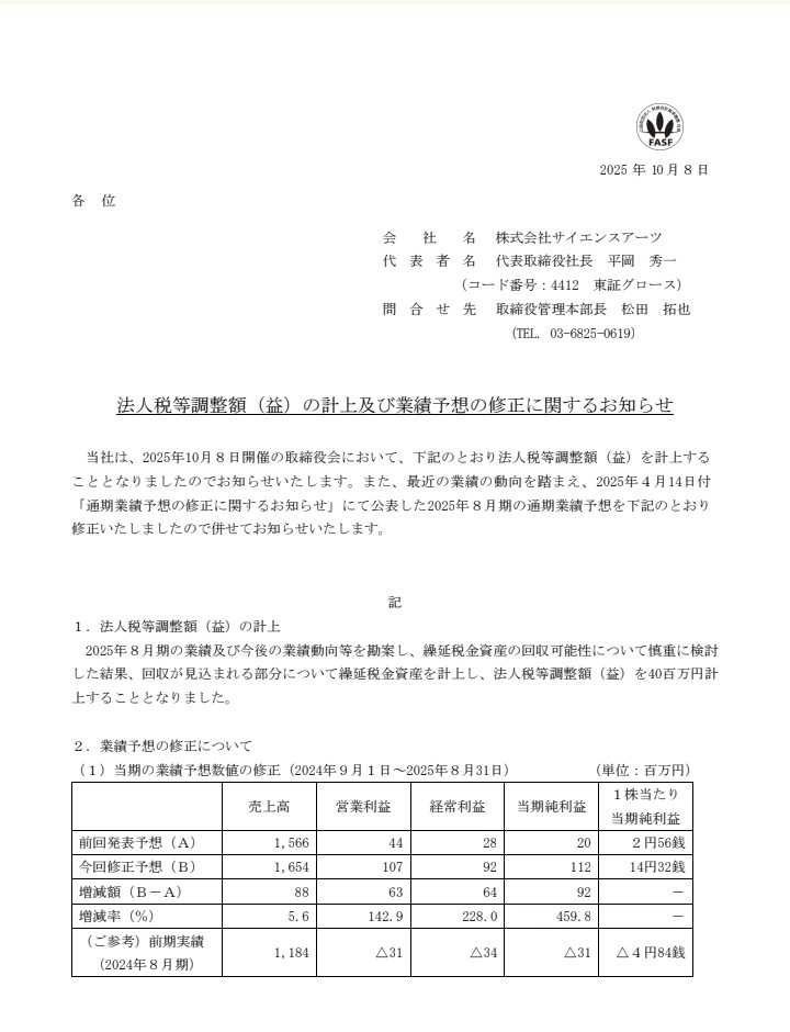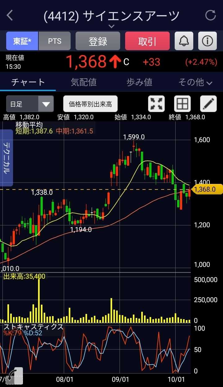 ⬇10月8日の株式新聞の記事を一部引用しています⬇ ⬇サイエンスアーツのHPより一部引用しています⬇ こんにちは😊 本日の投資結果どうだったですか? 僕の日本株資産は、0.14%の増加、 米国株資産は、0.45%の減少で株式資産は減少した😵 本日、サイエンスアーツがIRにて、 「法人税等調整額(益)の計上及び業績予想 の修正に関するお知らせ」を発表している。 繰延税金資産を計上することと、 Baddycomの利用社数増が順調ということなのだ。 今日も?の「繰延税金資産を計上する」 とは何なのか、調べてみるとイメージができる😌 僕の理解では、つまり…… 将来的には業績が拡大するということであろう😜 僕の中長期的投資法のひとつ、 業績の拡大が予想される企業の株を保有し続ける。 時間はかかるが、何倍にもなることがあり、 そんな銘柄がいくつかあると資産は増えやすいか。 さて、明日の株価はどうなるかな? 最近は調整気味だったので、良い刺激になるかも😉 本日もお読みいただきありがとうございます。 ✳✳投資は、自己責任でお願いします✳✳ ⬇明日のサイエンスアーツの株価に期待したい😜⬇ ☆米国株の情報なら 米国株四半期速報2025年秋号 [ 亜州リサーチ株式会社 ] ☆中国株の情報なら 中国株二季報2025年夏秋号 [ DZHフィナンシャルリサーチ ] ☆スマホ対応ドアホンなら レビュー特典&P15倍【日本メーカー製スマートドアホン★スマホでドアホン】インターホン ワイヤレス カメラ付き 工事不要 連動 録画 防犯カメラ付き 屋外 通話 暗視 玄関 wifi対応 呼び出しチャイム バッテリー 充電式 配線不要 電源不要 賃貸 子機付き MI73(A) MI75 MJ75 ☆アセチルLカルニチンなら アセチル-Lカルニチン 500mg ベジカプセル 200粒 ナウフーズ ナウ ビタミン びたみん サプリ サプリメント アミノ酸 アセチルL-カルニチン【Now Foods Acetyl L-Carnitine 500mg, 200 Veg Capsules】 ☆有機桑茶なら 【総合1位★クーポンで2,640円】( 有機 桑茶 100包 ) 桑の葉茶 桑茶 有機JAS 送料無料 わくわく園 おいしい 桑 桑の葉オーガニック お茶 健康 対策 制限 ノンカフェイン 国産 ティーバッグ くわ 温活 桑葉 有機桑茶 ギフト