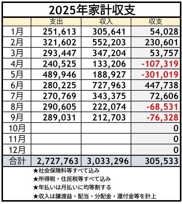 ⬇9月の家計収支は、約76千円の赤字になった😓⬇ ⬇年間収支では、9月までで約30万円の黒字を維持⬇ ⬇2024年から、労働収入と投資で家計を改善した⬇ ⬇家計改善の効果もあり、金融資産の減少が止まる⬇ こんにちは😊 祝日、いかがお過ごしでしょうか? 9月が終わり、しばらく経ったが、 9月までの家計収支を確認してみることにする。 9月は収入が約21万円に留まったことにより赤字、 ただ、年間収支では黒字を維持しているのでOKだ。 早期退職後の家計収支は、約645万円の大赤字、 これを黒字化するには、投資で儲けるしかないか😜 会社員を辞めてから、家計簿を付け始め、 何にいくらかけているのかを確認することにした。 月間の家計の収支が明らかになり、 年間の家計収支が大赤字であることを知り、 このままでは、老後生活資金が枯渇すると思い、 コロナ禍が落ち着いた頃から、パートを始めたのだ。 少ない資産で退職した者が、 だんだん家計が苦しくなるという流れで、 また働き始めるのは、心身に良い影響しかないね😊 今はそう思っている! ストレスの多かった会社員を辞めて、 衣食住とも人間らしい生活スタイルに改めて、 やってみたかった仕事を楽しくするだけで、 収入が少なくとも、プライドが湧いてくるんだよね😌 ちゃんと生きている! 心身のことを考える時間が増えれば、 自然と生体反応を感じで、良い影響が出始める😊 体は単純に出来ている! 心身のことを勉強すればするほど、 自分を思って行動すればするほど、 人生の方向性が、自分らしく定まってくるのだ😉 毎日が心地良くなる! もう数日で、妻が退院する🙌 この手術が大成功に終わるには、1年間程かかるが、 今回の手術によって、2人の関係性が強化され、 もっと一緒に生きていこう!と思えるようになった。 相手はどうかは知らんけど😜 本日もお読みいただきありがとうございます。 ✳✳投資は、自己責任でお願いします✳✳ ☆米国株の情報なら 米国株四半期速報2025年秋号 [ 亜州リサーチ株式会社 ] ☆中国株の情報なら 中国株二季報2025年夏秋号 [ DZHフィナンシャルリサーチ ] ☆スマホ対応ドアホンなら 【レビュー特典付★日本メーカー製スマートドアホン★スマホでドアホン】インターホン ワイヤレス カメラ付き 工事不要 連動 録画 防犯カメラ付き 屋外 通話 暗視 玄関 wifi対応 呼び出しチャイム バッテリー 充電式 配線不要 電源不要 賃貸 子機付き MI73(A) MI75 MJ75 ☆アセチルLカルニチンなら アセチル-Lカルニチン 500mg ベジカプセル 200粒 ナウフーズ ナウ ビタミン びたみん サプリ サプリメント アミノ酸 アセチルL-カルニチン【Now Foods Acetyl L-Carnitine 500mg, 200 Veg Capsules】 ☆有機桑茶なら 【総合1位★クーポンで2,640円】( 有機 桑茶 100包 ) 桑の葉茶 桑茶 有機JAS 送料無料 わくわく園 おいしい 桑 桑の葉オーガニック お茶 健康 対策 制限 ノンカフェイン 国産 ティーバッグ くわ 温活 桑葉 有機桑茶 ギフト