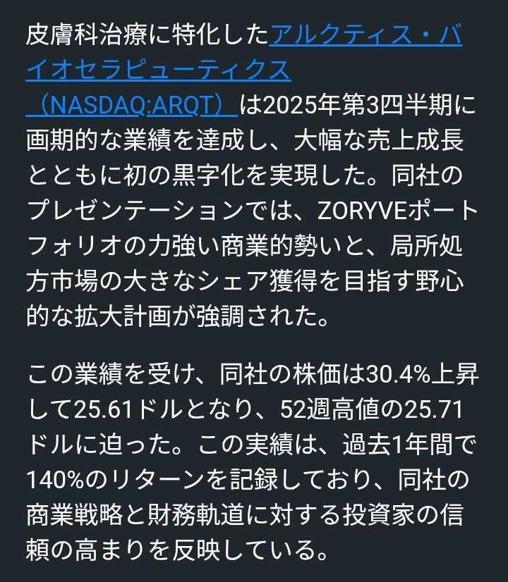 ⬇Investing.comの記事より一部引用しています⬇ こんにちは😊 本日の投資結果どうだったですか? 僕の日本株資産は、3.76%の減少、 米国株資産は、0.64%の増加で株式資産は減少した😵 昨夜は、NISAで保有するARQTが大幅上昇、 2025年第3四半期に、初の黒字化を実現したらしい。 業績予想では、2027年には黒字化見込みだが、 ひょっとしたら、少し早まる可能性が出てきたか😌 この銘柄も、赤字→黒字化→黒字拡大となれば、 株価は、確実に業績予想を織り込んでいくだろう。 また、本日はサイエンスアーツは大幅下落、 2日間大幅上昇した株価は、適度に下げて当然かも。 多少の株価変動は微動だにせず、何があっても、 中長期的に保有を続けるには、意思が必要になる😌 また、時には死んだふりをしないと、 最大20年近く同じ株を保有することなんて出来ない。 ただ、5年、10年、15年と保有し続ければ、 赤字企業が、大きく変容する姿に出合えたりもする。 それは、それで楽しく面白い😊 企業の営みのダイナミズムを感じられる。 成長曲線の意味を株式投資で学ぶことも出来る。 現在赤字→近々黒字化→将来黒字拡大となる こんな赤字企業を見つけるのが、案外楽しいし、 中長期的に、利益に繋がることが多いと感じている😉 本日もお読みいただきありがとうございます。 ✳✳投資は、自己責任でお願いします✳✳ ⬇サイエンスアーツが大幅下落😵急騰したからね⬇ ☆米国株の情報なら 米国株四半期速報2025年秋号 [ 亜州リサーチ株式会社 ] ☆中国株の情報なら 中国株二季報2025年夏秋号 [ DZHフィナンシャルリサーチ ] ☆スマホ対応ドアホンなら 【レビュー特典付★日本メーカー製スマートドアホン★スマホでドアホン】インターホン ワイヤレス 工事不要 連動 録画 防犯カメラ付き 屋外 通話 暗視 玄関 wifi対応 呼び出しチャイム インターフォン バッテリー 充電式 配線不要 電源不要 賃貸 子機付き MI73(A) MI75 MJ75 ☆アセチルLカルニチンなら アセチル-Lカルニチン 500mg ベジカプセル 200粒 ナウフーズ ナウ ビタミン びたみん サプリ サプリメント アミノ酸 アセチルL-カルニチン【Now Foods Acetyl L-Carnitine 500mg, 200 Veg Capsules】 ☆有機桑茶なら 【総合1位★クーポンで2,640円】( 有機 桑茶 100包 ) 桑の葉茶 桑茶 有機JAS 送料無料 わくわく園 おいしい 桑 桑の葉オーガニック お茶 健康 対策 制限 ノンカフェイン 国産 ティーバッグ くわ 温活 桑葉 有機桑茶 ギフト